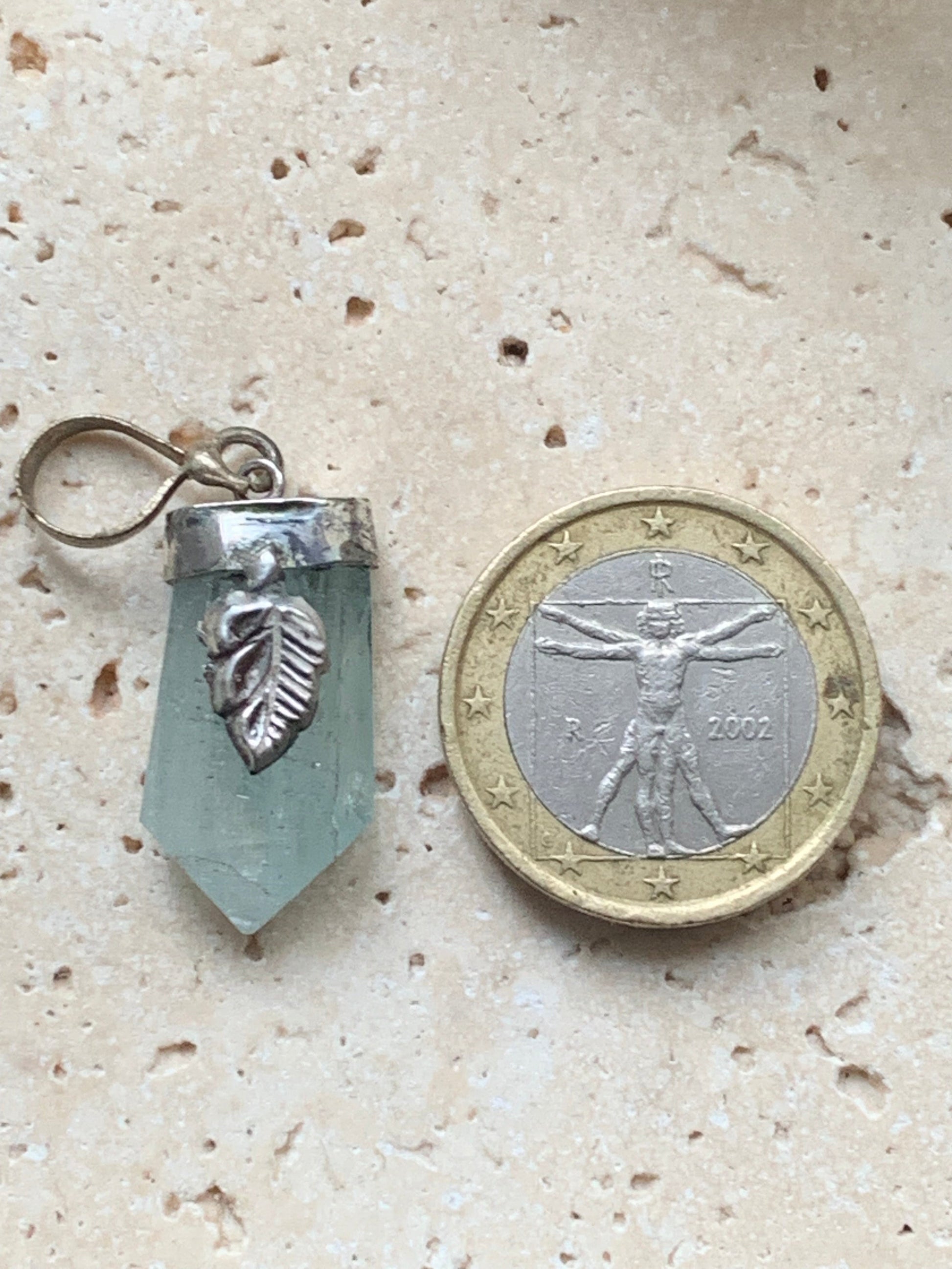 🔮 Apportez une touche d'élégance et d'originalité avec ce pendentif artisanal unique, mettant en valeur une sublime aigue-marine naturelle. La pierre est sertie sur une monture en argent, agrémentée de détails fantaisie en métal, pour un rendu à la fois brut et raffiné.