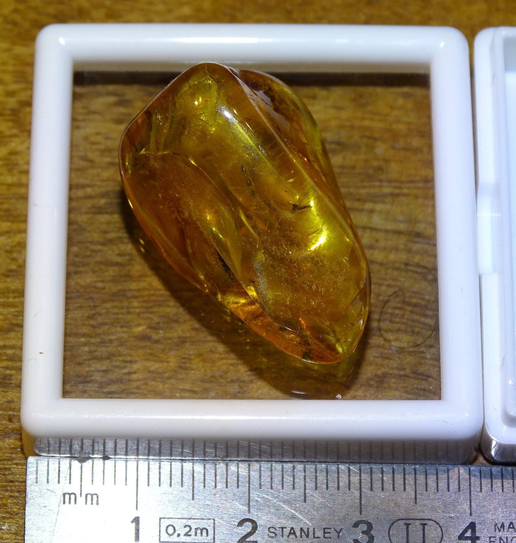 Ambre, spècimen de galet roulé avec insecte à l'intérieur, de 33x20x12 mm. Superbe pièce pour bijouterie ou collection !