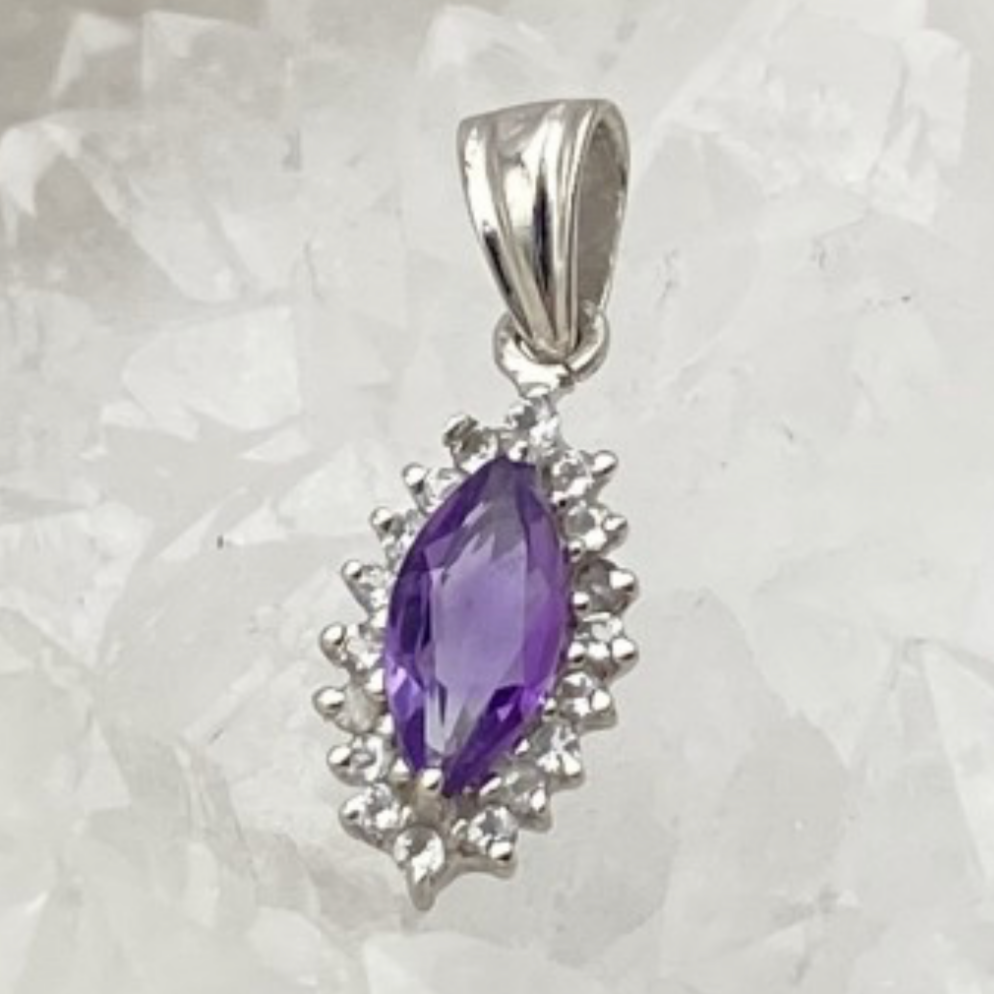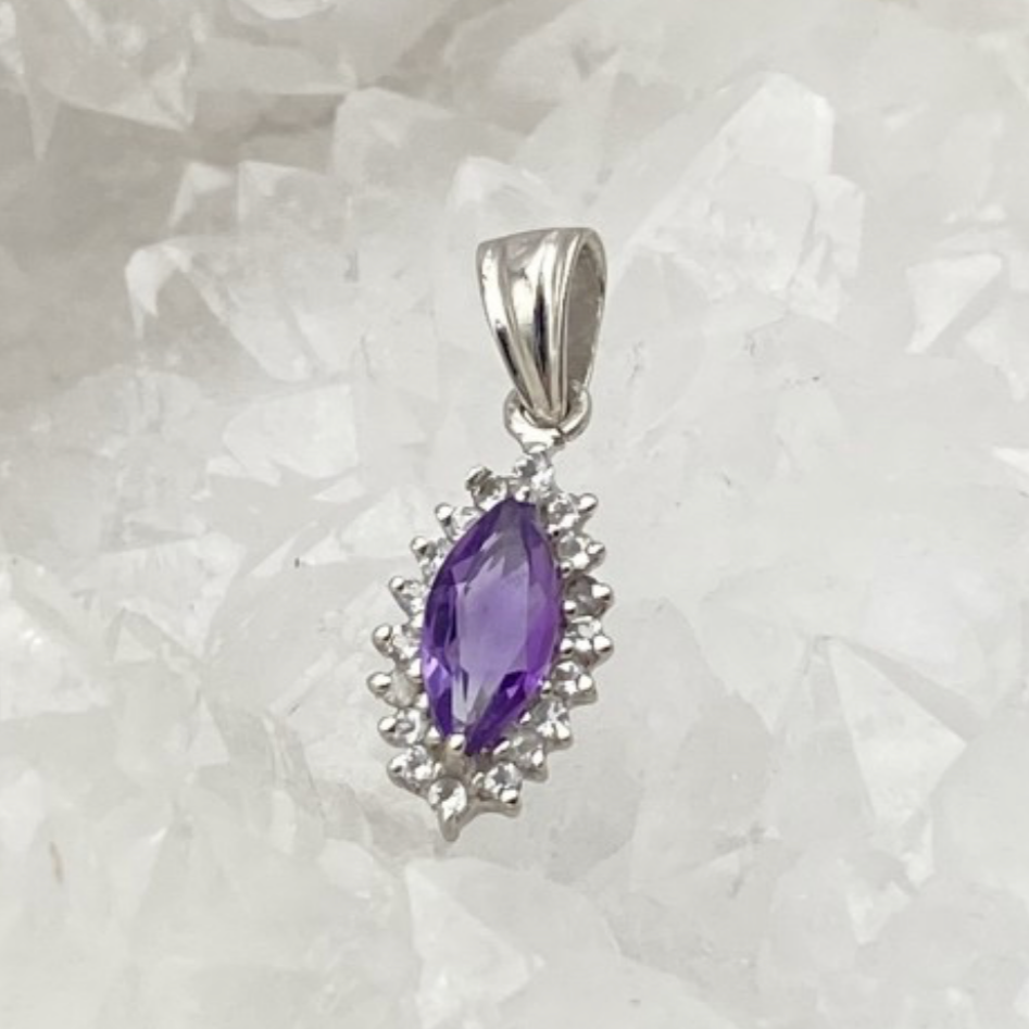 Améthyste | Collection Retro' | Pendentif en Argent serti d'une pierre gemme en forme de 'navette', entouré d'Oxyde, 19 x 7 mm !