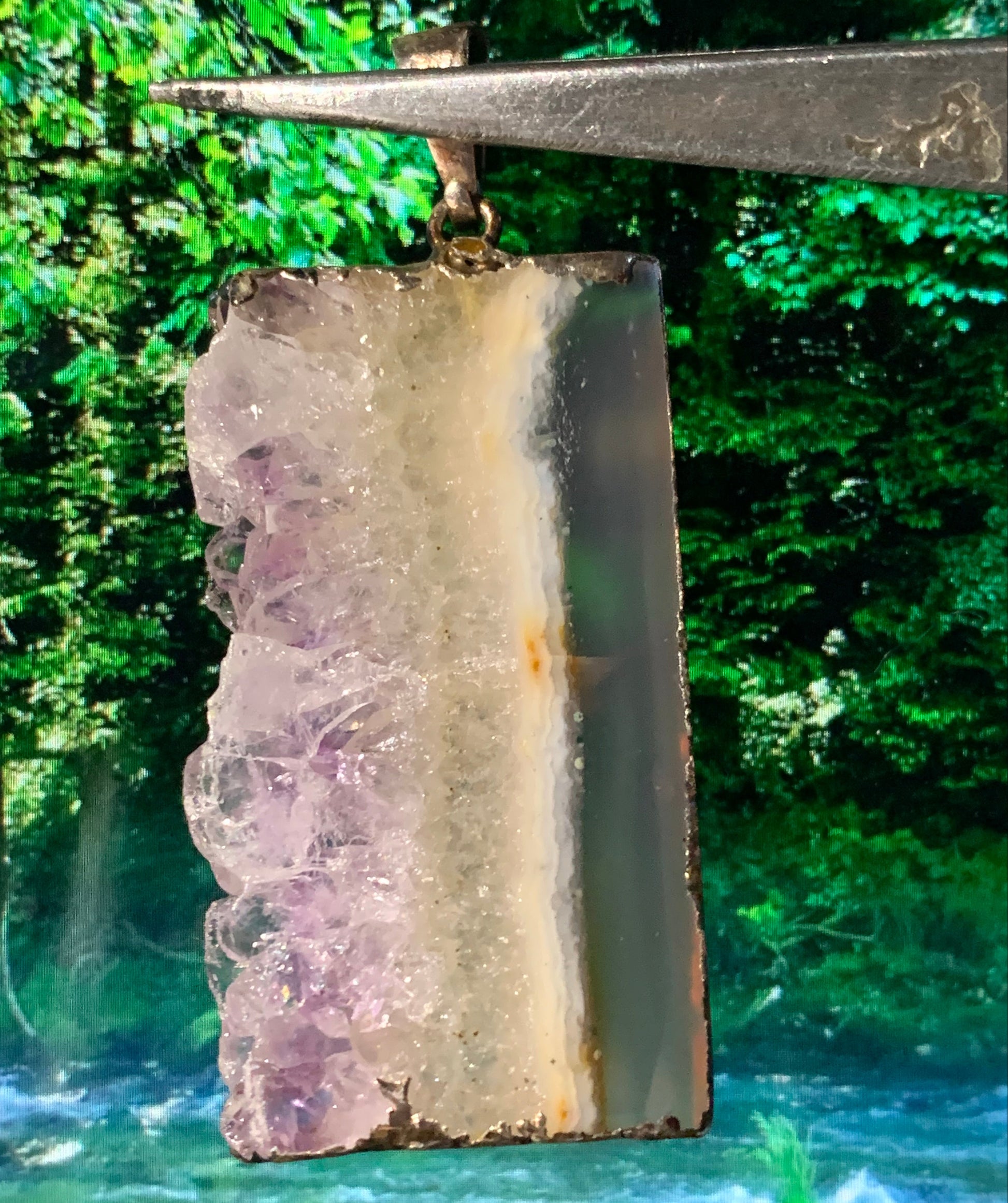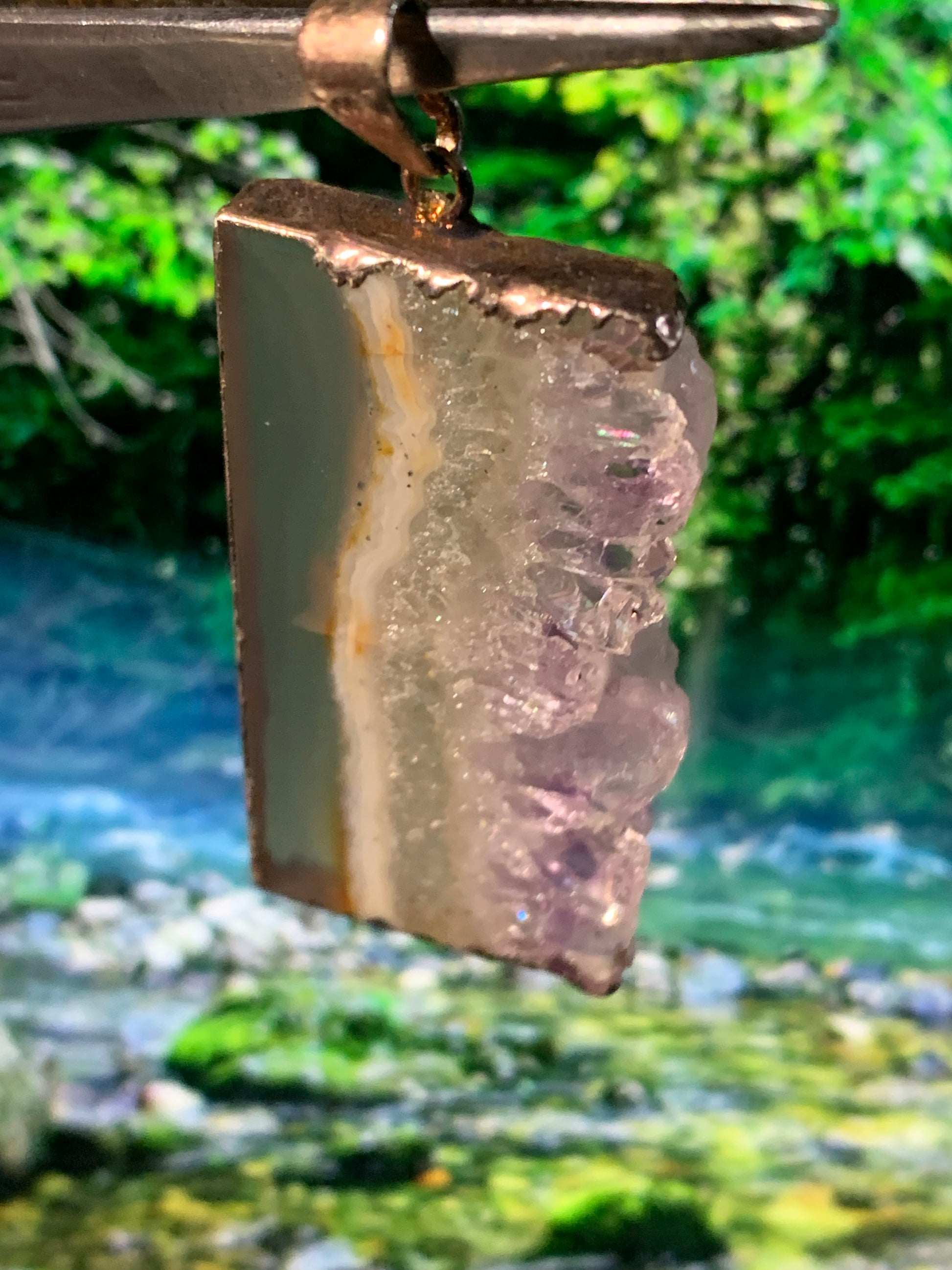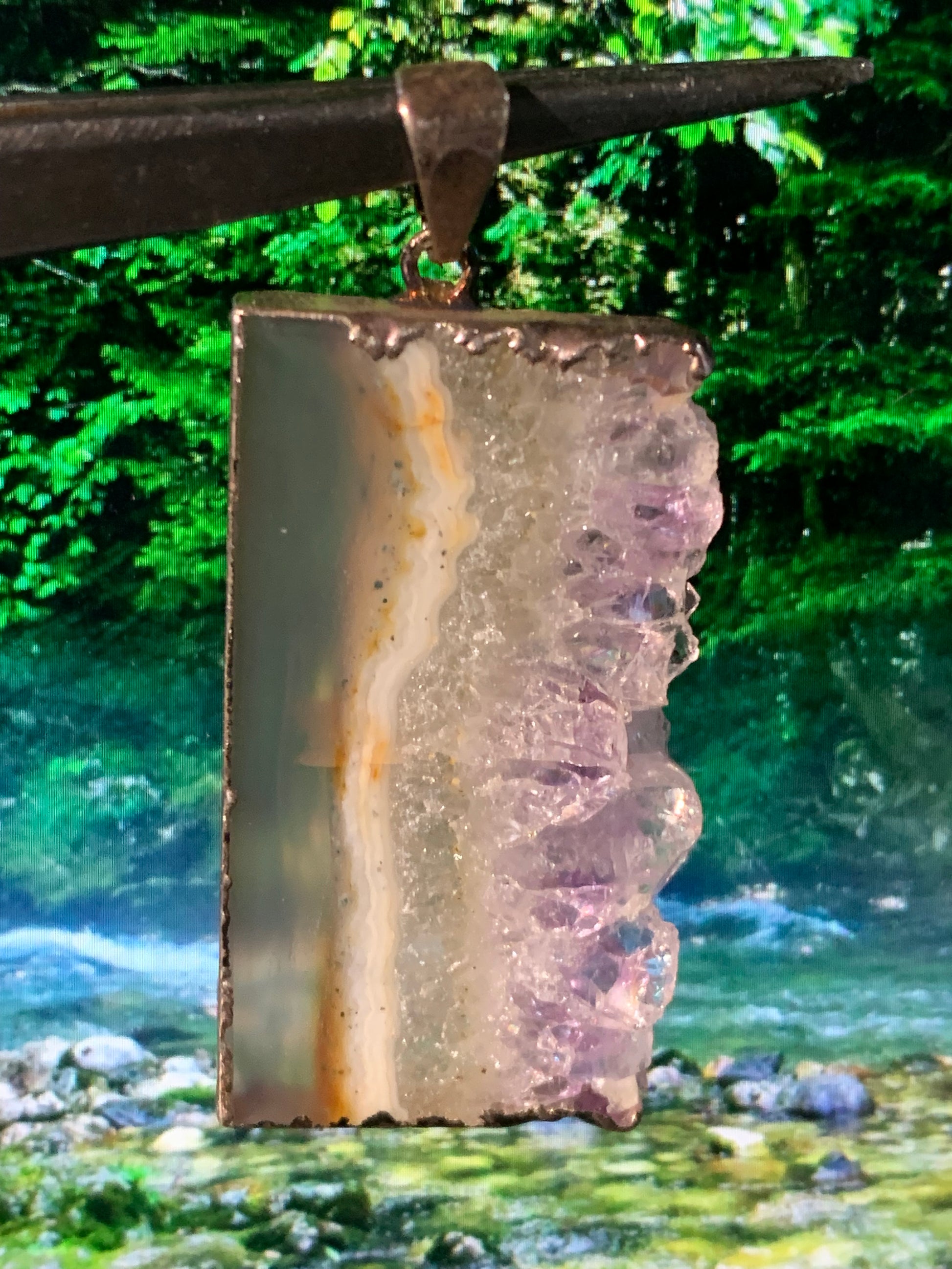 Améthyste, pendentif en 'tranche' de 40mm de hauteur x 23 de largeur x 6 d'épaisseur. Vendu avec cordon réglable de couleur noire offert !