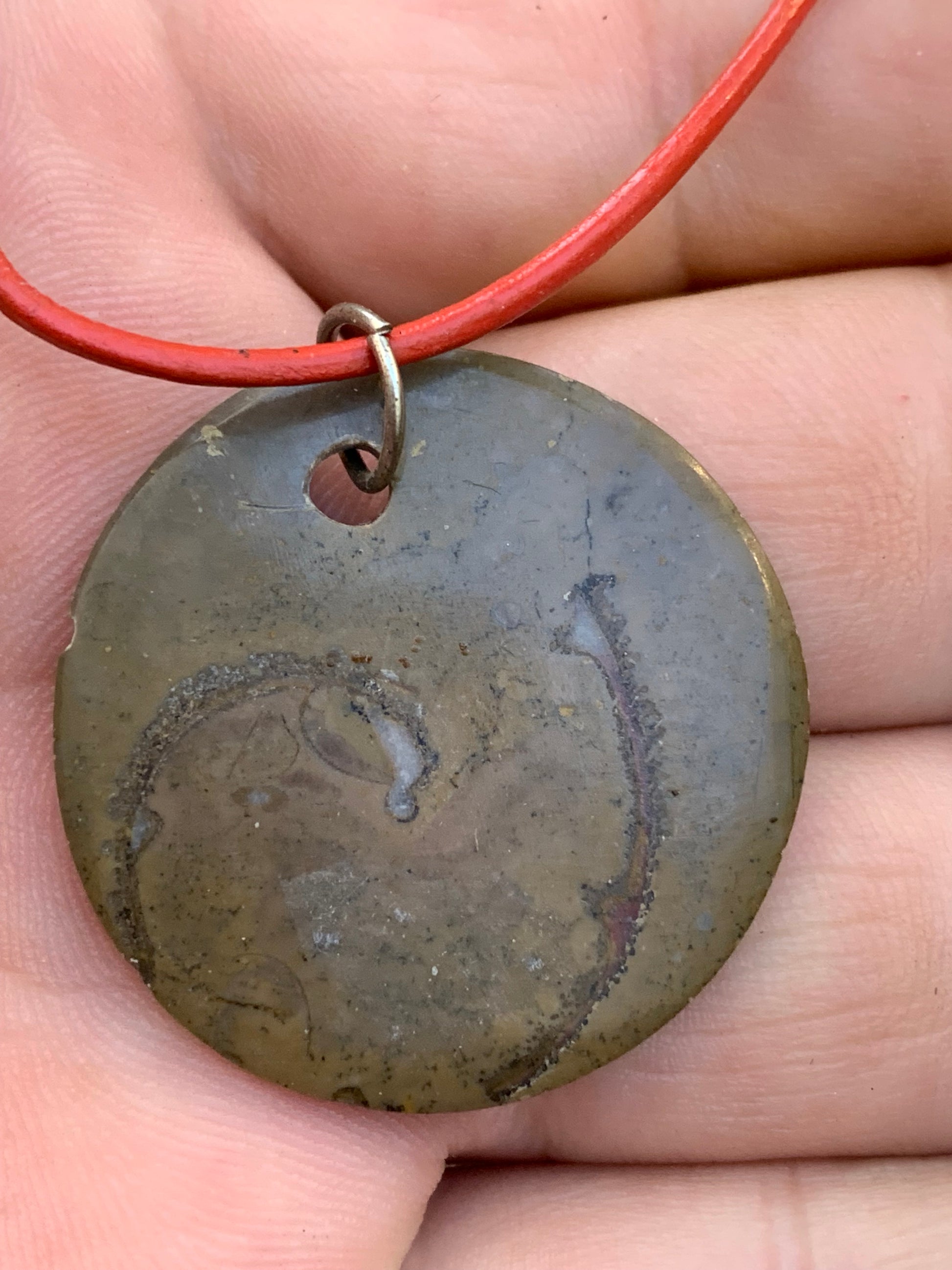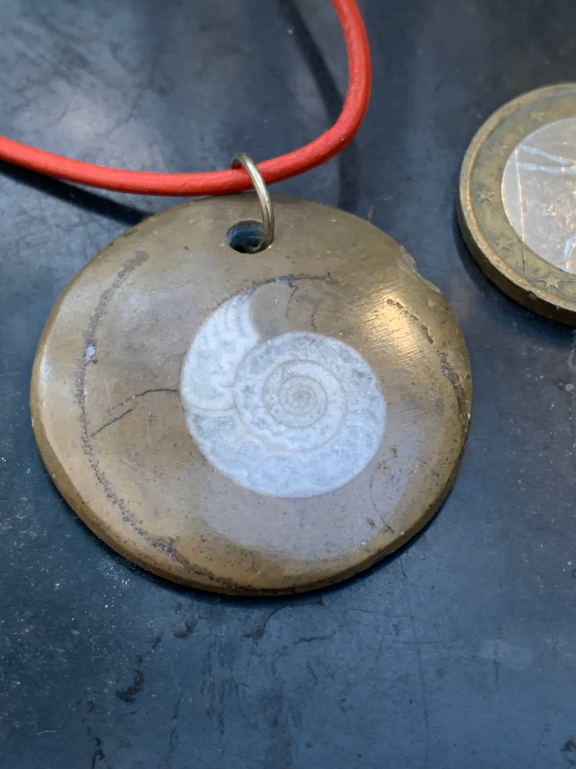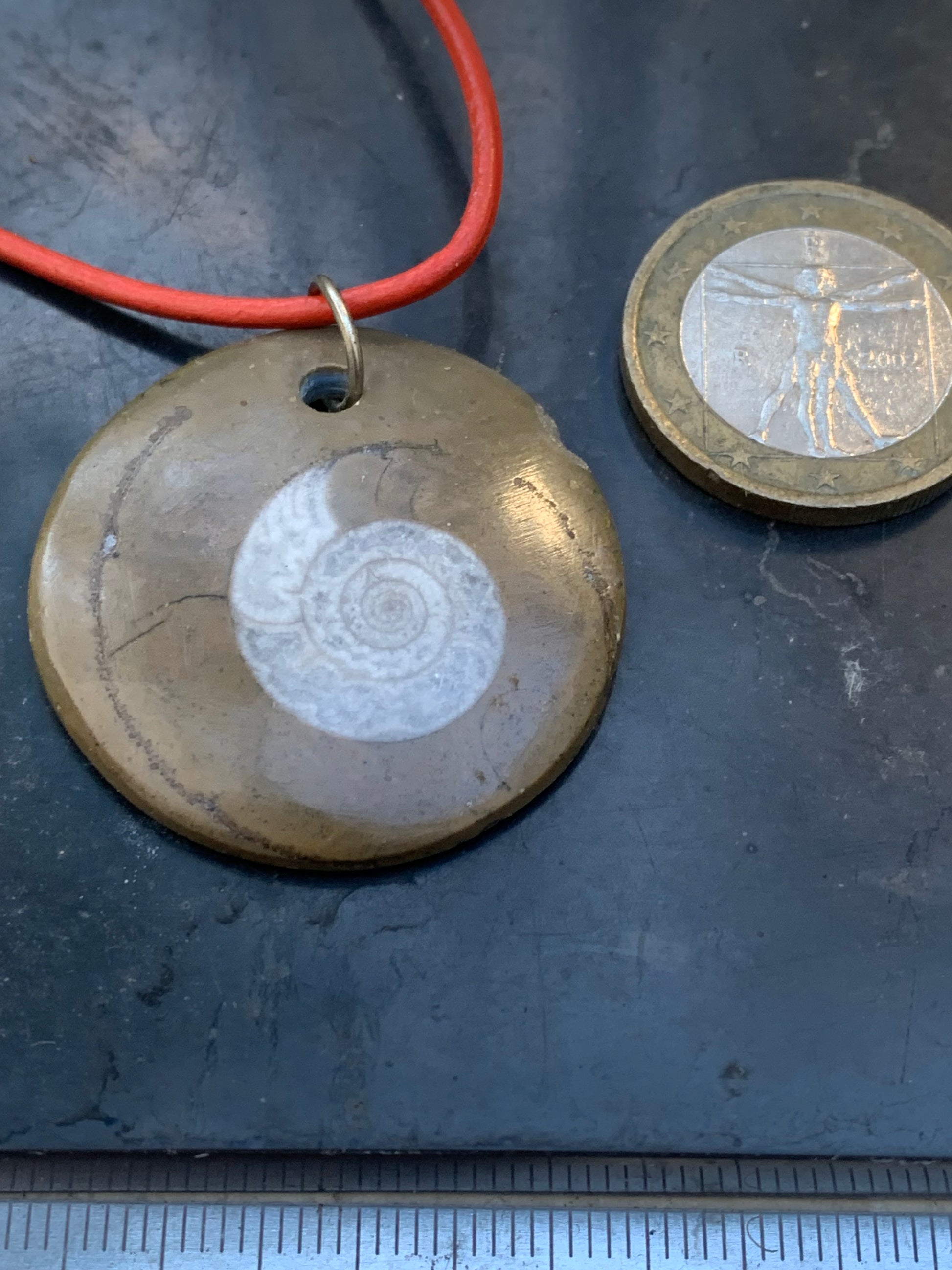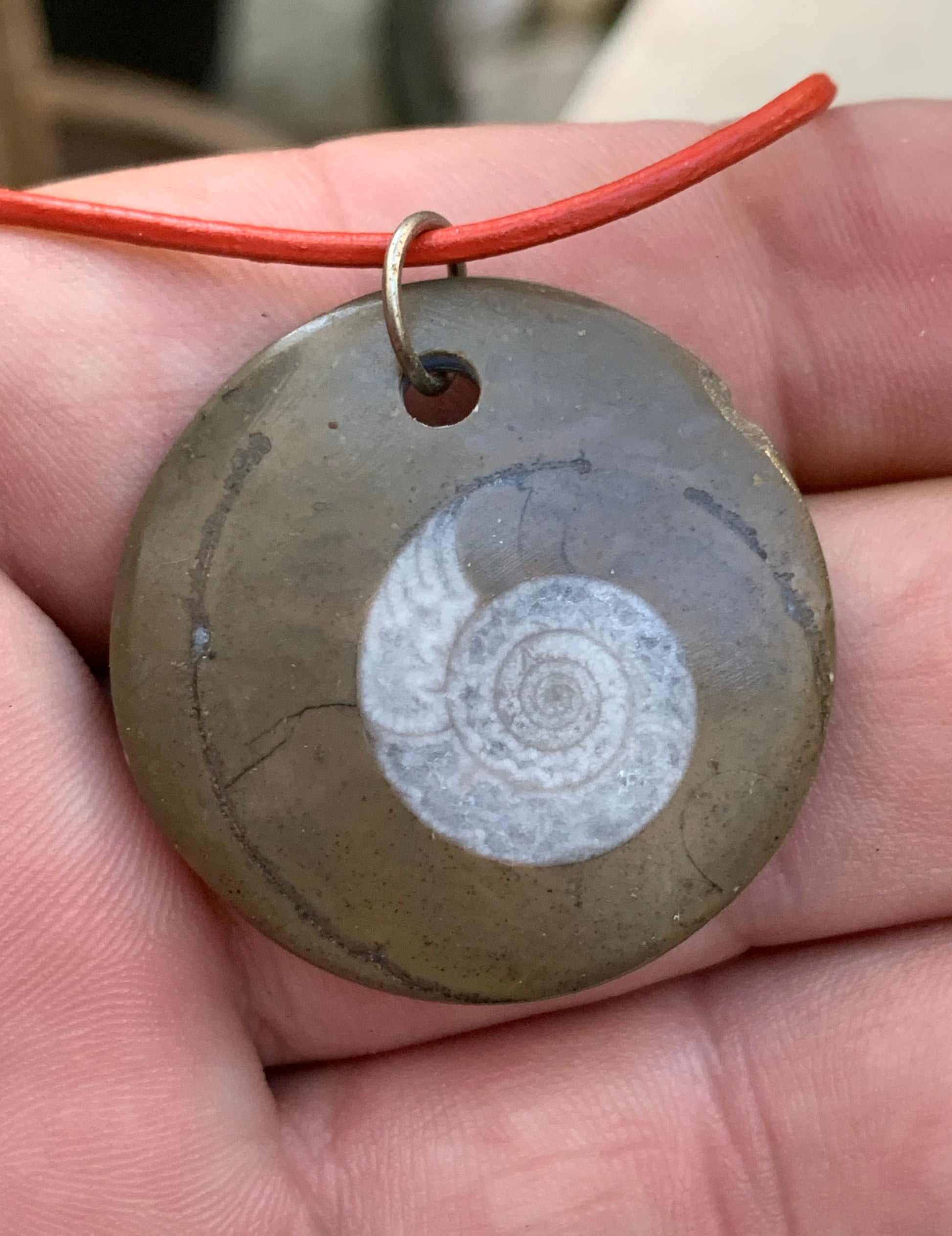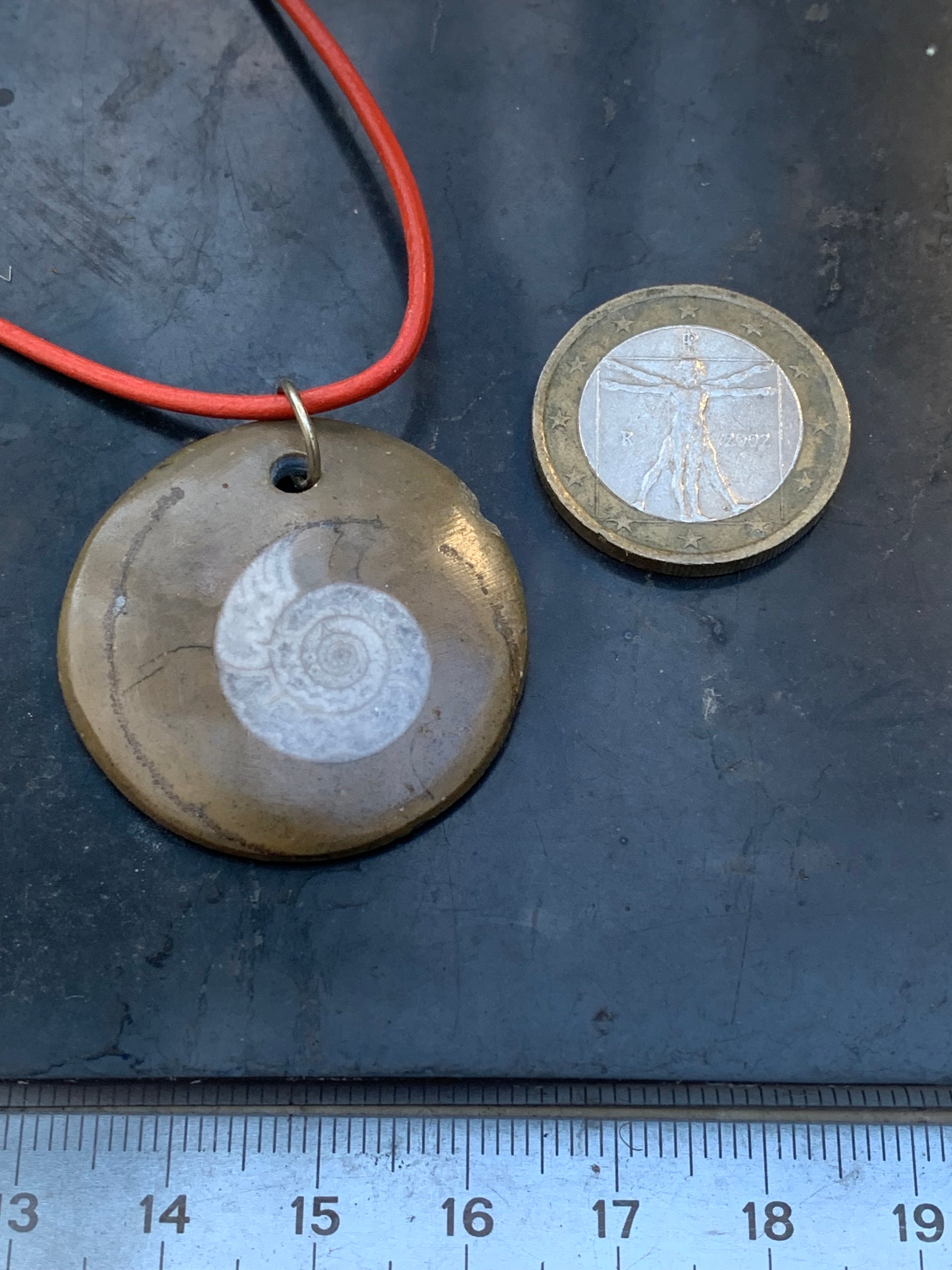 Ammonite fossile dans grès rouge (Usa), pendentif de 33 millimètres x 6. Vendu avec cordon noir et réglable de 60 cm !