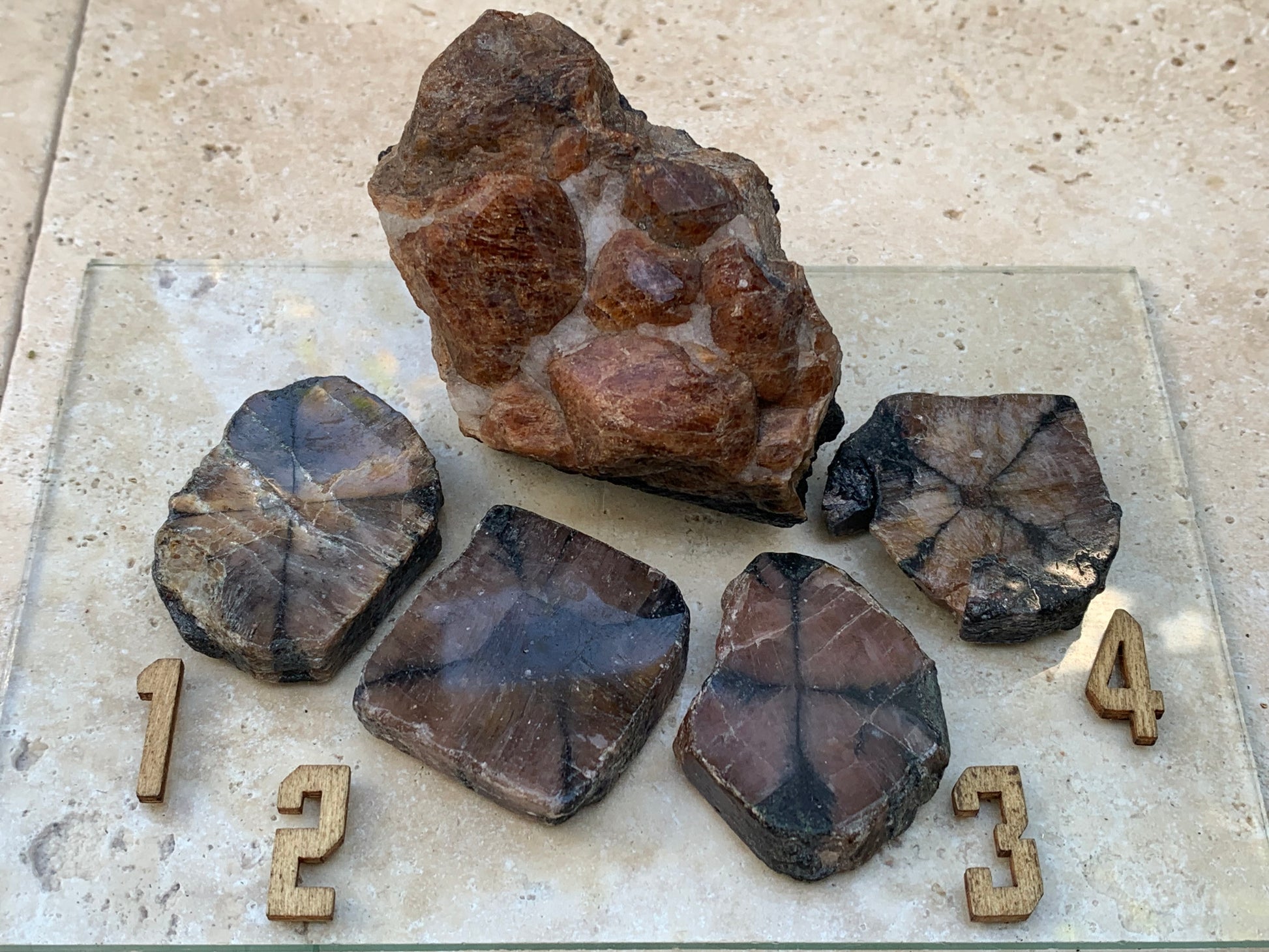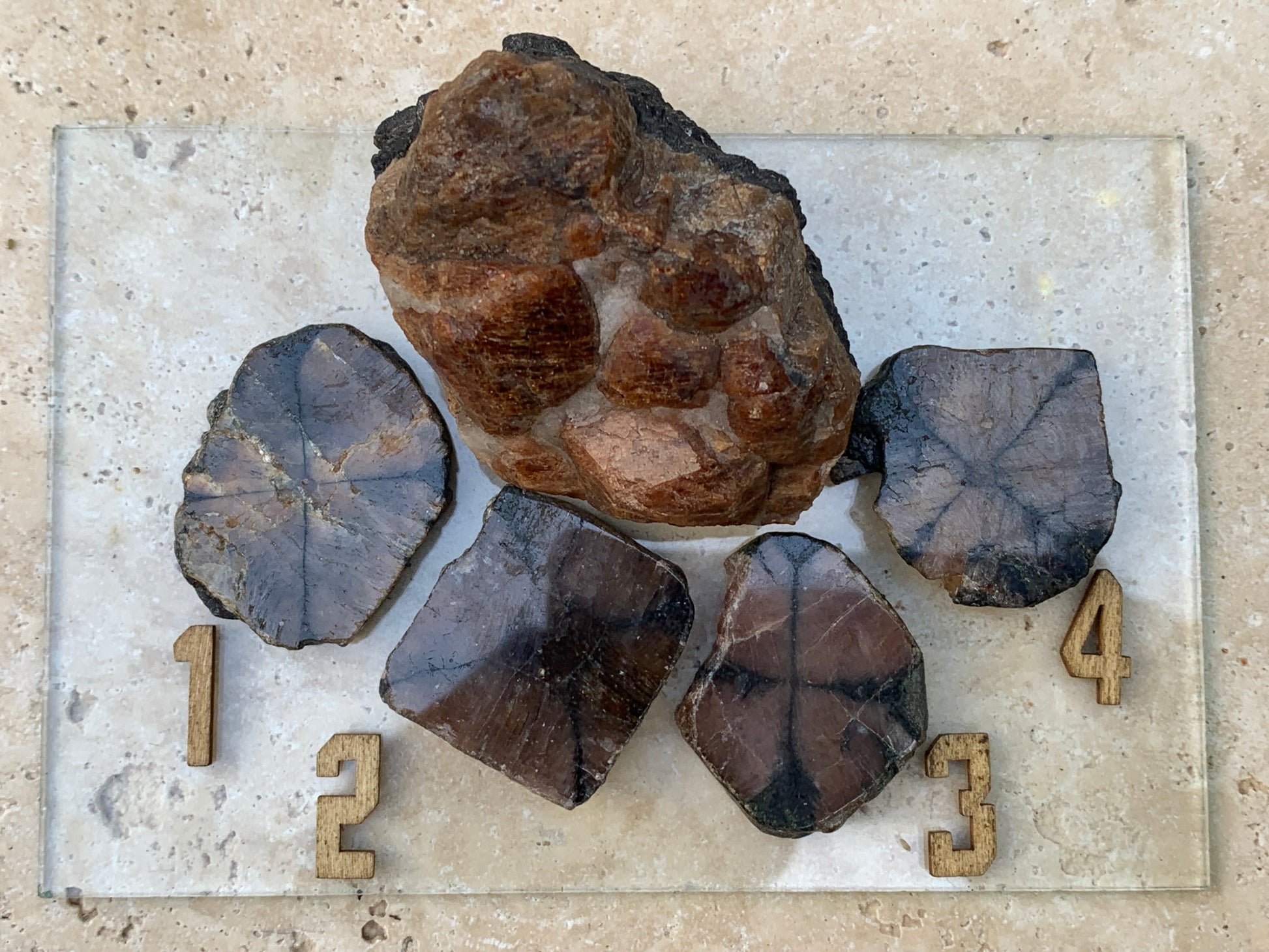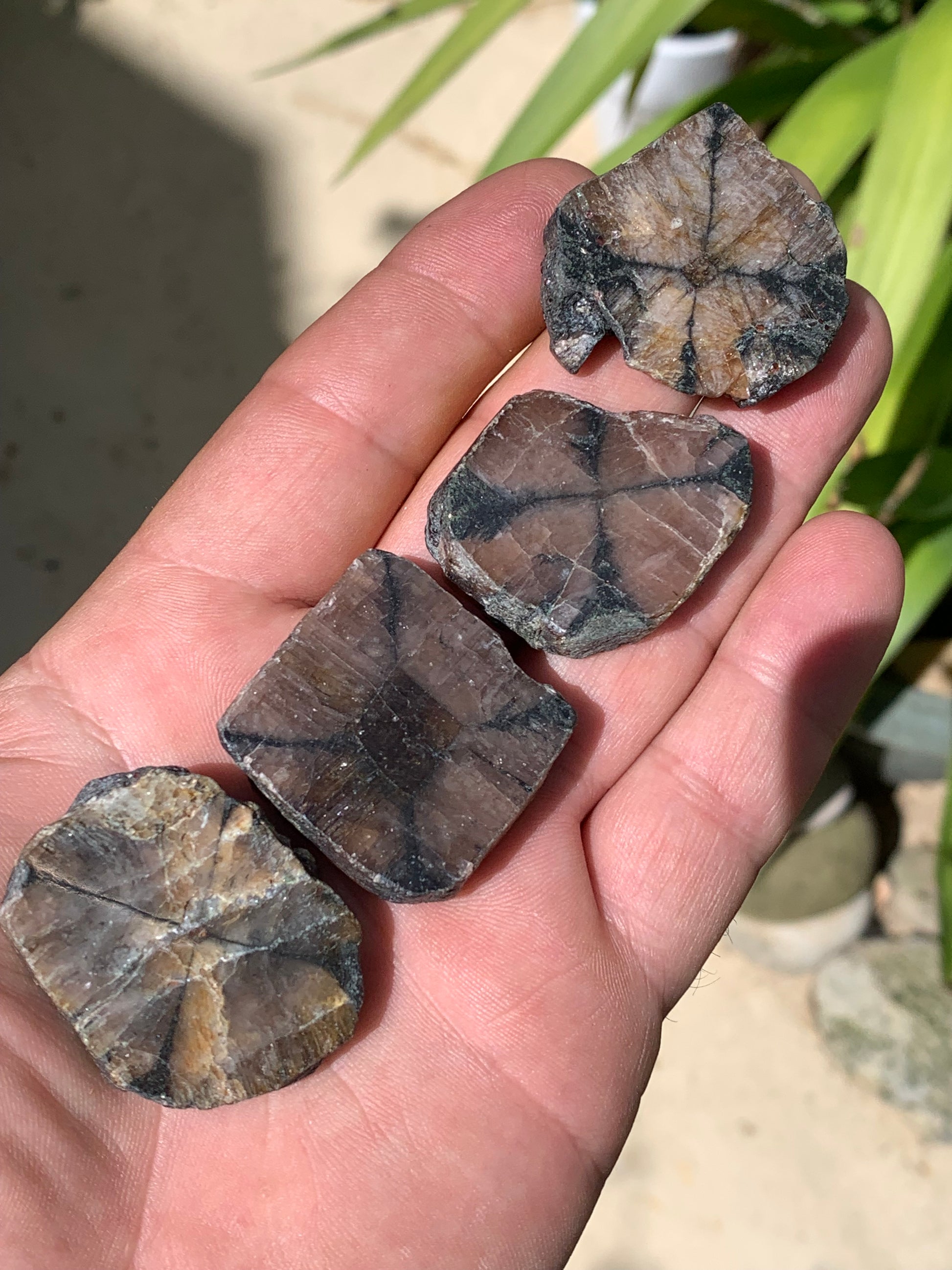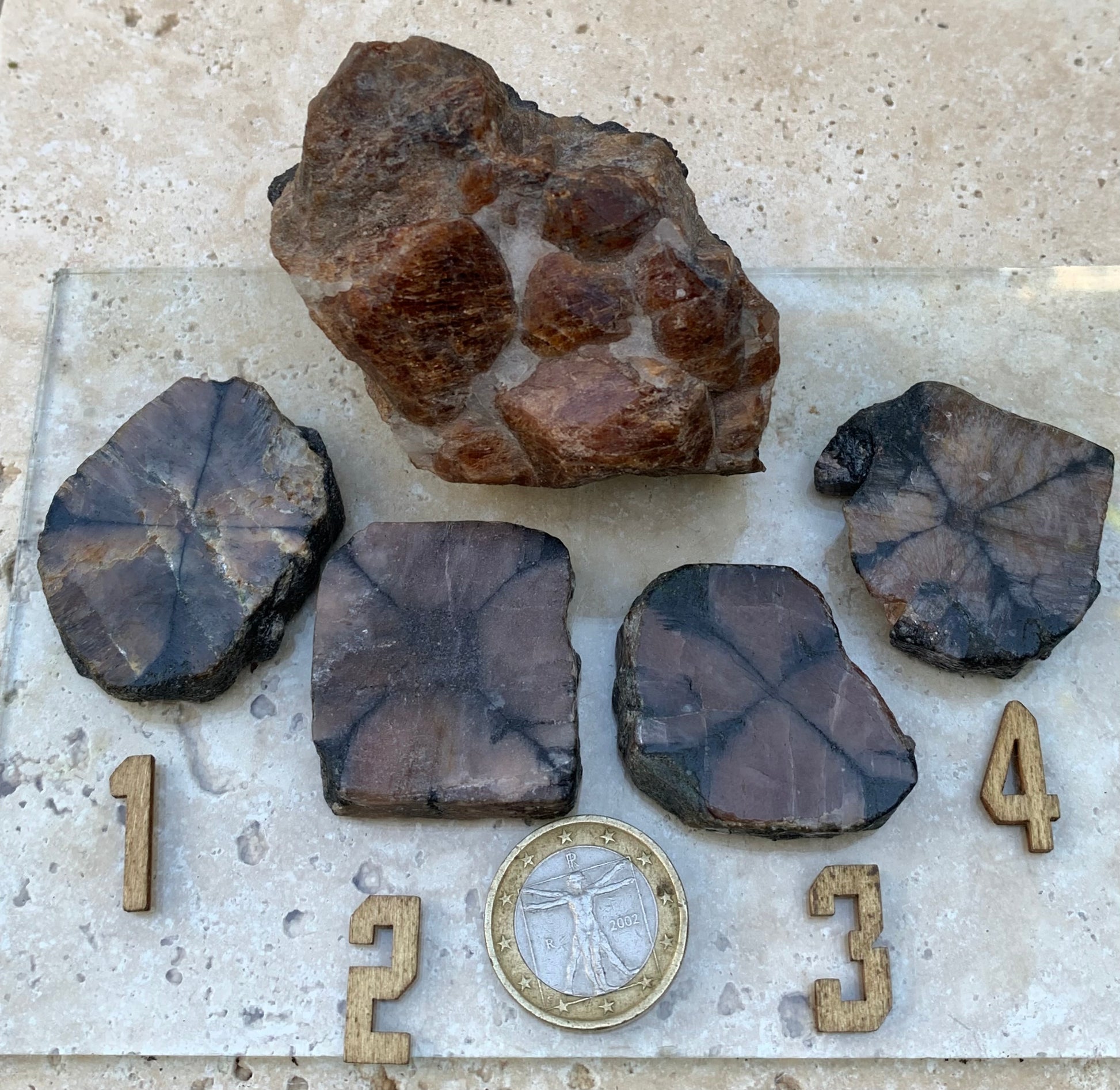 Andalousite/ Chiastolite, 5 pièces au choix dont 4 sciés avec une croix naturelle ! Protection, ancrage, transmutation, harmonie et plus encore !