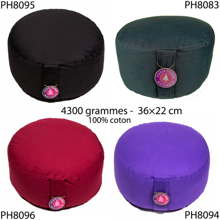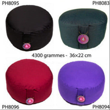 Coussins XL de Yoga ou Méditation, modèles au choix de : 33 cm de diamètre x 22 de hauteur. Housses extérieures en coton, aux couleurs variés, avec housses intérieures remplis de graines de Sarrasin !