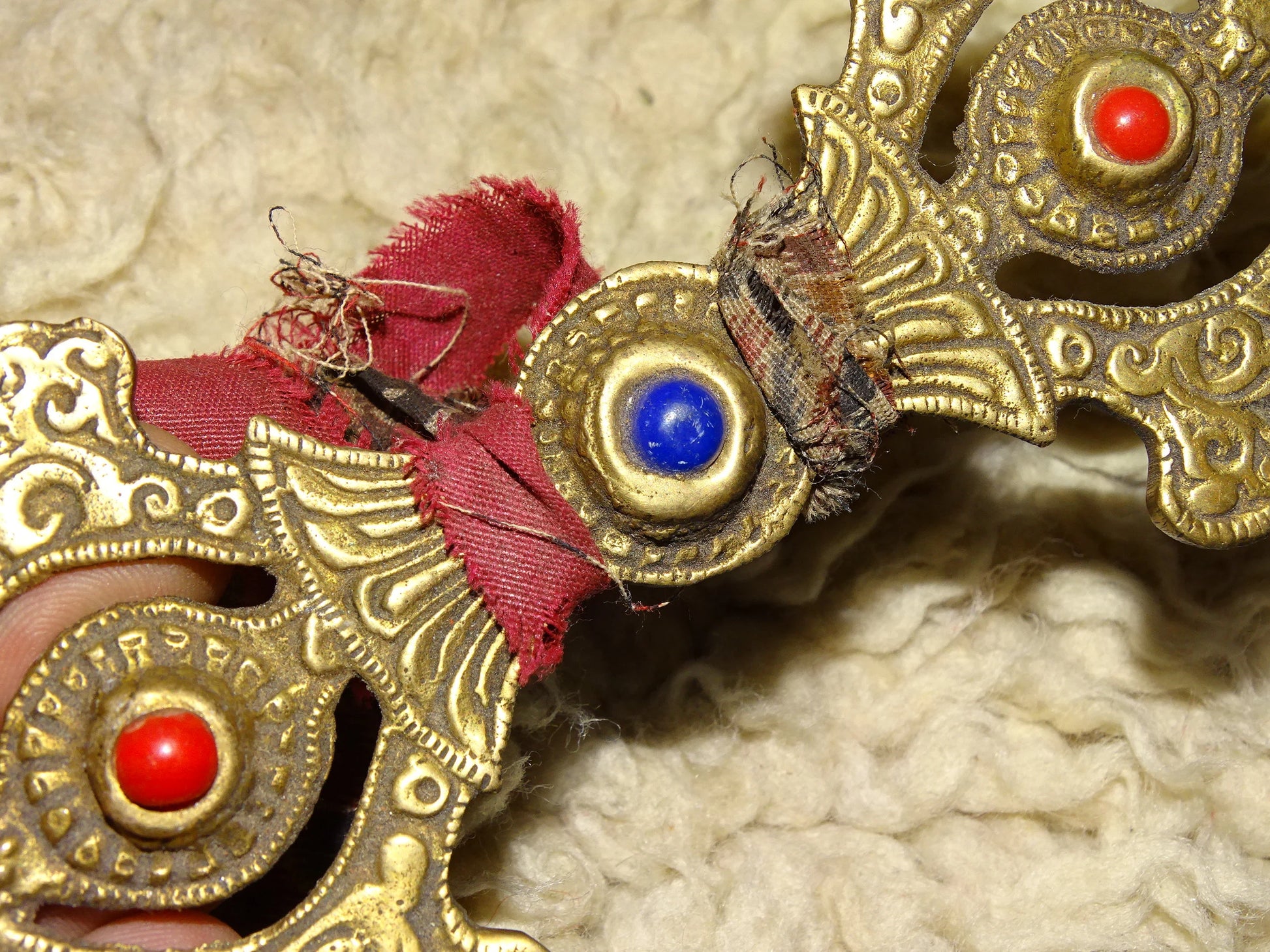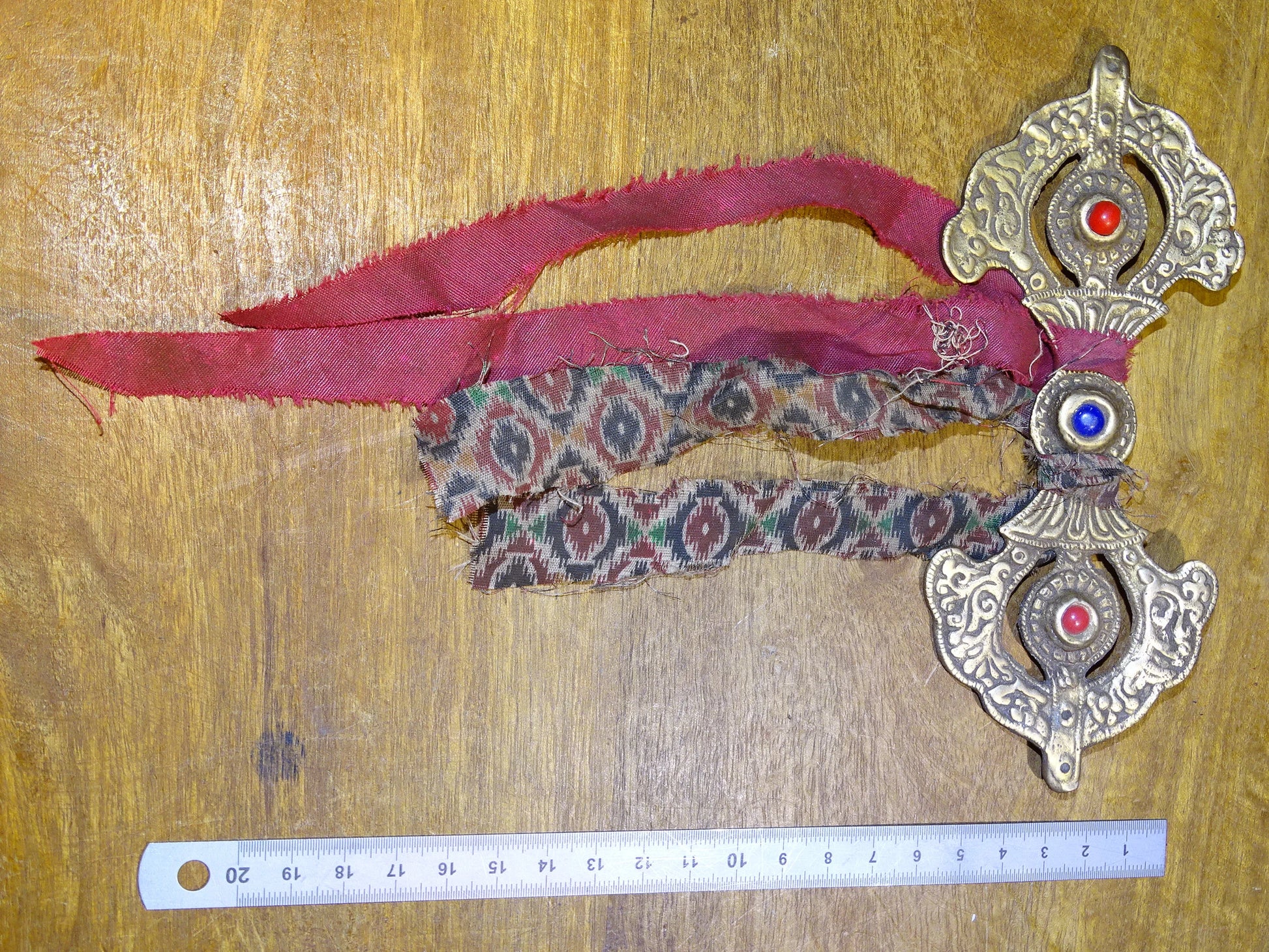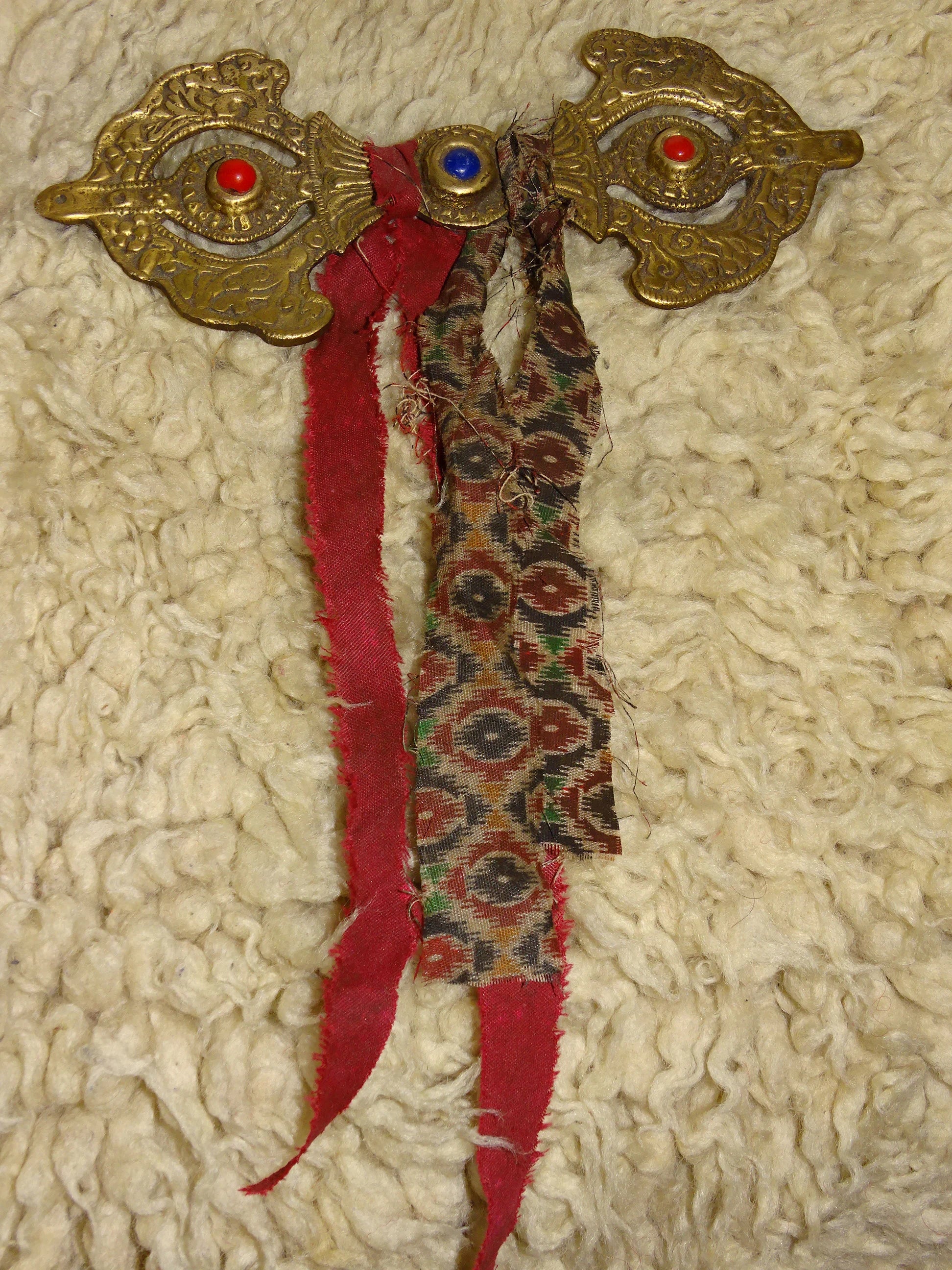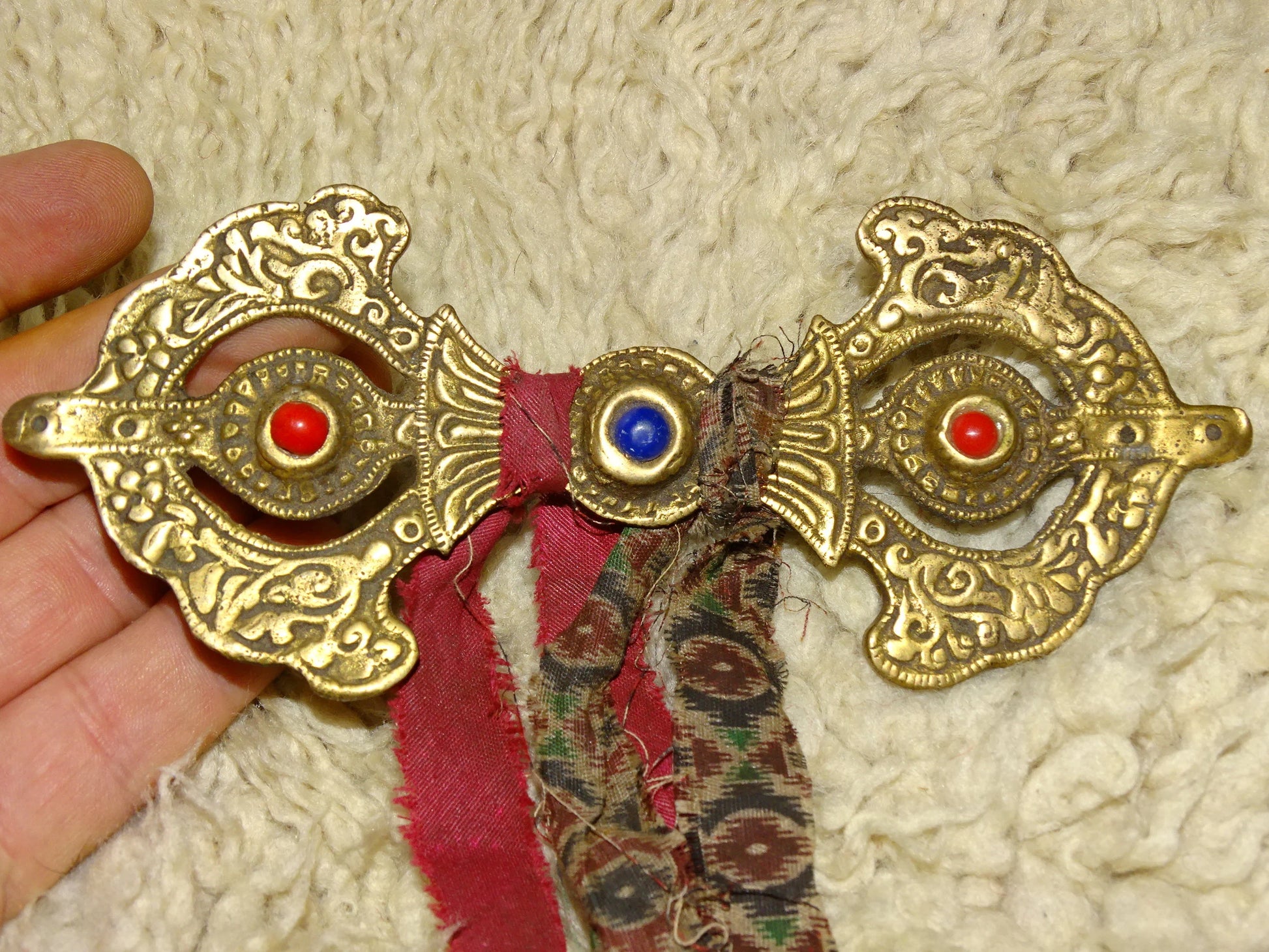 Authentique boucle/ fermoir de robe Bouddhiste, en forme de Dorge, 17 x 6 centimètres + franges, superbe pièce en laiton, avec pierres de corail et de lapis lazuli !