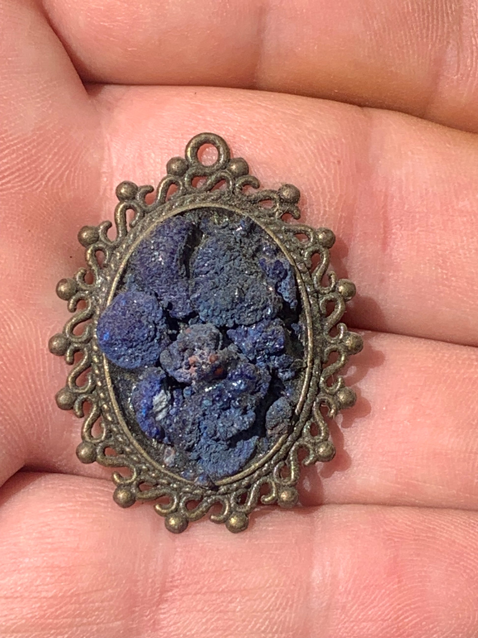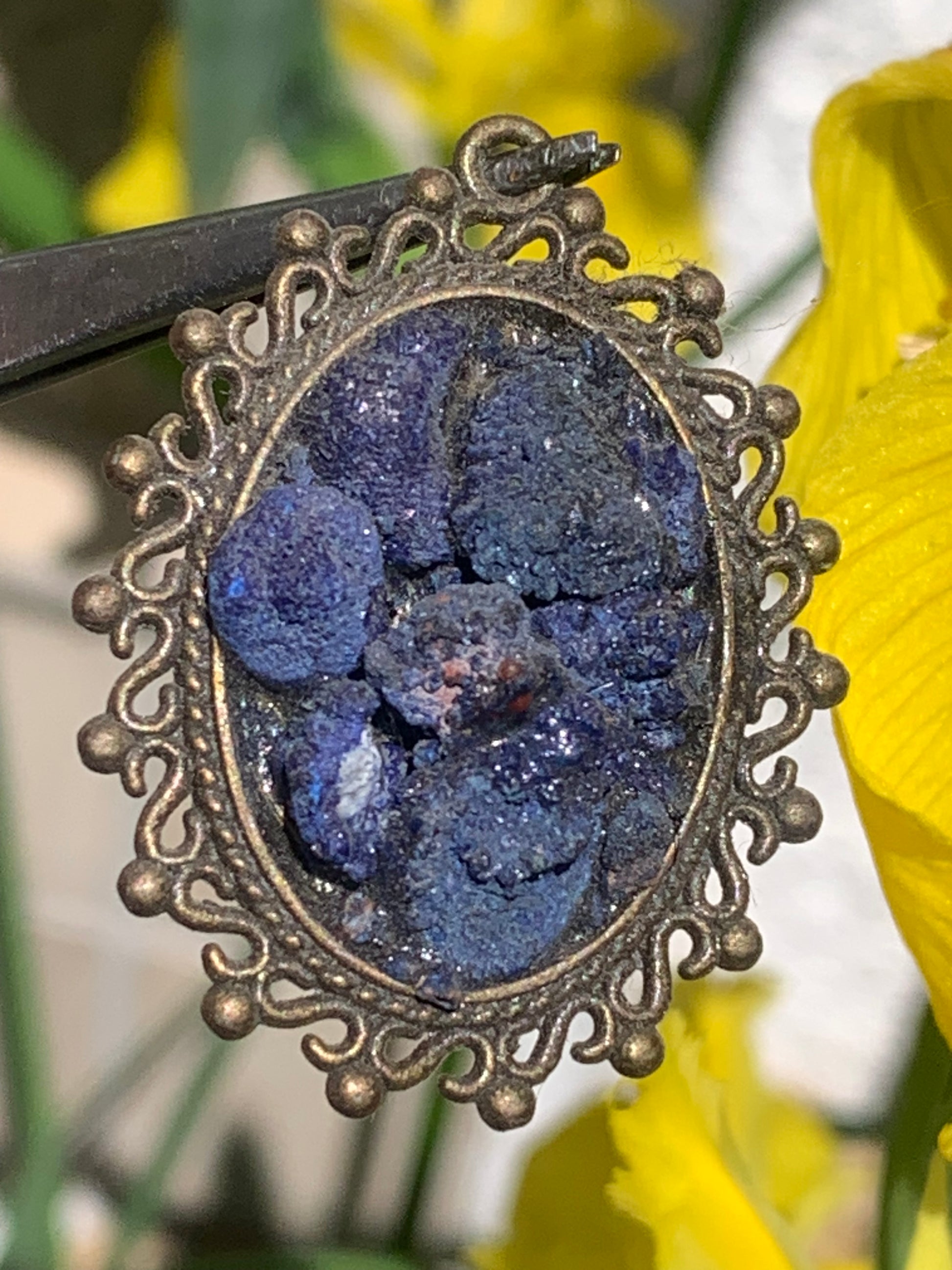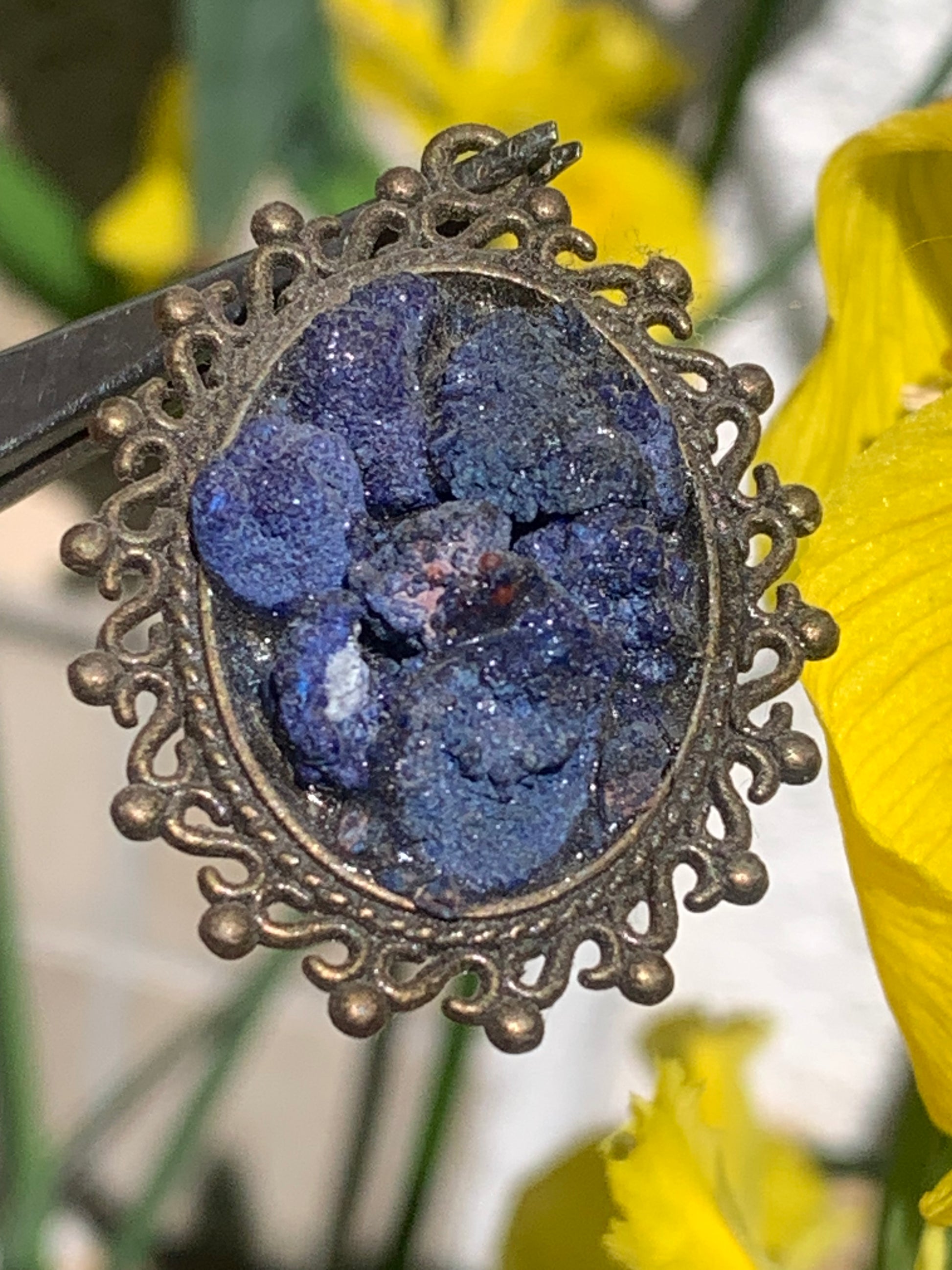 Azurite, pendentif en laiton couleur bronze avec de jolies cristaux naturels, de 37mm de hauteur x 30 de largeur x 8 d'épaisseur. Vendu avec cordon réglable de couleur noire offert !