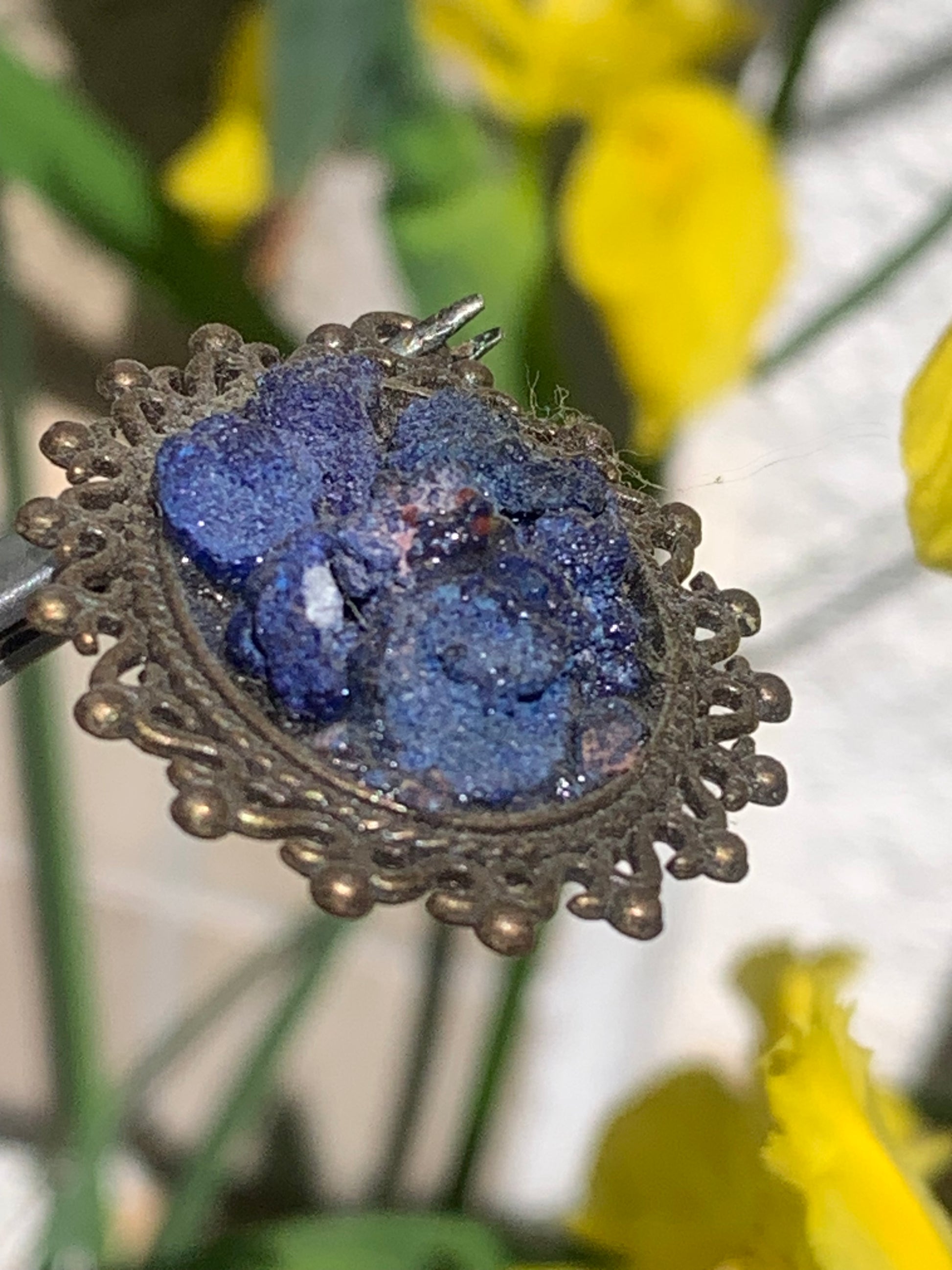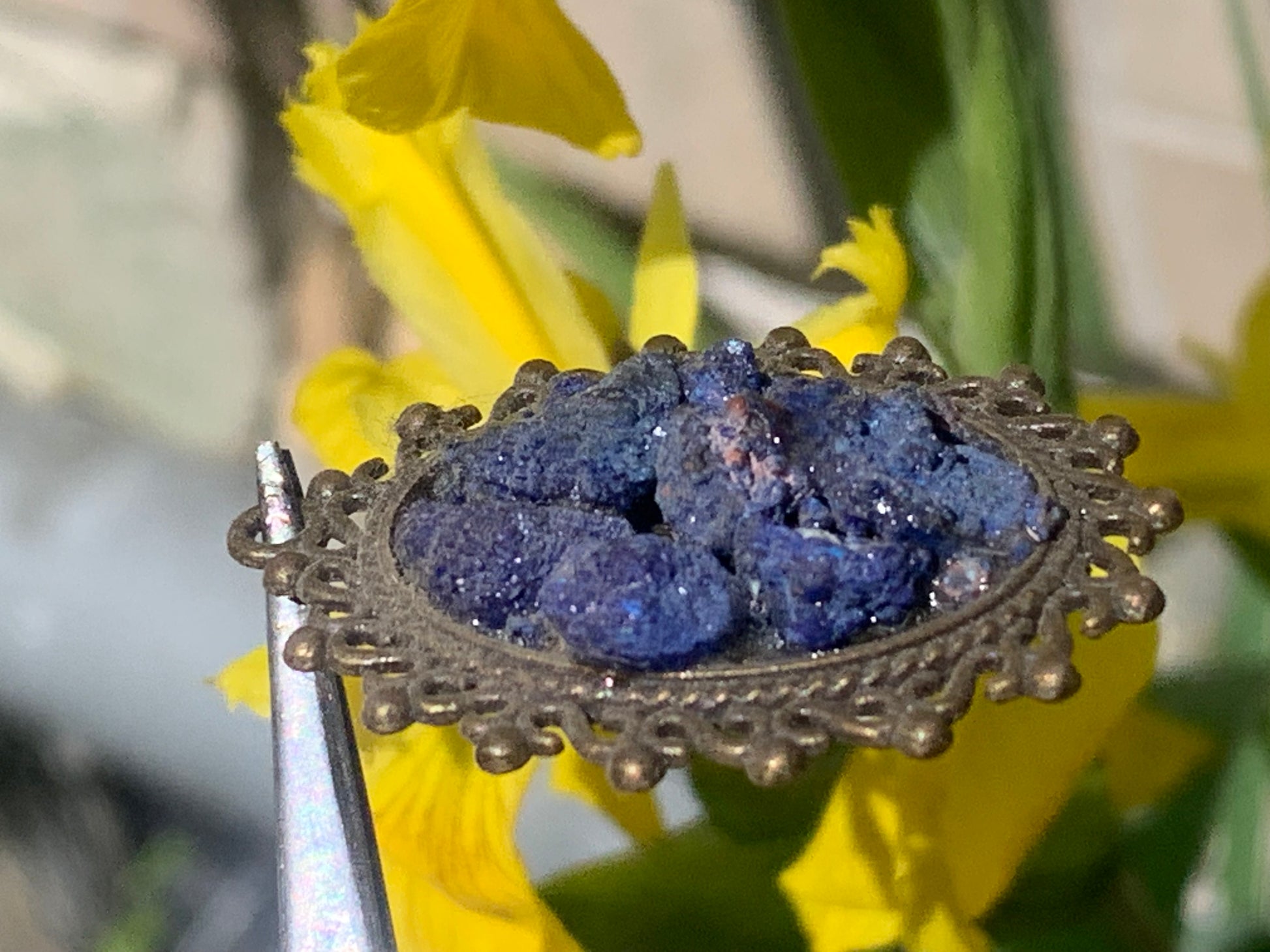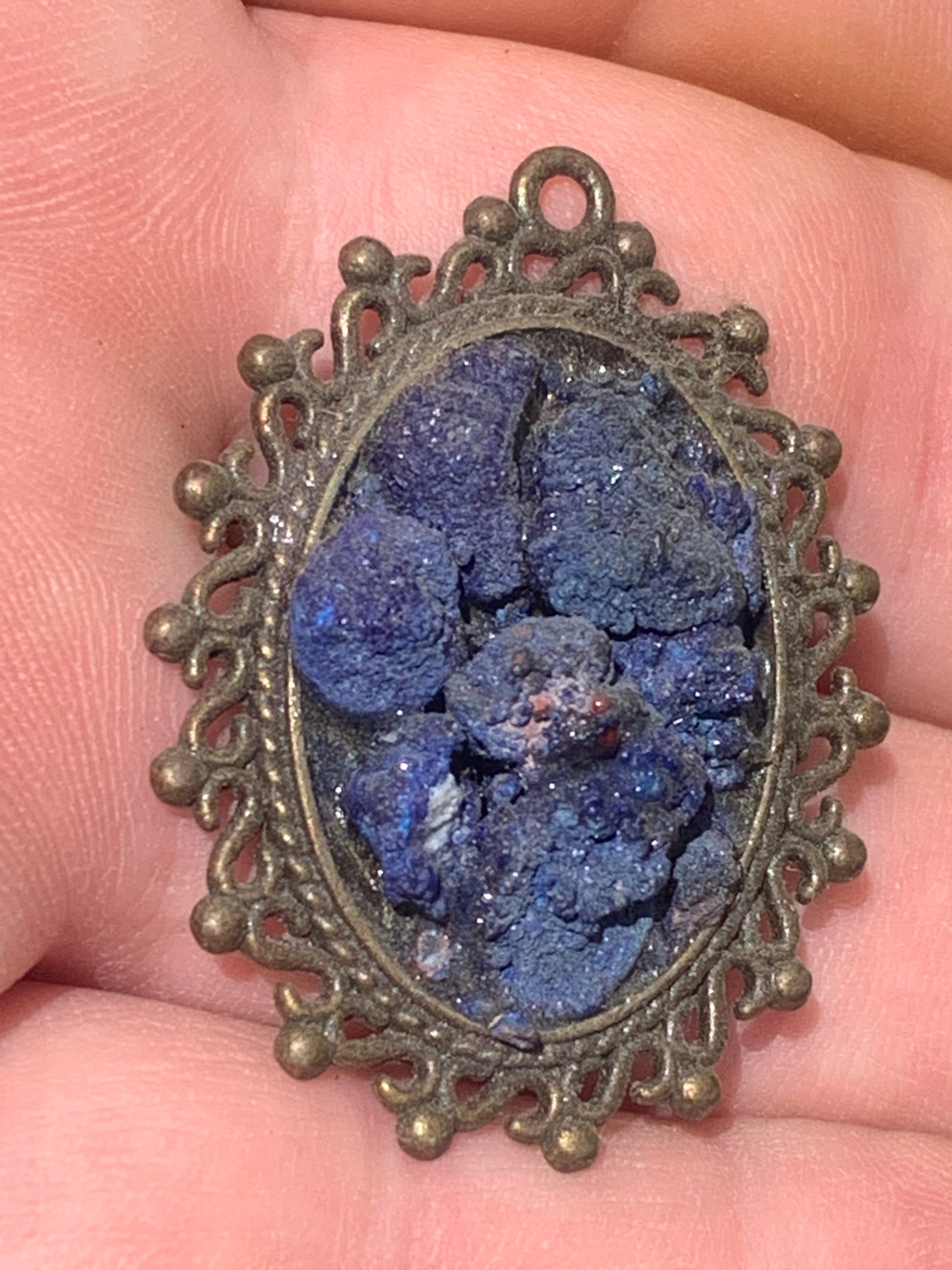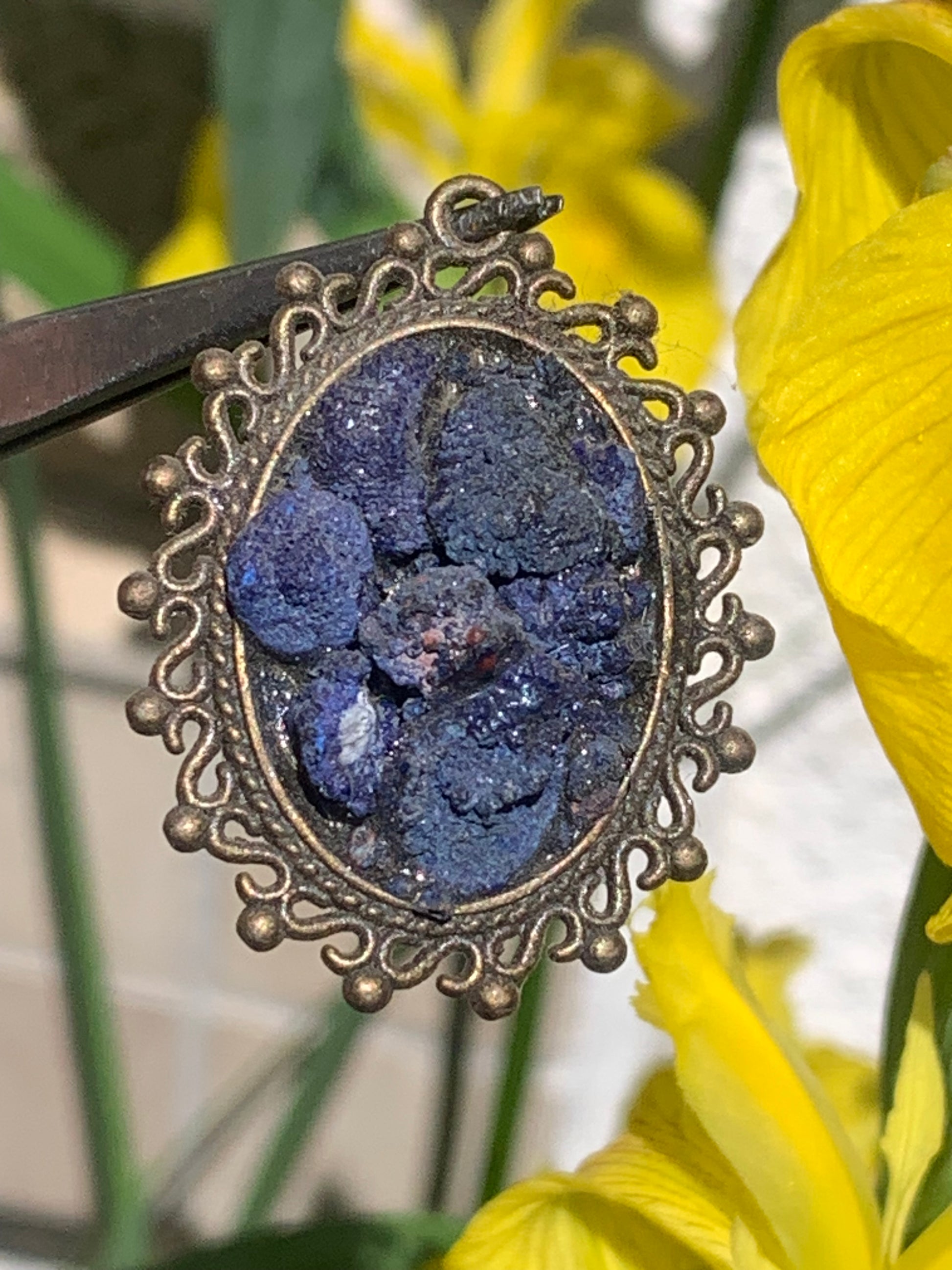 Azurite, pendentif en laiton couleur bronze avec de jolies cristaux naturels, de 37mm de hauteur x 30 de largeur x 8 d'épaisseur. Vendu avec cordon réglable de couleur noire offert !