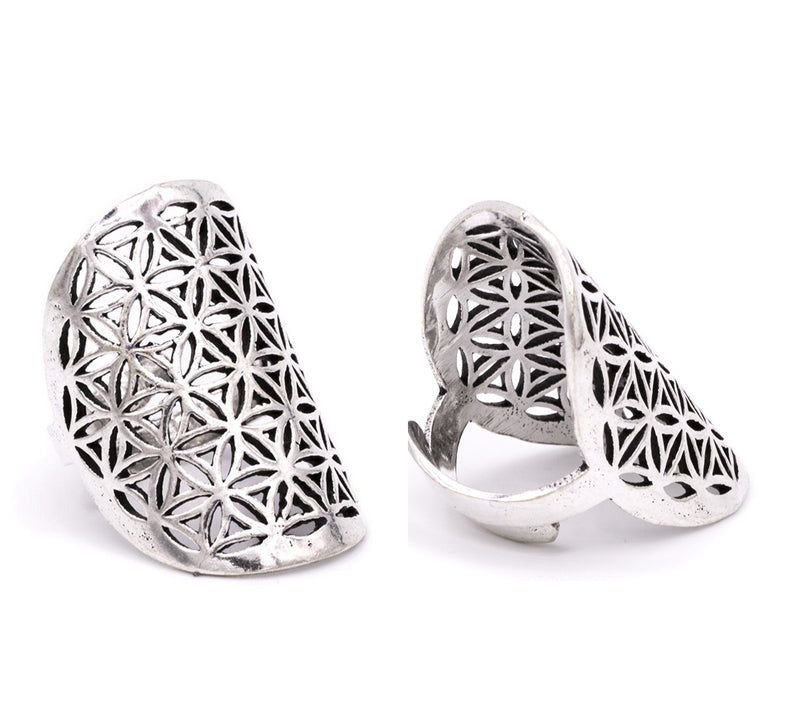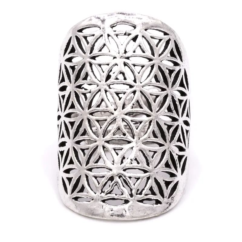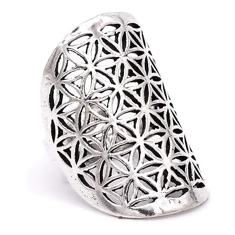 Bague couvrante avec Fleur de vie. Fait en laiton couleur argent. Superbe pièce ! Taille réglable/ ajustable !