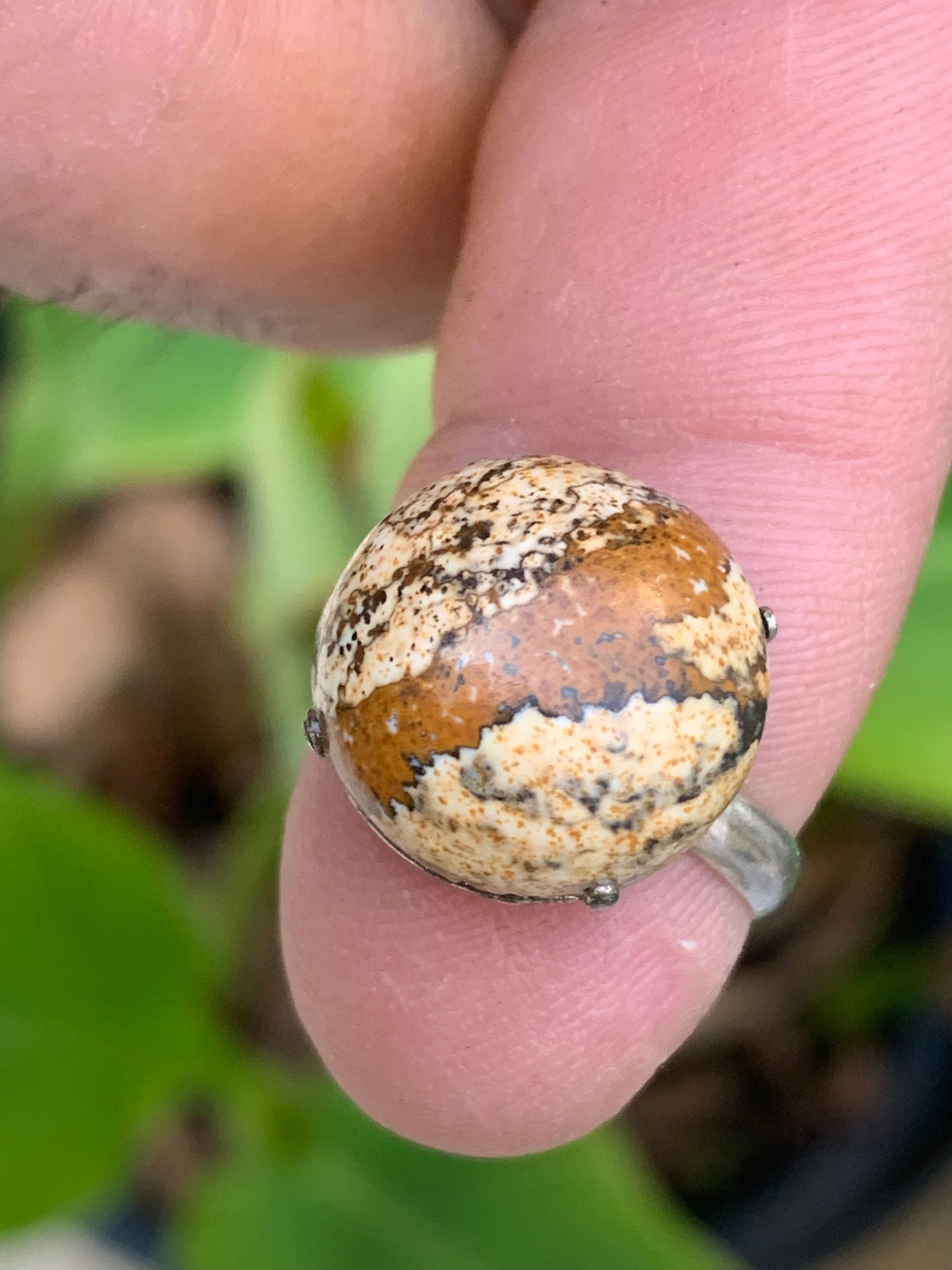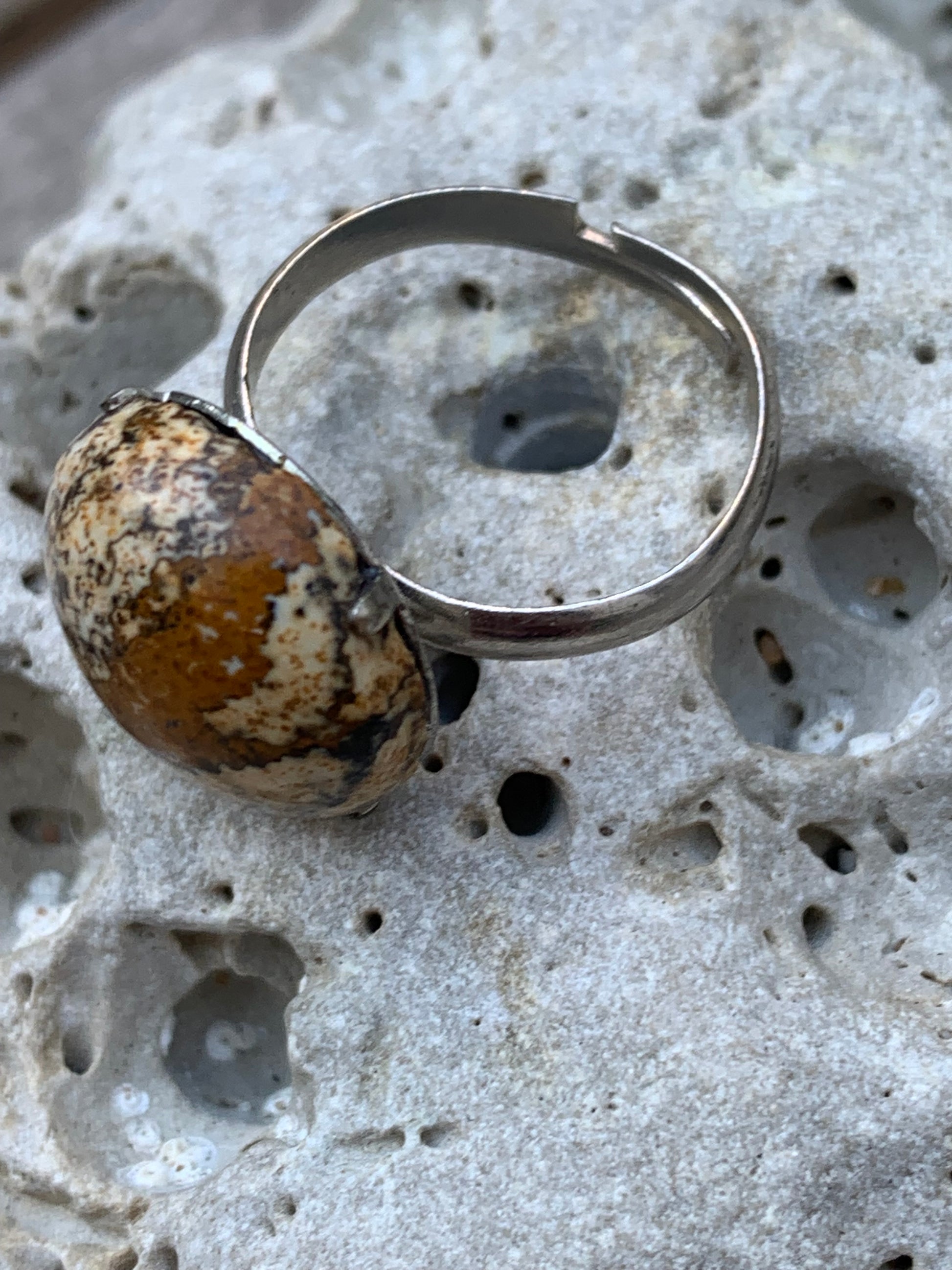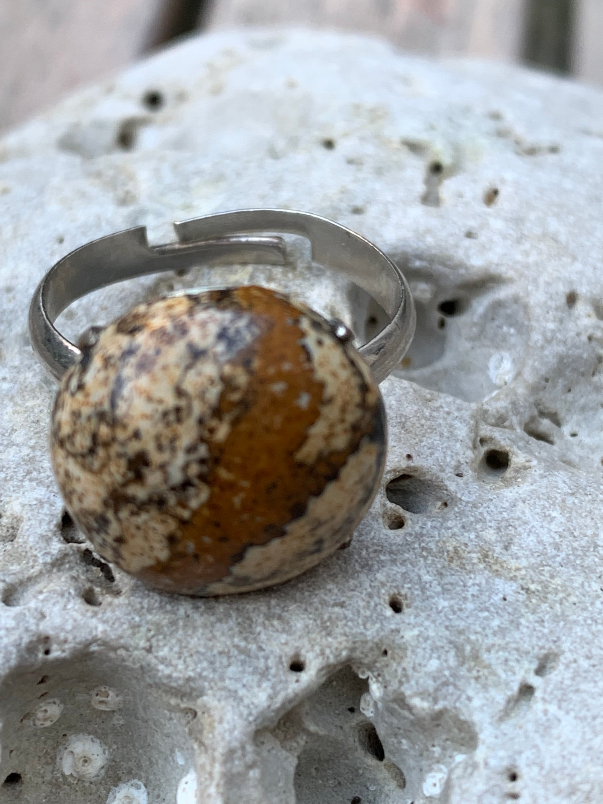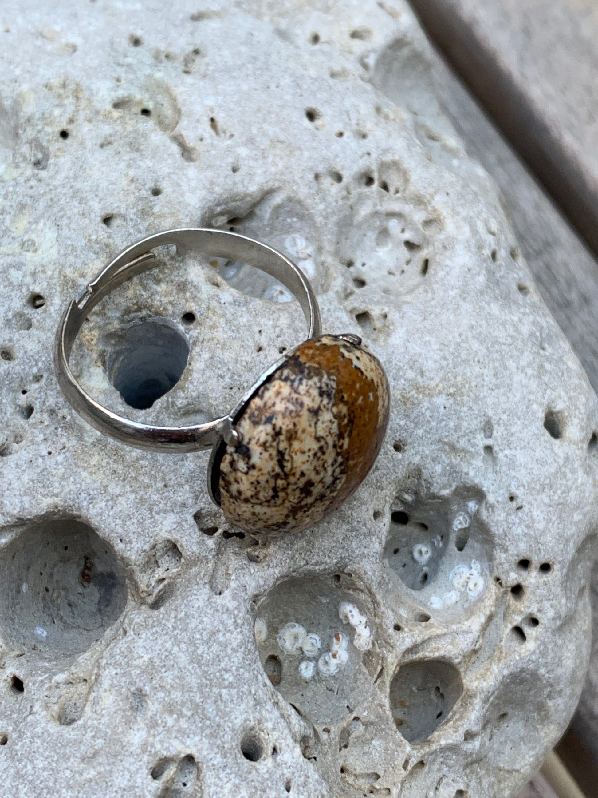 Bague en 'jaspe paysage', non teintée, cabochon en pierre collée sur anneau pré-montée en laiton couleur argent ! Taille réglable d'environ 50 à 60 Fr.