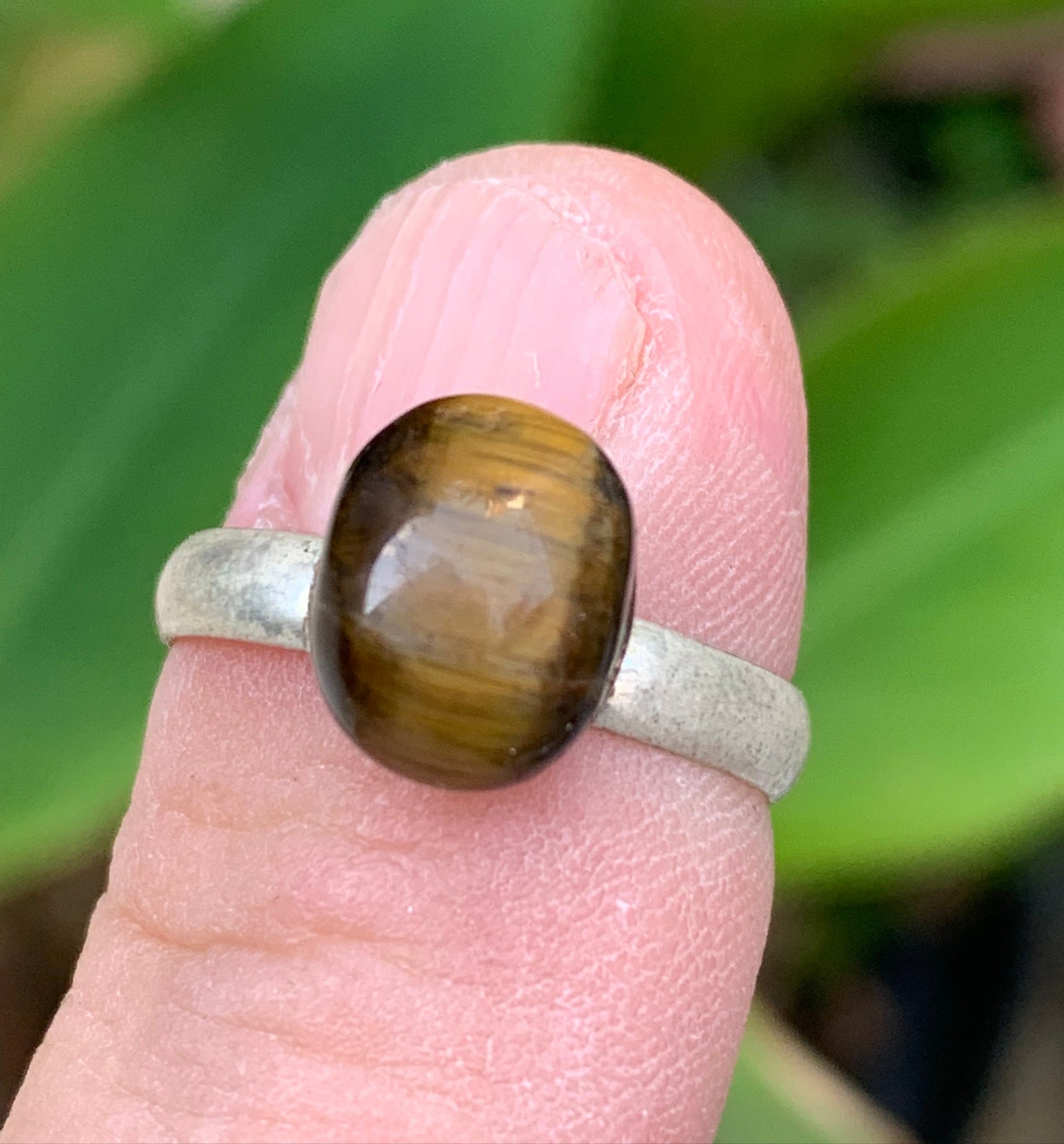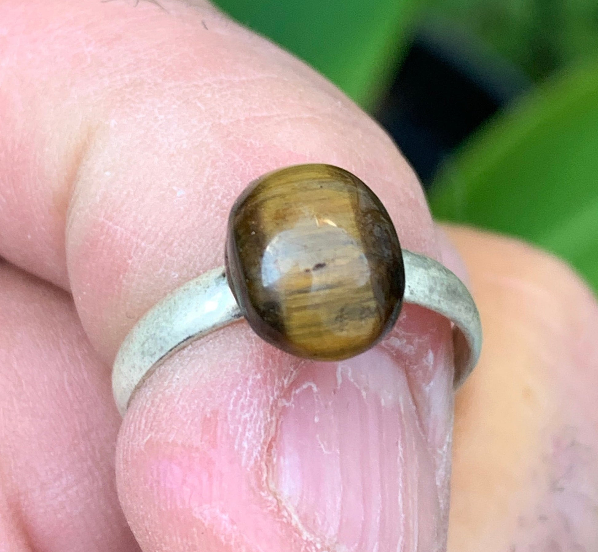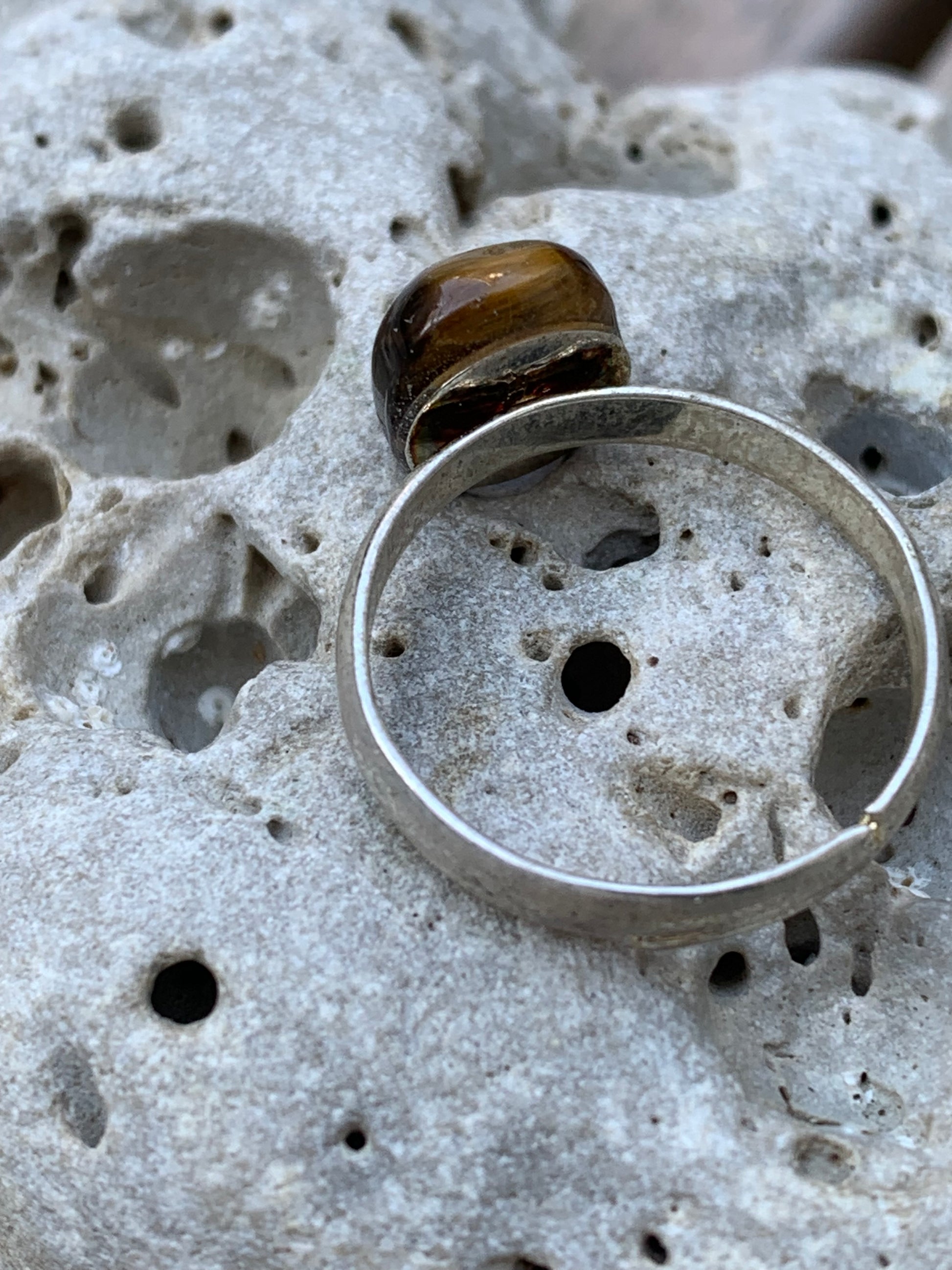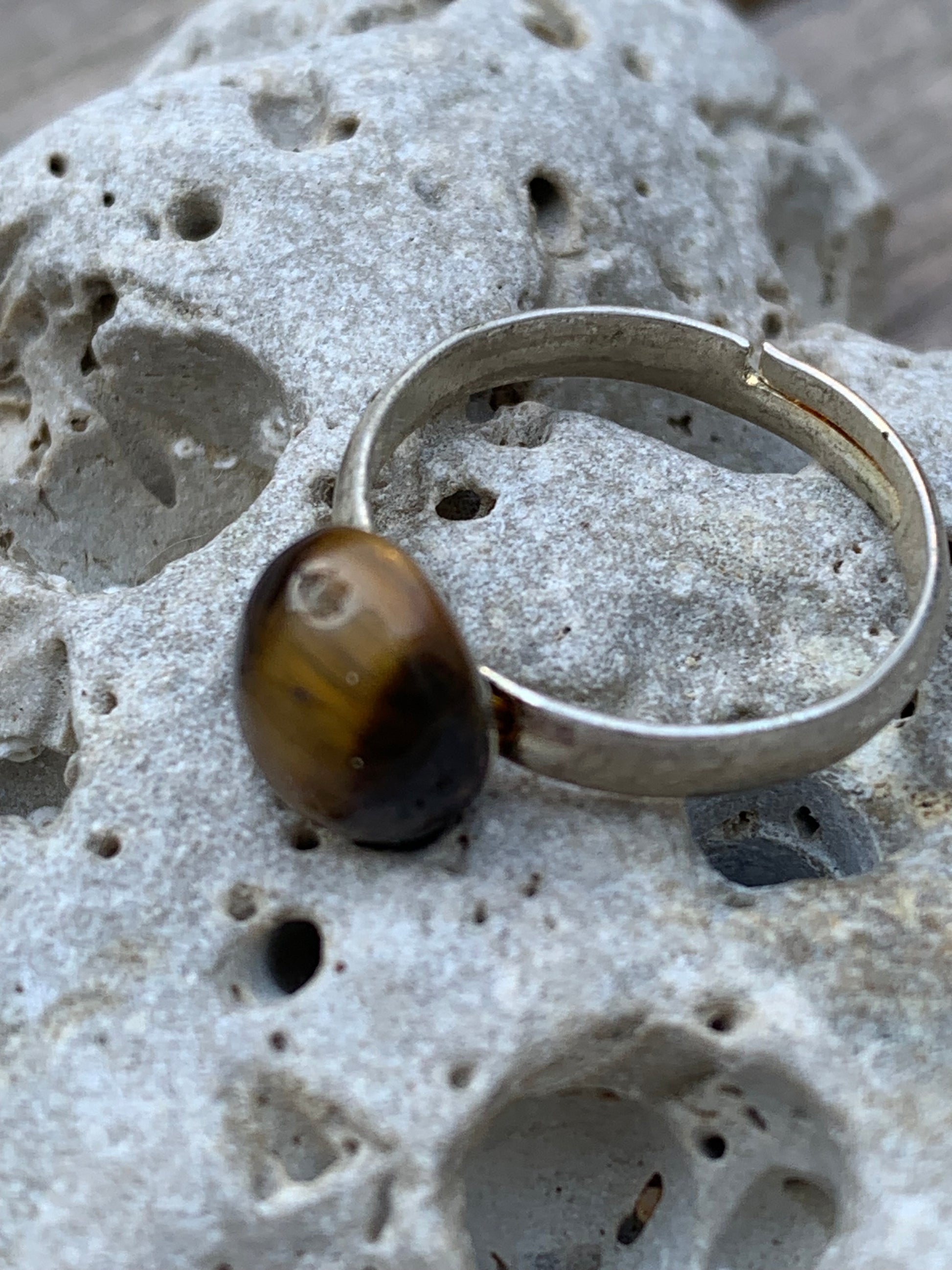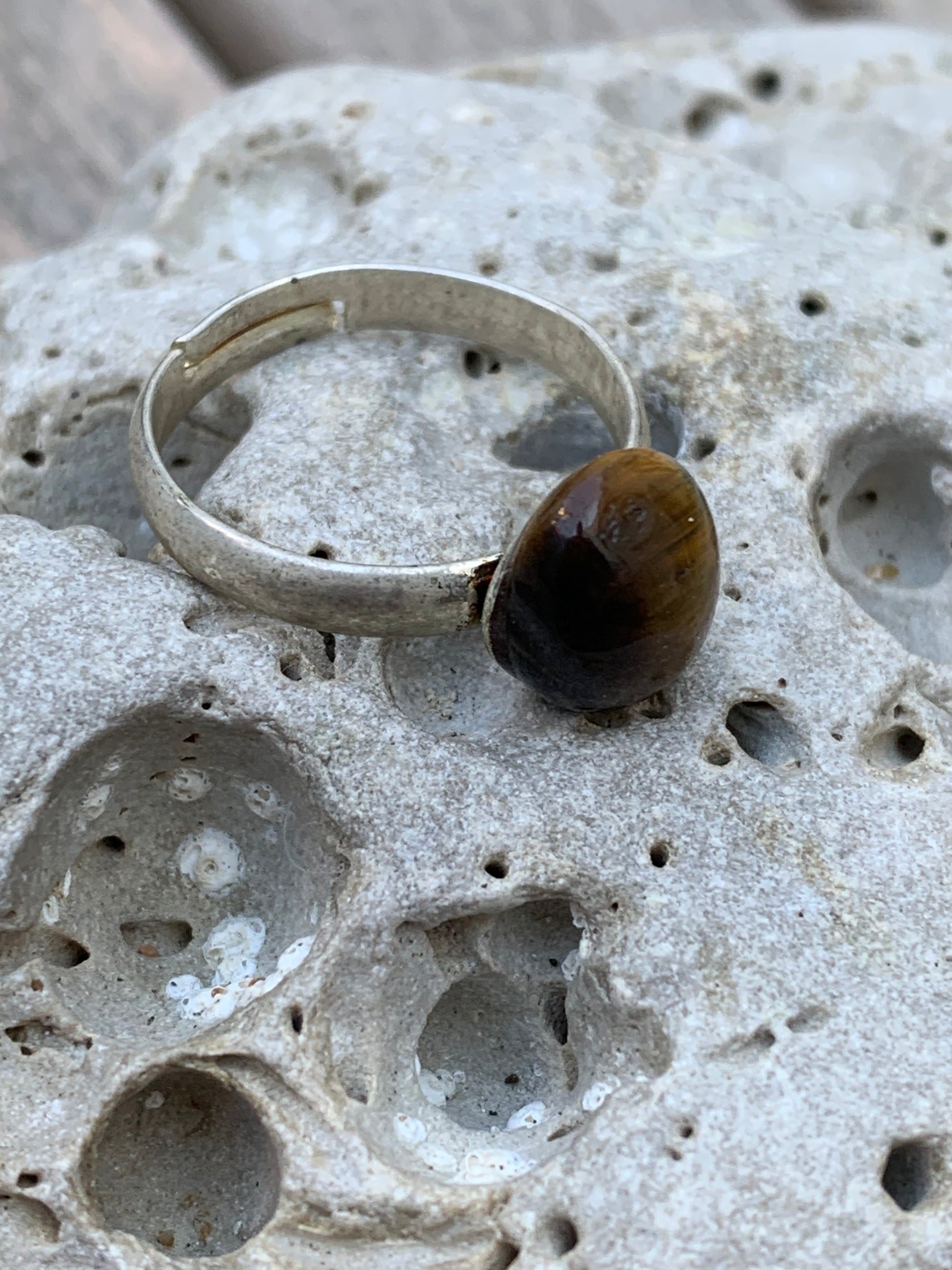 Bague en œil de tigre, cabochon en pierre collée sur anneau pré-montée en laiton couleur argent ! Taille réglable d'environ 50 à 60 Fr.