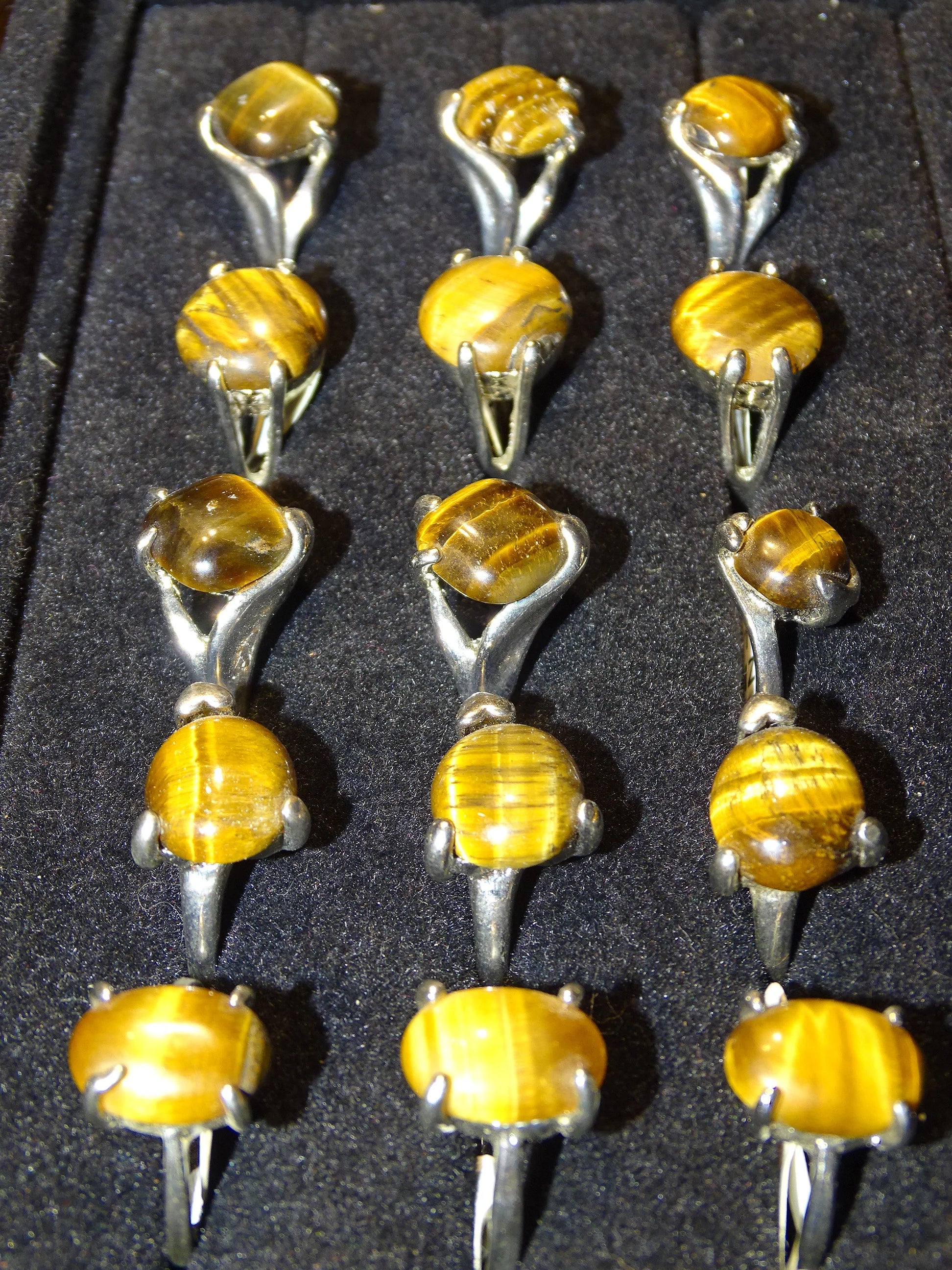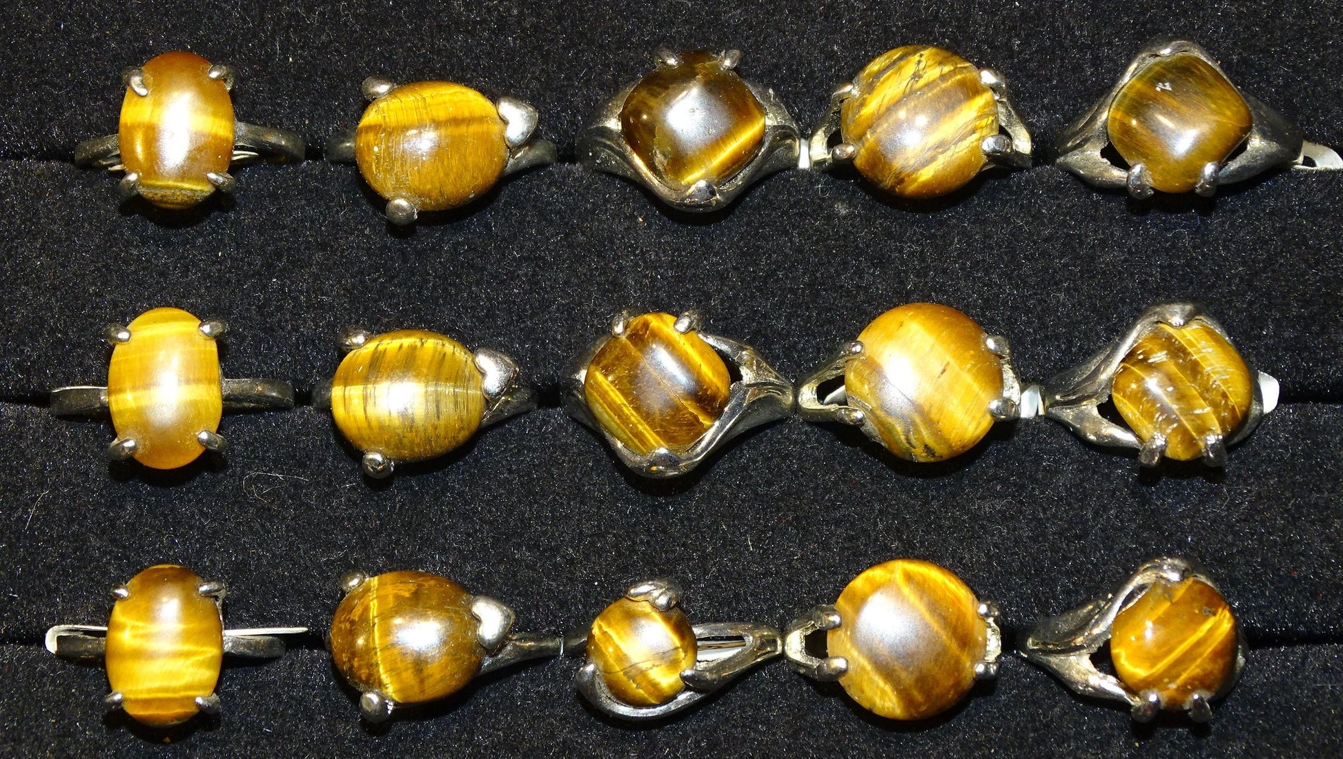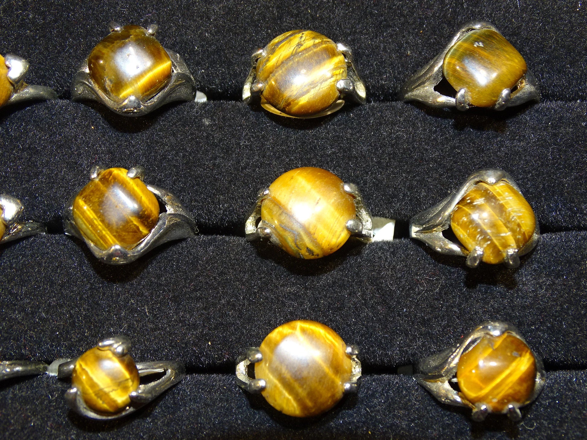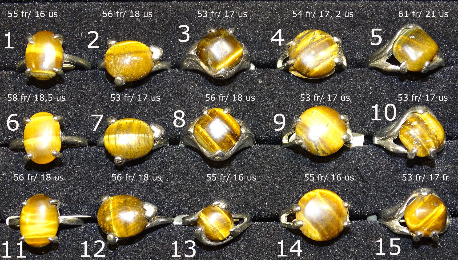 Bague en Œil de tigre, sélection de divers modèles au choix. Faites en laiton couleur Argent. Superbe pierre aux reflets irisés ! Taille repérées de 53 à 61 Fr. (voir photo)