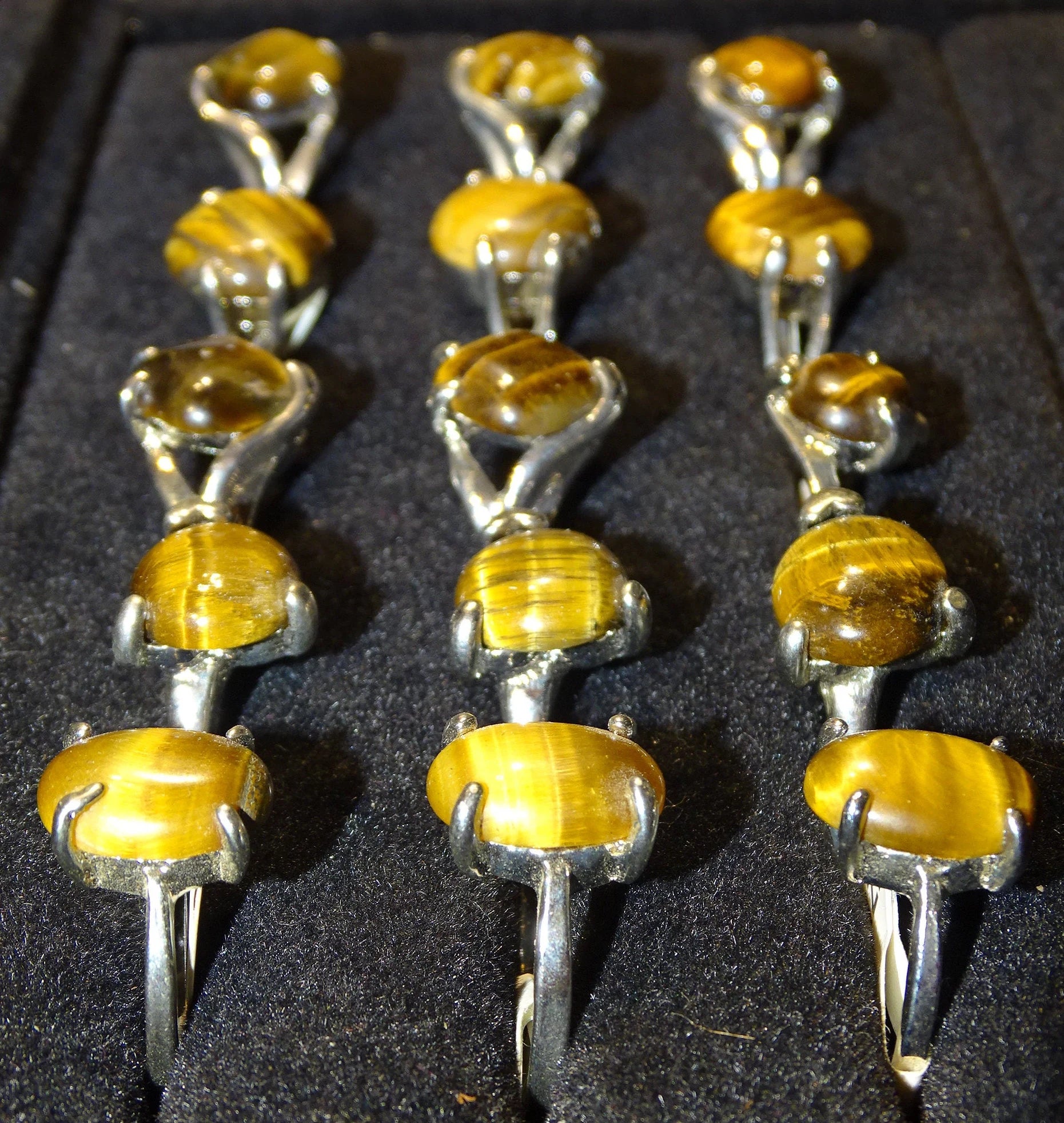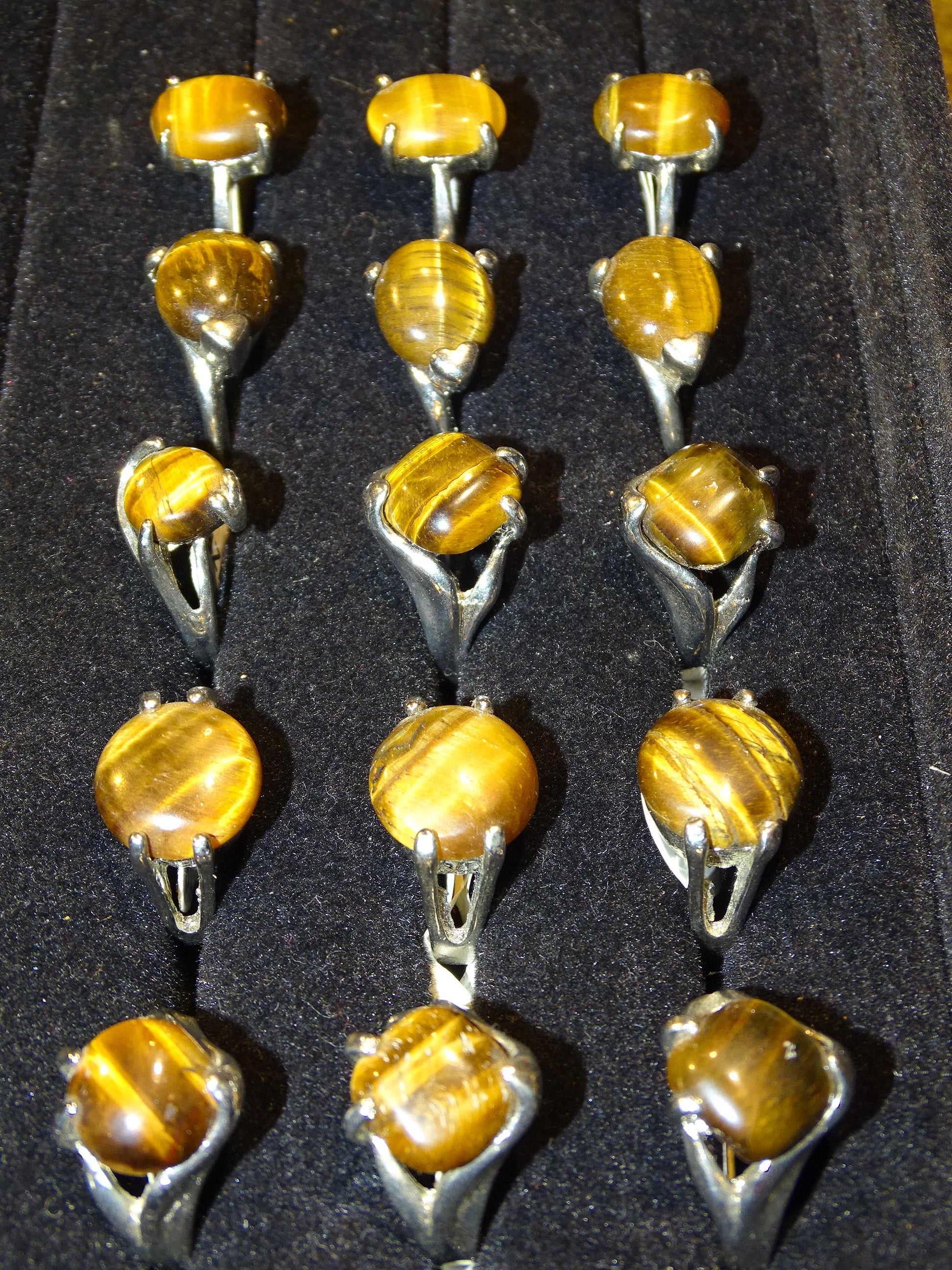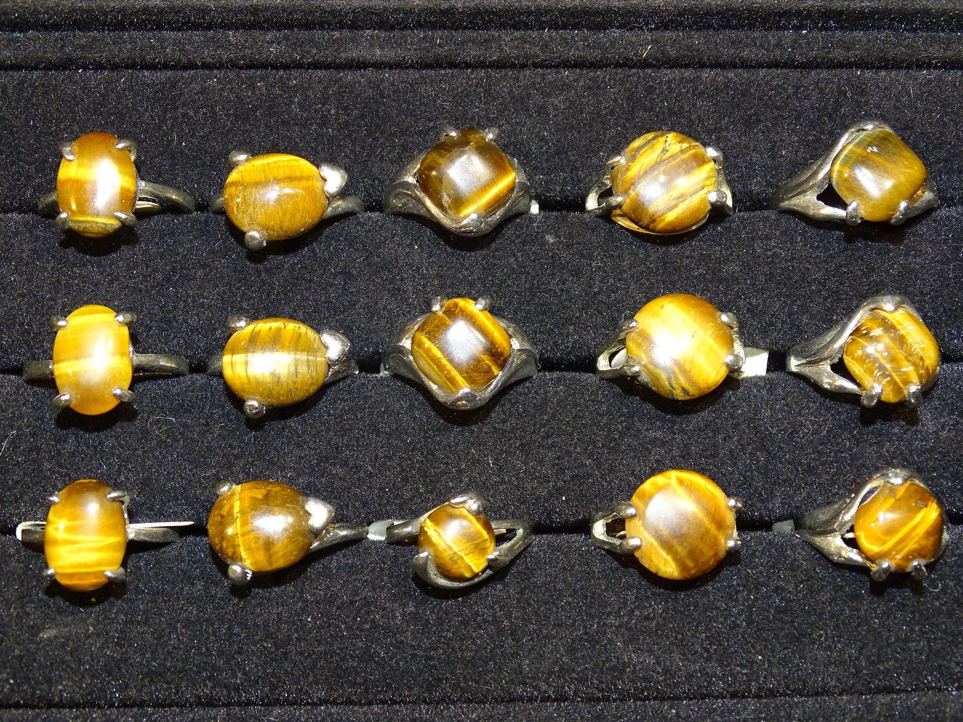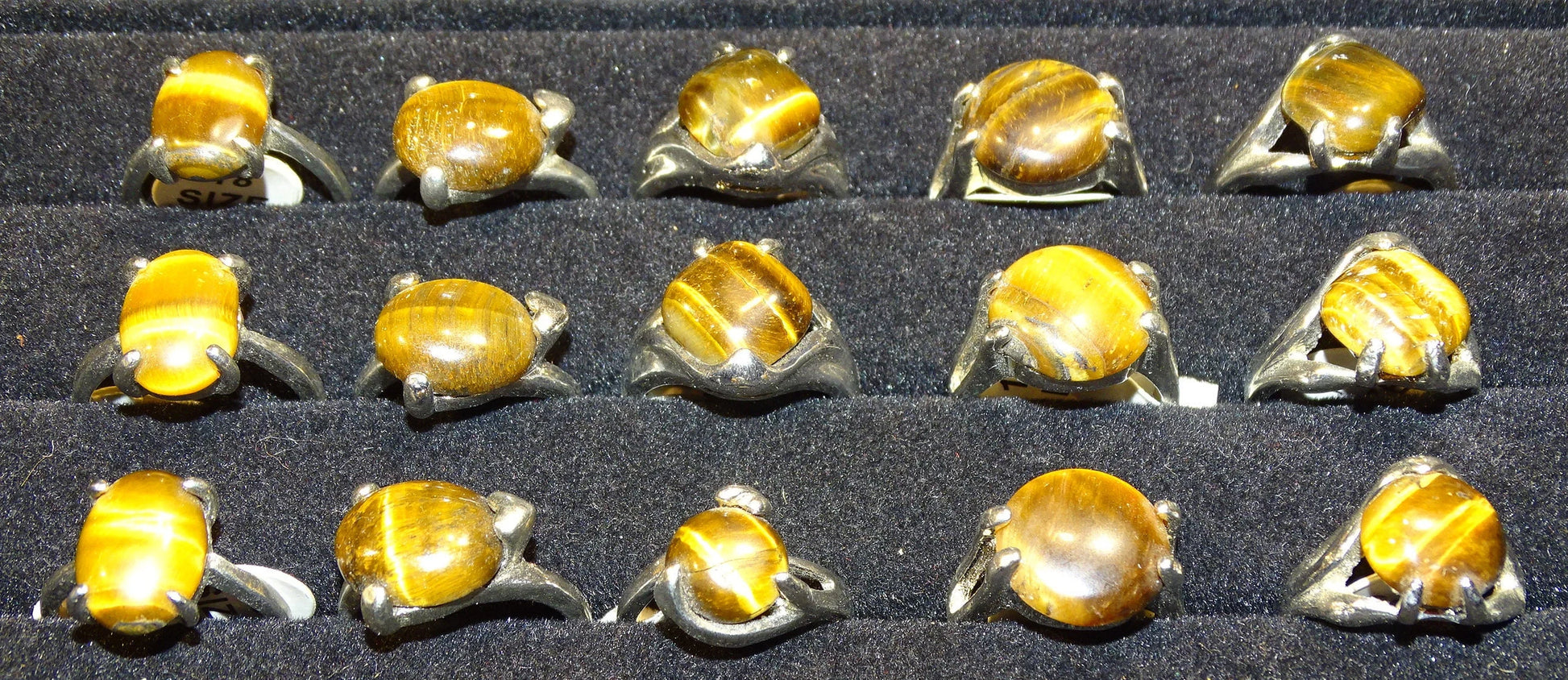Bague en Œil de tigre, sélection de divers modèles au choix. Faites en laiton couleur Argent. Superbe pierre aux reflets irisés ! Taille repérées de 53 à 61 Fr. (voir photo)