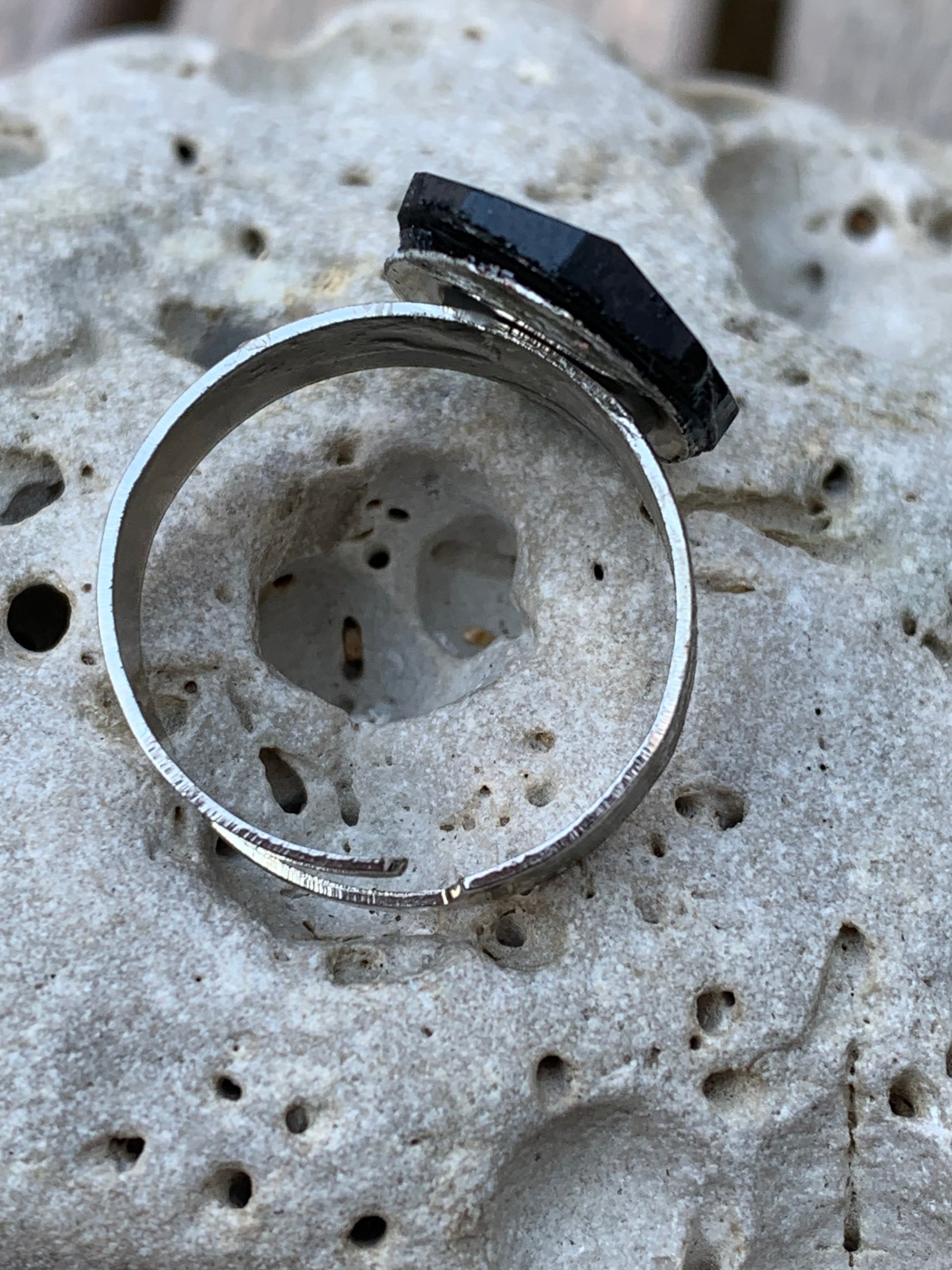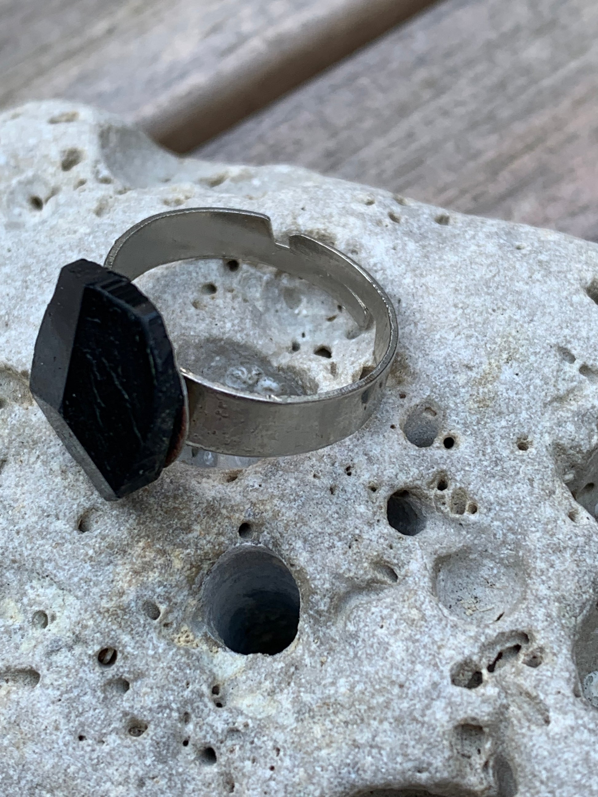 Bague en tourmaline, pièce brute et naturelle avec ses 3 faces magiques ! Cabochon scié en pierre collée sur anneau pré-montée en laiton couleur argent ! Taille réglable d'environ 50 à 60 Fr.