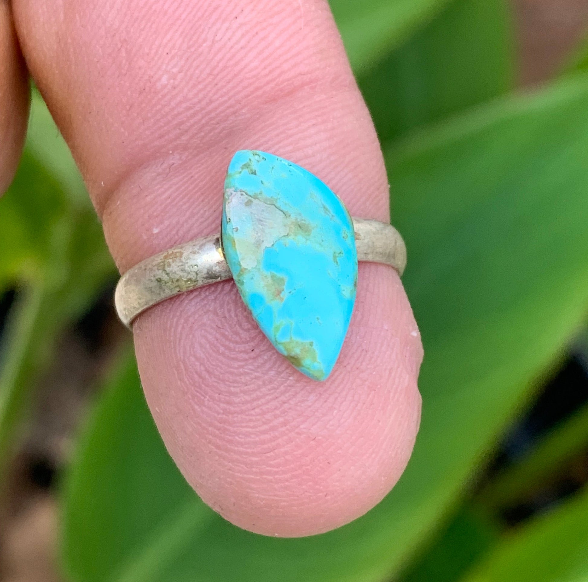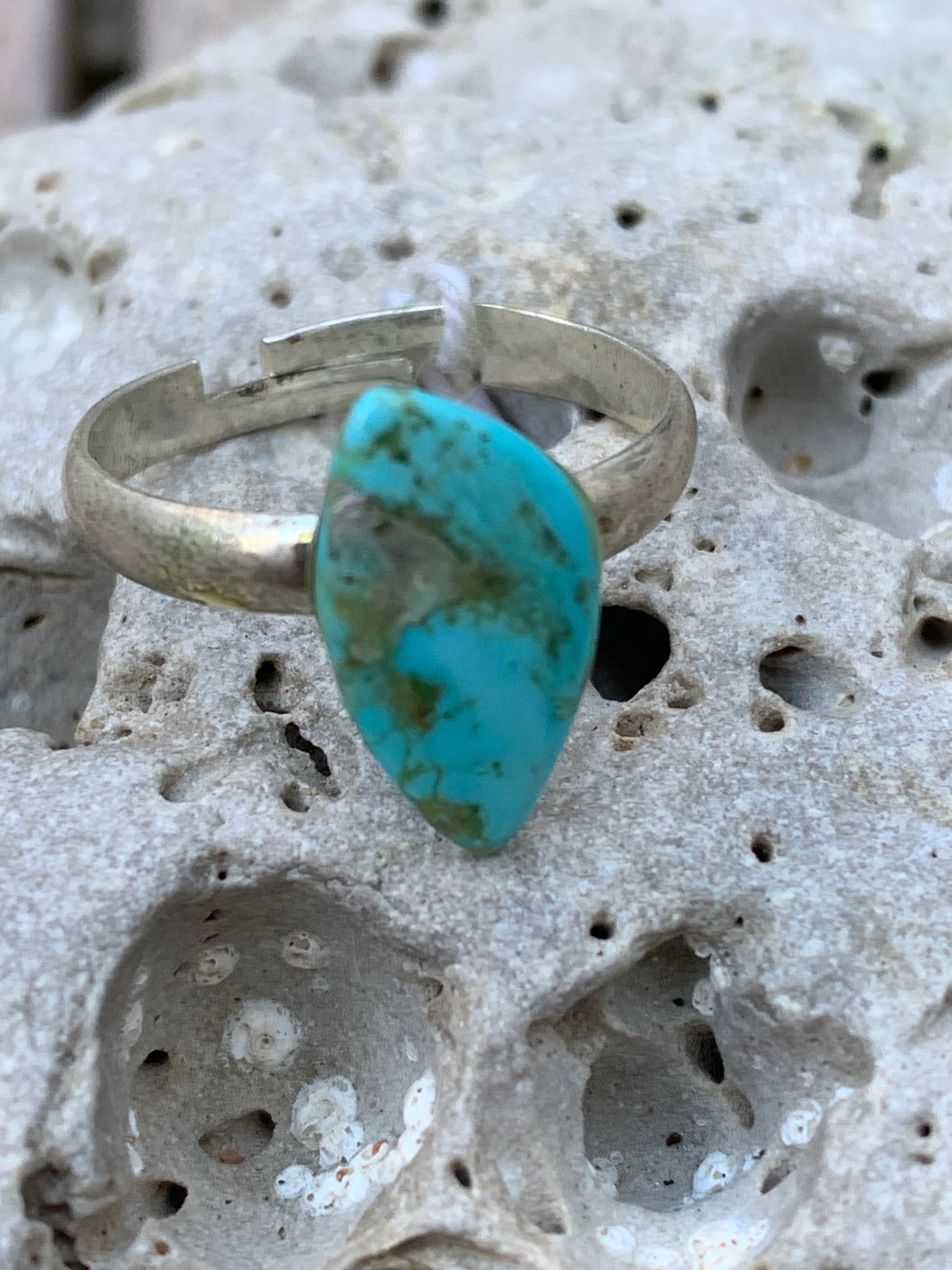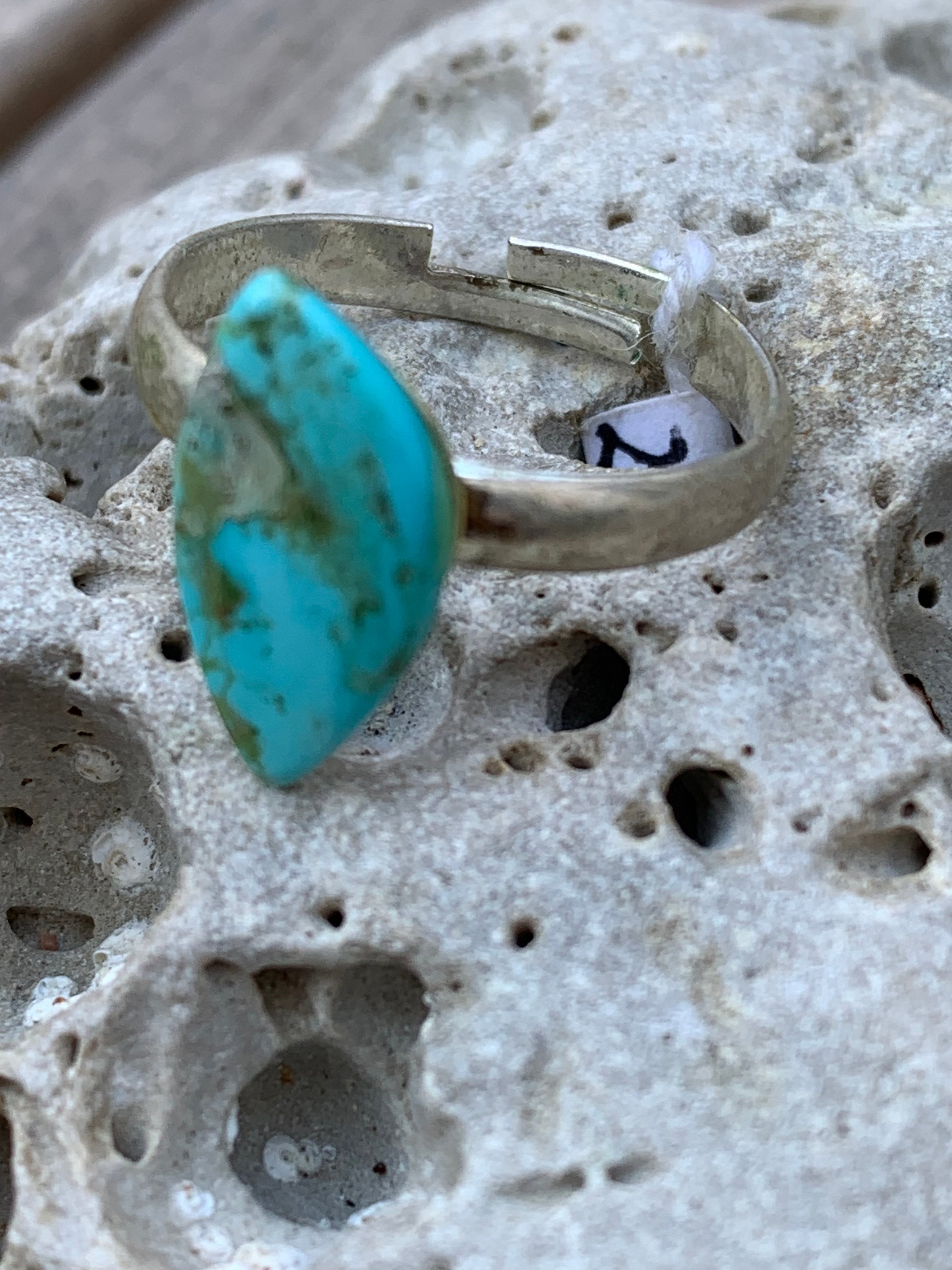 Bague en turquoise des U.S.A, non teintée, cabochon en pierre préparer par un bijoutier Irlandais, collée sur anneau pré-montée en laiton couleur argent ! Taille réglable d'environ 50 à 60 Fr.