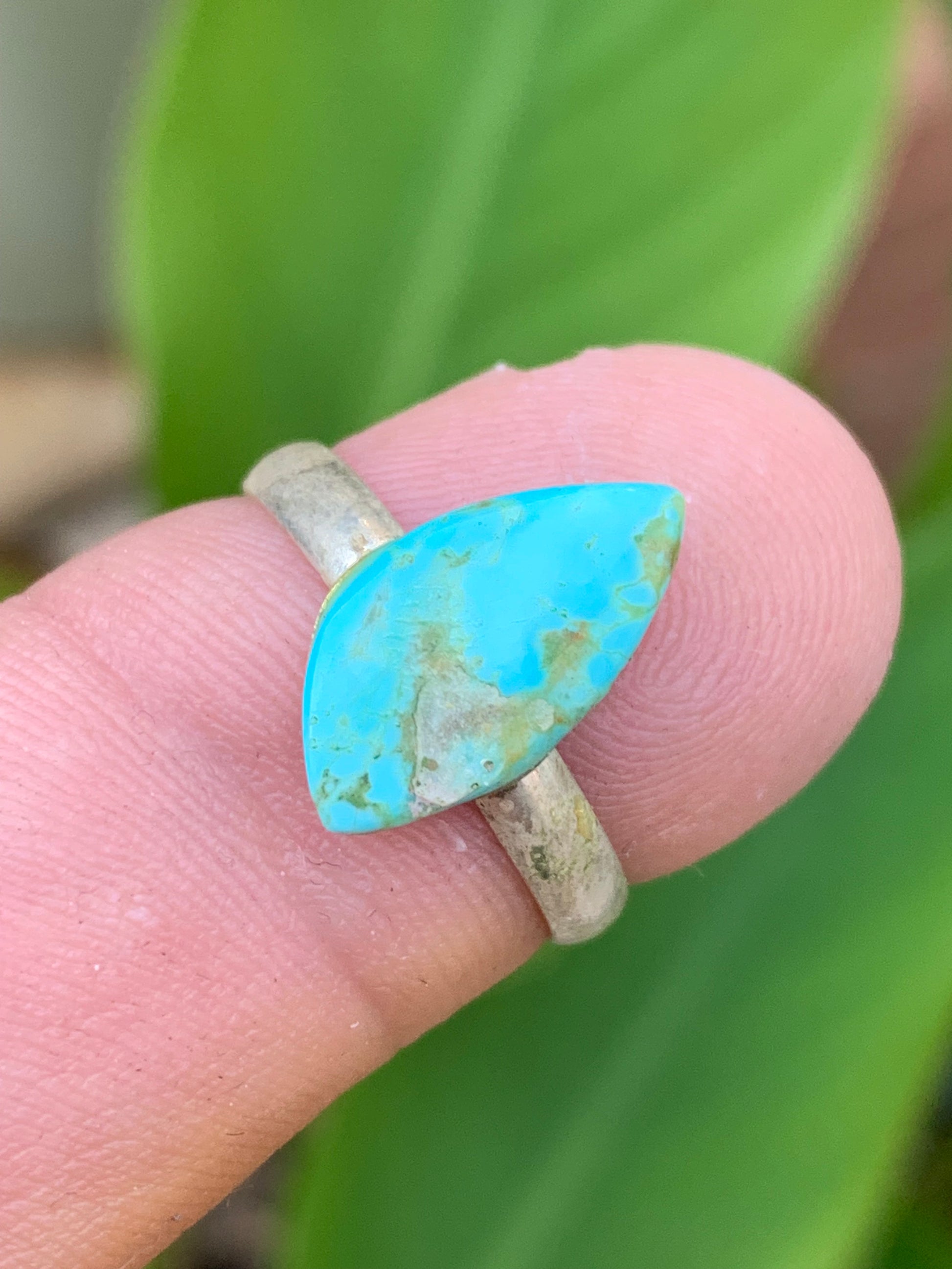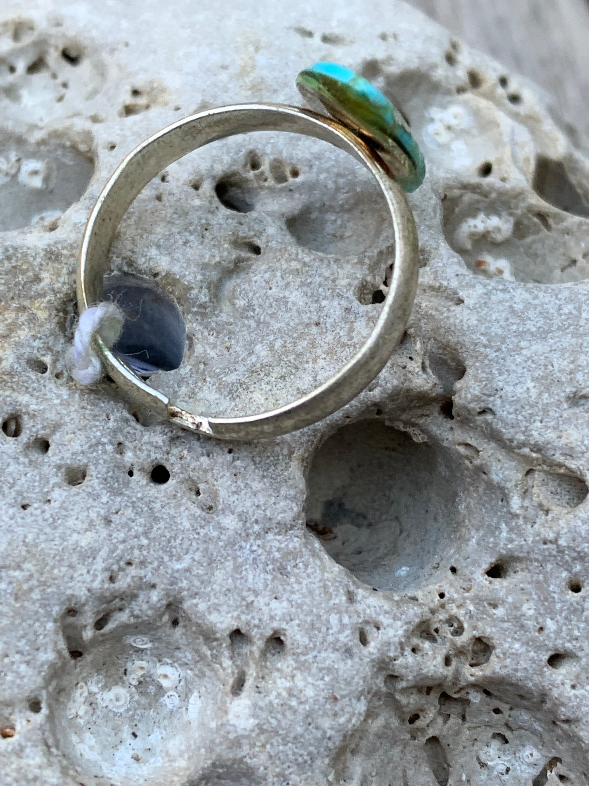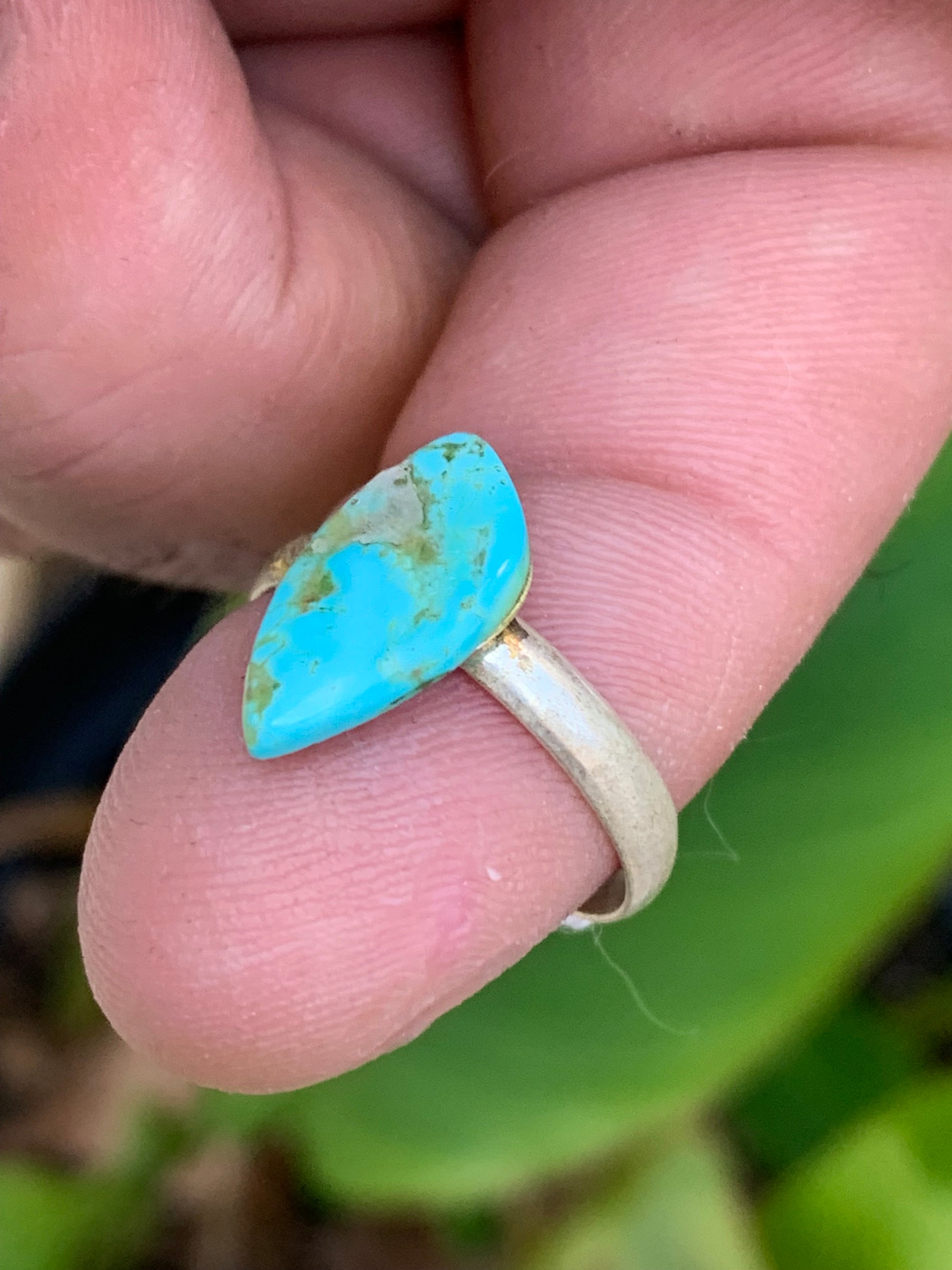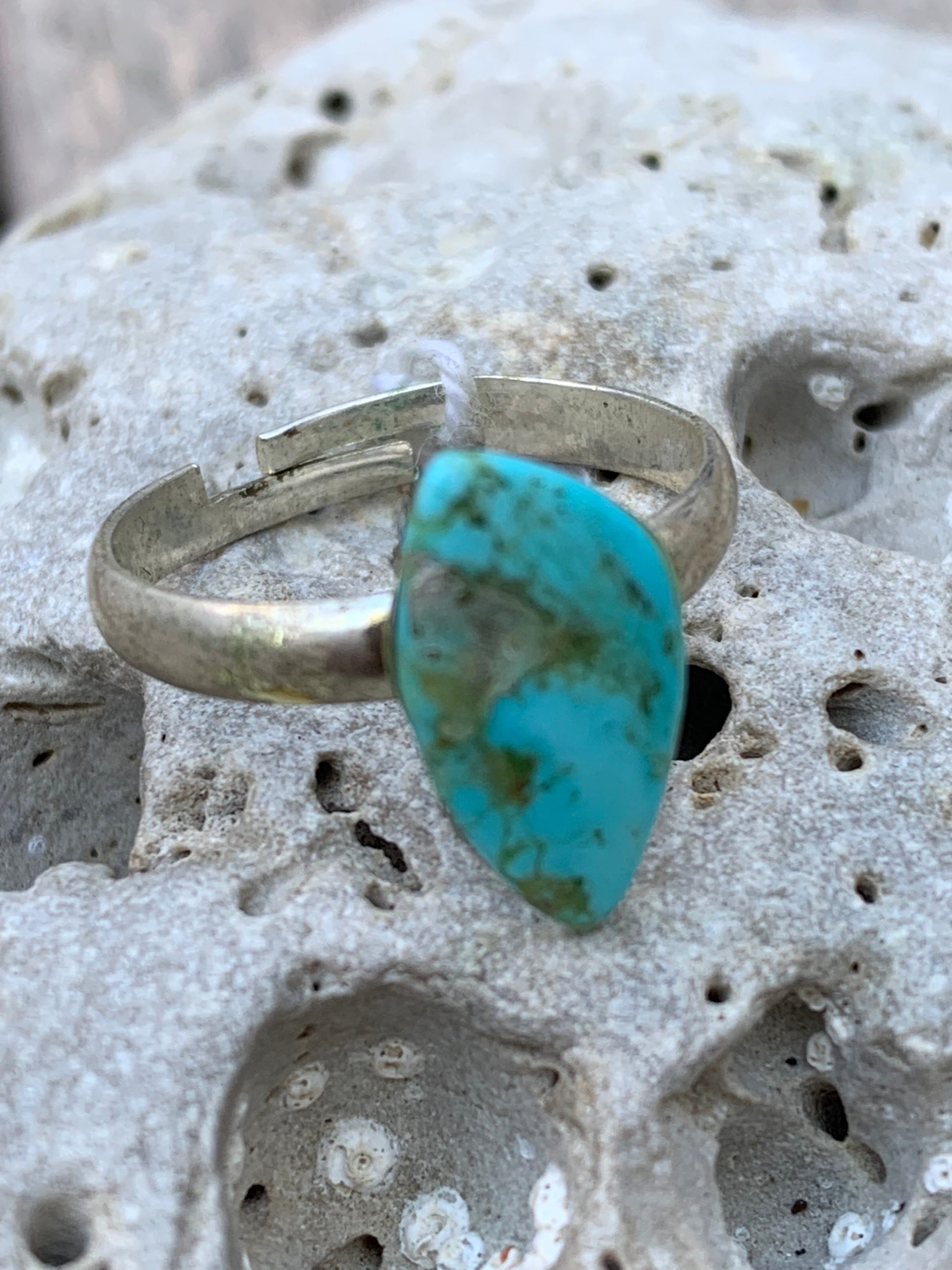 Bague en turquoise des U.S.A, non teintée, cabochon en pierre préparer par un bijoutier Irlandais, collée sur anneau pré-montée en laiton couleur argent ! Taille réglable d'environ 50 à 60 Fr.