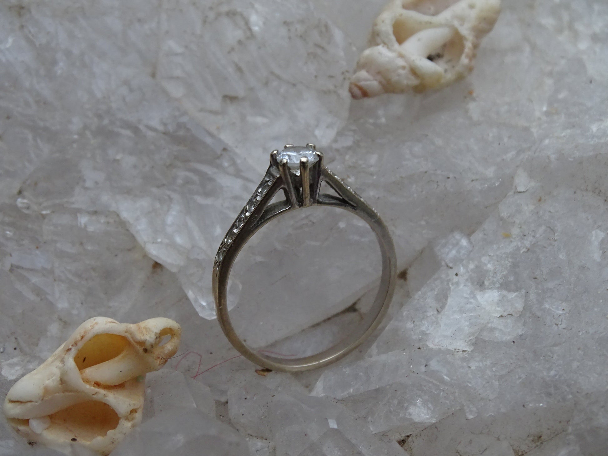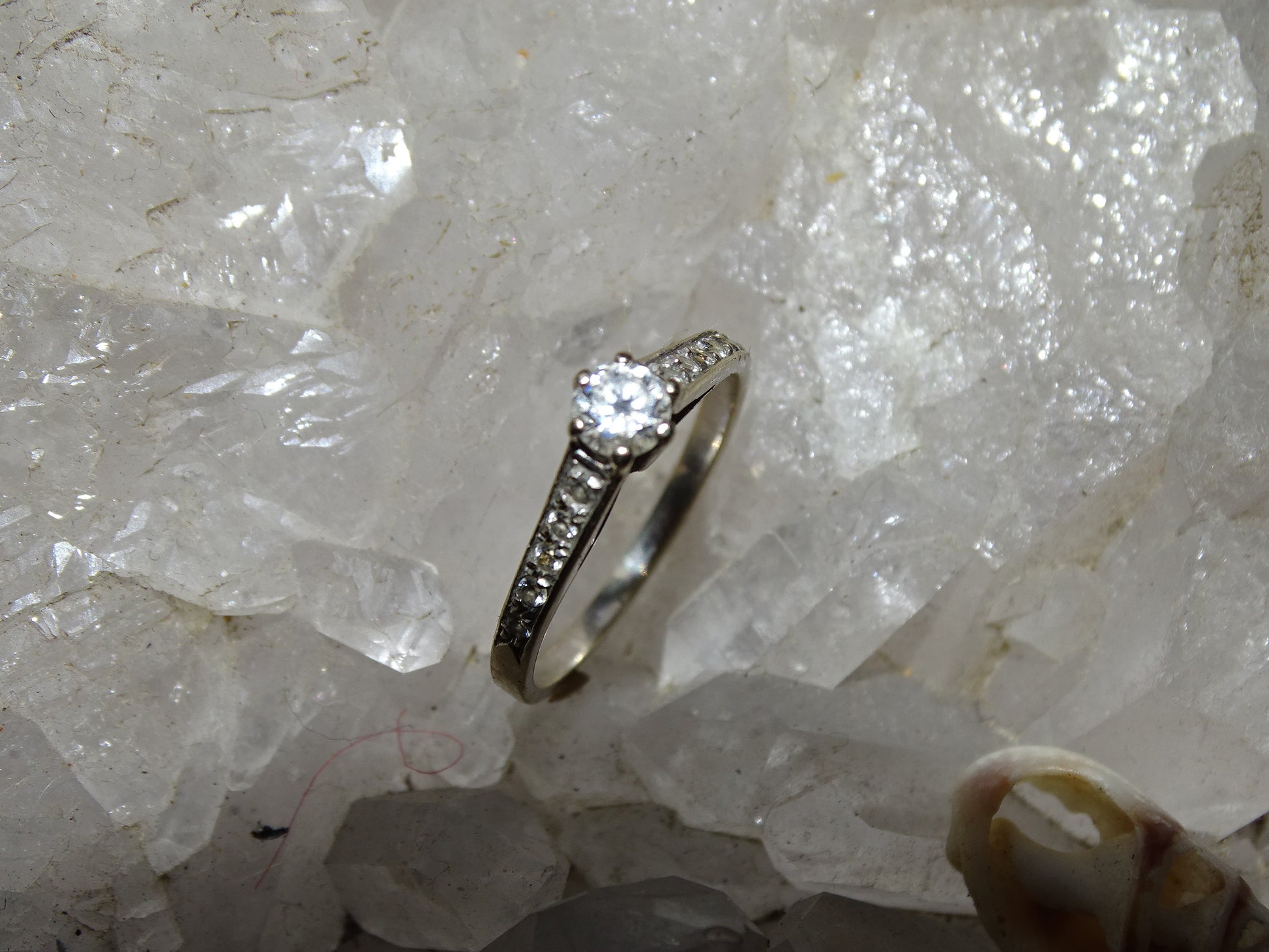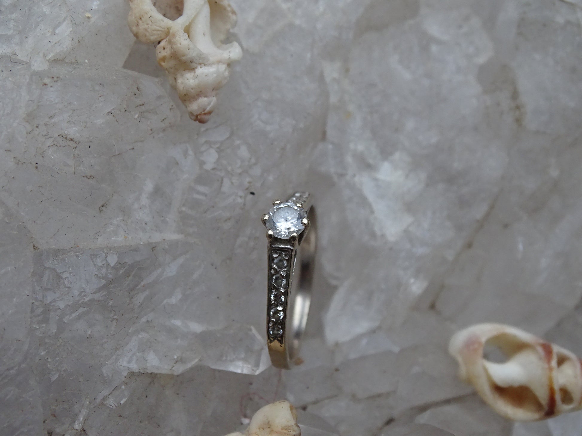 Bague haut de gamme, 'Solitaire' Or gris oxydes zirconium, 9 carats - 1,8 grammes (Taille 53 Fr). Très belle qualité pour ce joyau et ses 10 satellites en oxyde de zirconium ! Parfait !