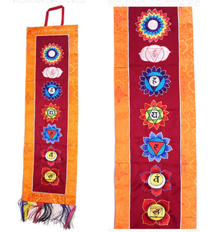 Bannière verticale, de 19 centimètres de largeur x 70 centimètres de hauteur, avec broderies de motifs 7 chakras... Parfait pour les portes, murs, rituels, salons... !