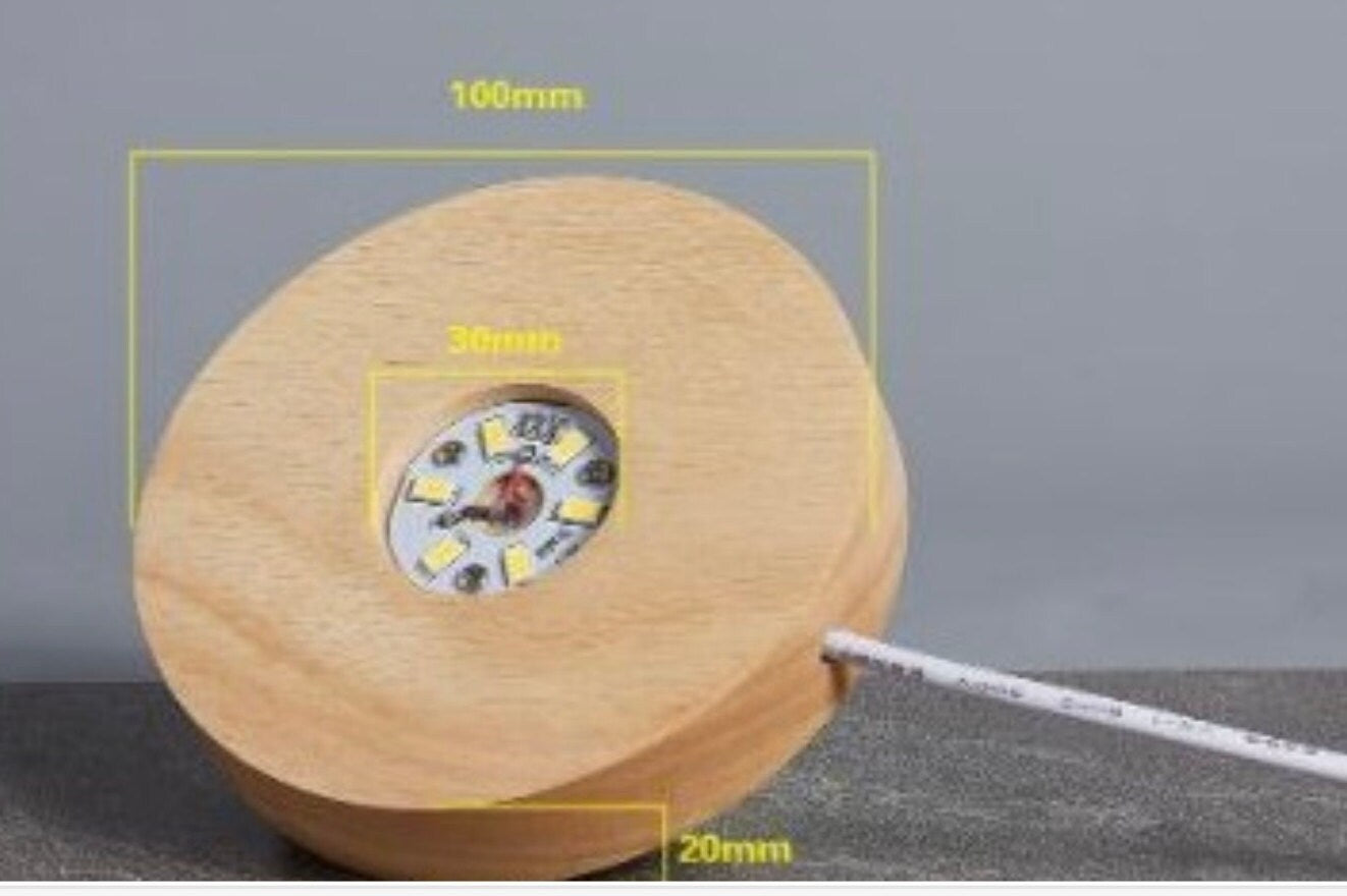 Base LED en bois avec adaptateur USB pour éclairer vos plus belles pièces. Dimensions (Ø x H) : 10 x 2 cm Puissance : 5V Vendu avec son adaptateur USB/220V. Peut être utilisé pour les lampes en sélénite, les prismes, pointes et sphères., parfait !