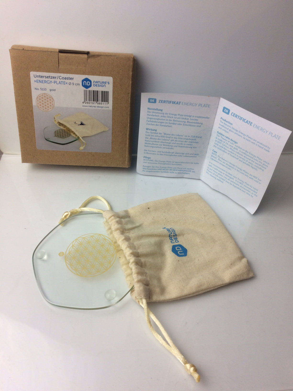 Energyplate (sous-verre et dessous de plat) de chez 'Natur Design', de 9 ou 22 centimètres. Avec gravure de la fleur de vie en Or 23,8 carats. Verre sans plomb ni métaux lourd !