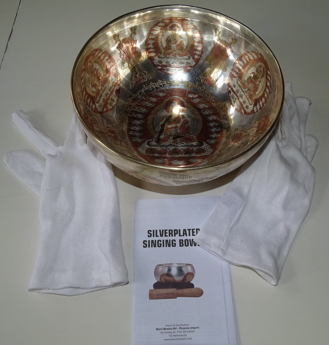 Bol chantant plaqué Argent, 4 tailles (20-30 cm), décor Bouddha et symboles auspicieux. Livré avec maillet & gant.