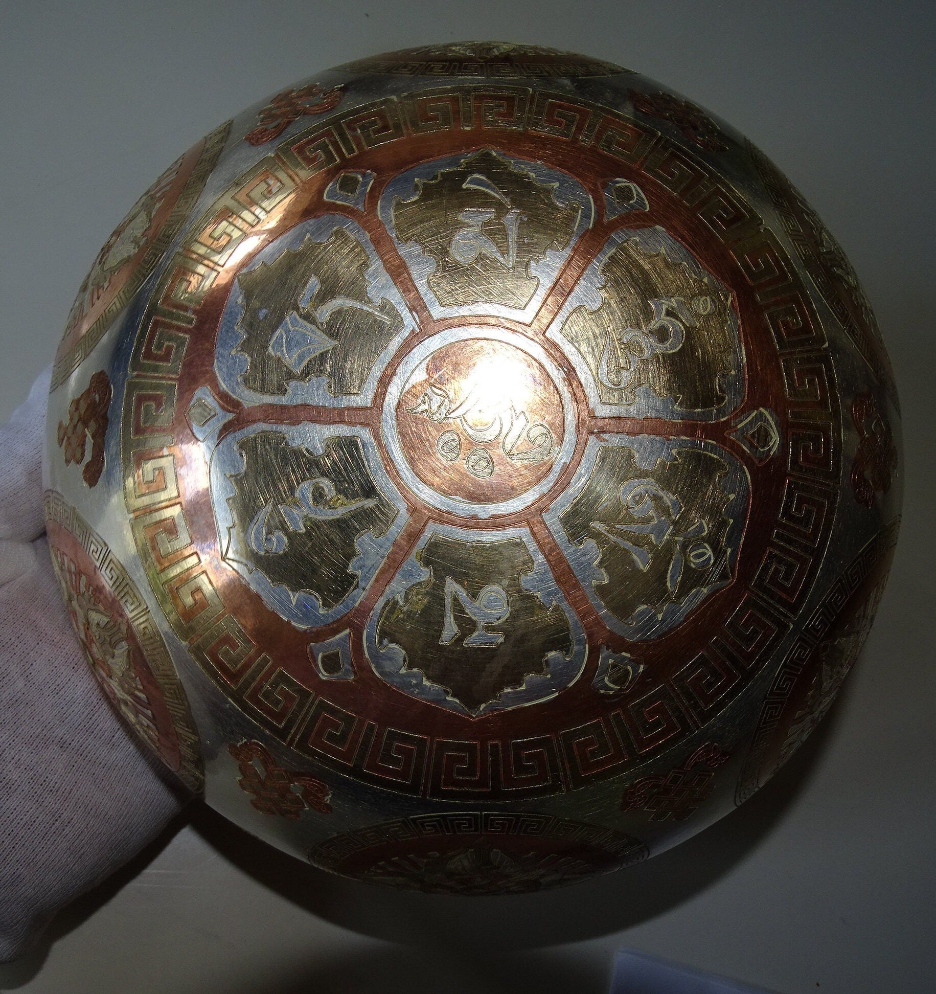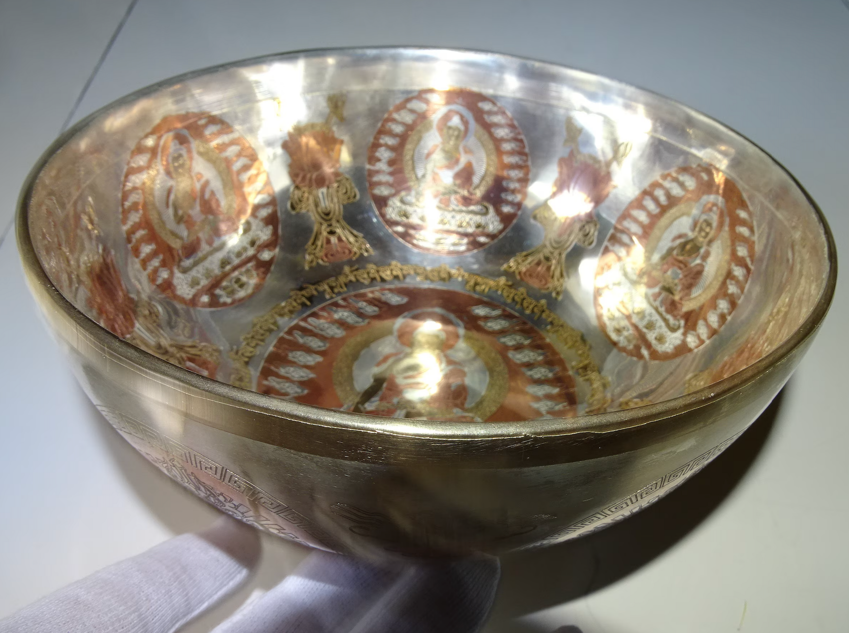 → Bol chantant orné de gravures du Bouddha Shakyamuni et des cinq bouddhas Dhyani et de symboles de bon augure tels que le double dorje, le lotus et le nœud sans fin, ainsi que le mantra de compassion « Om Mani Pad Me Hum ».