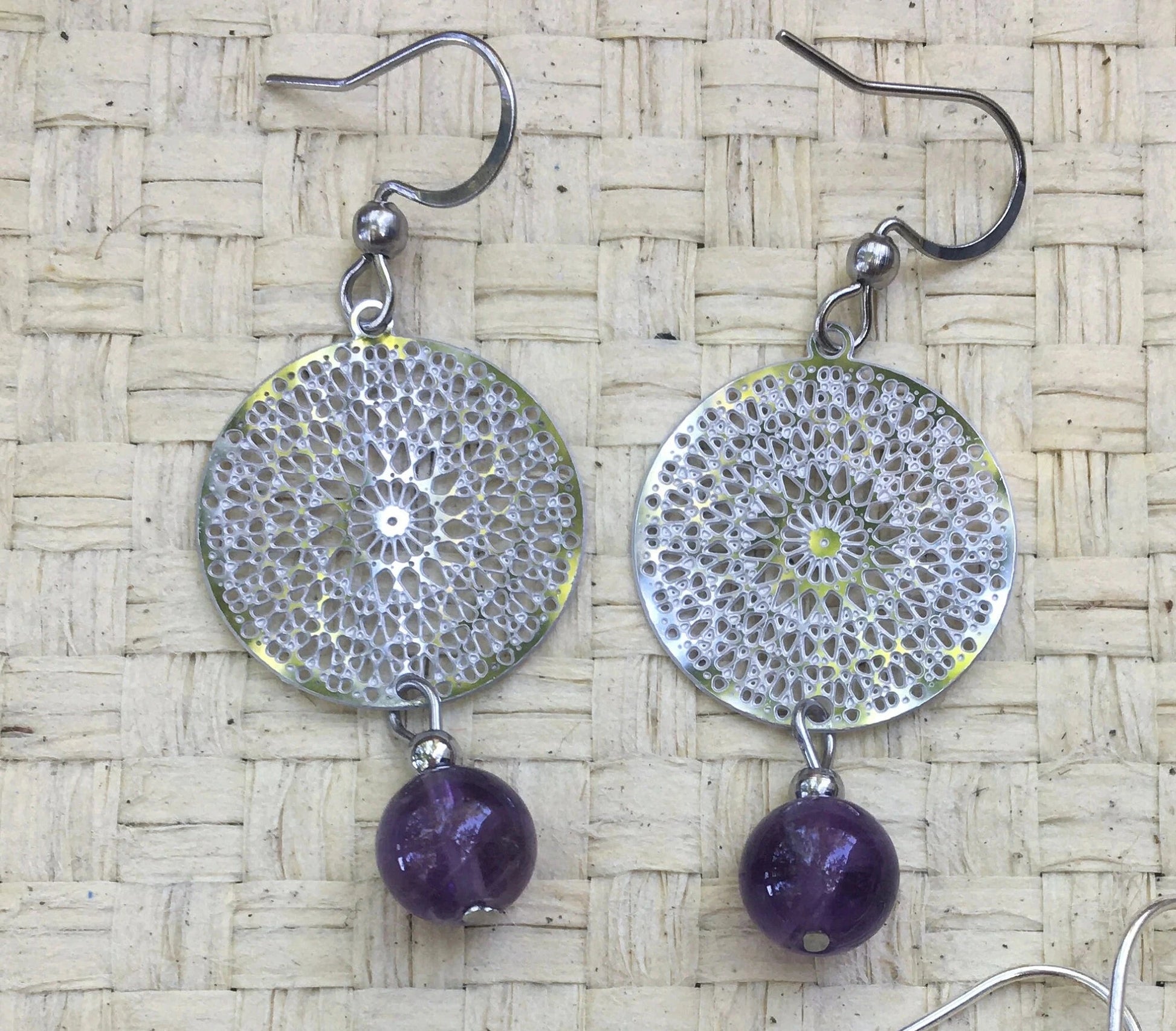 Boucles d'oreilles en Améthyste avec un superbe Mandala en Argent où est suspendue une perle ronde, qualité AA à AAA. Finition Argent 925 !