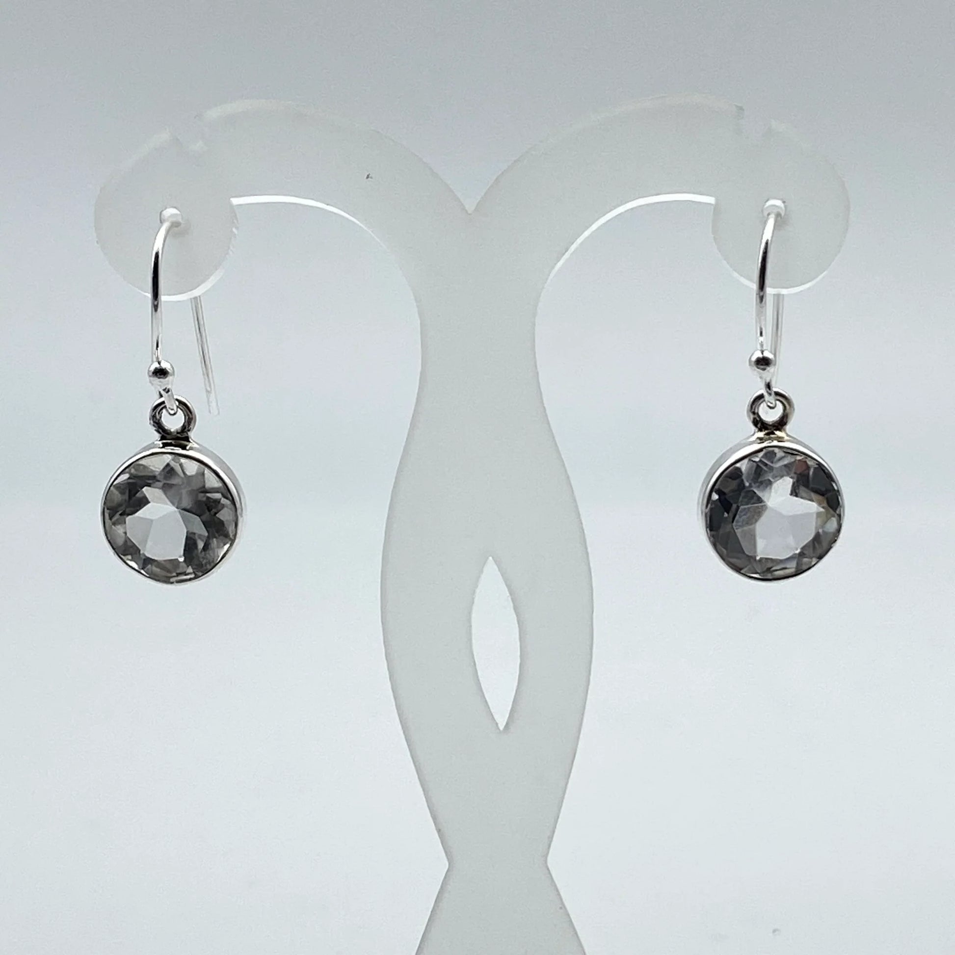 Boucles d'oreilles en Cristal de Roche (quartz), cabochon sertis de formes rondes, qualité AA à AAA. Vendu en finition Argent, parfait !