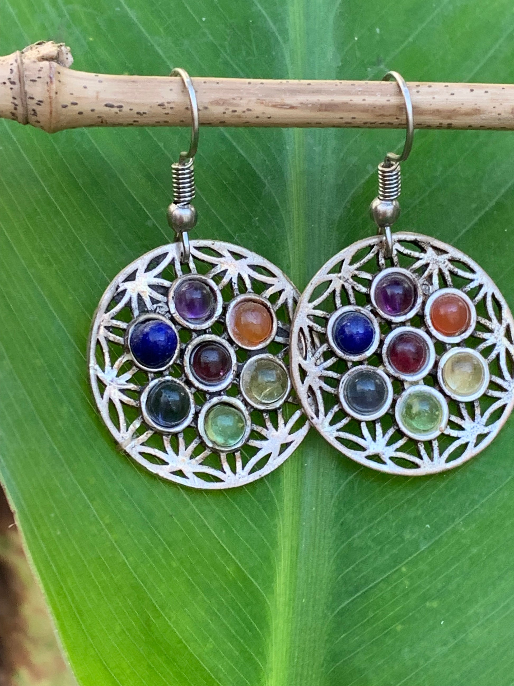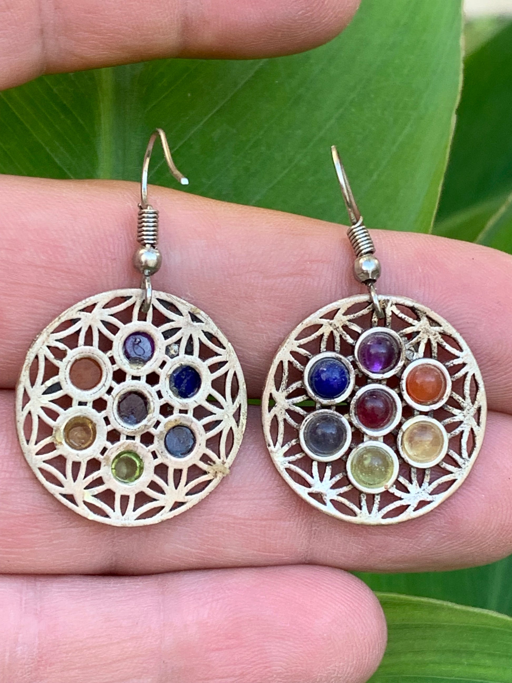 Boucles d'oreilles en forme de fleur de vie et pierres sertis aux couleurs des 7 chakras, 25 millimètres de diamètre, finition laiton argenté, parfait !