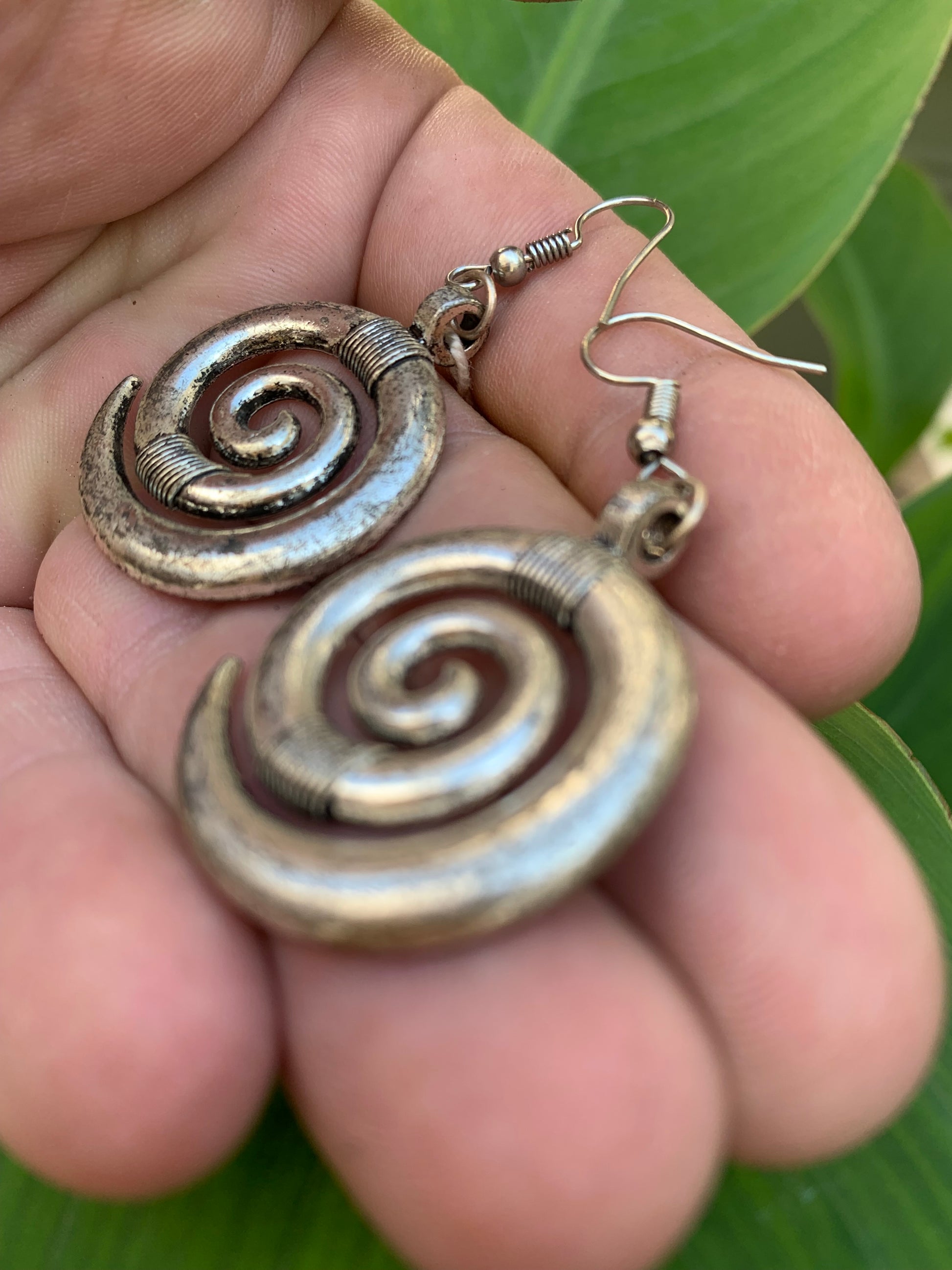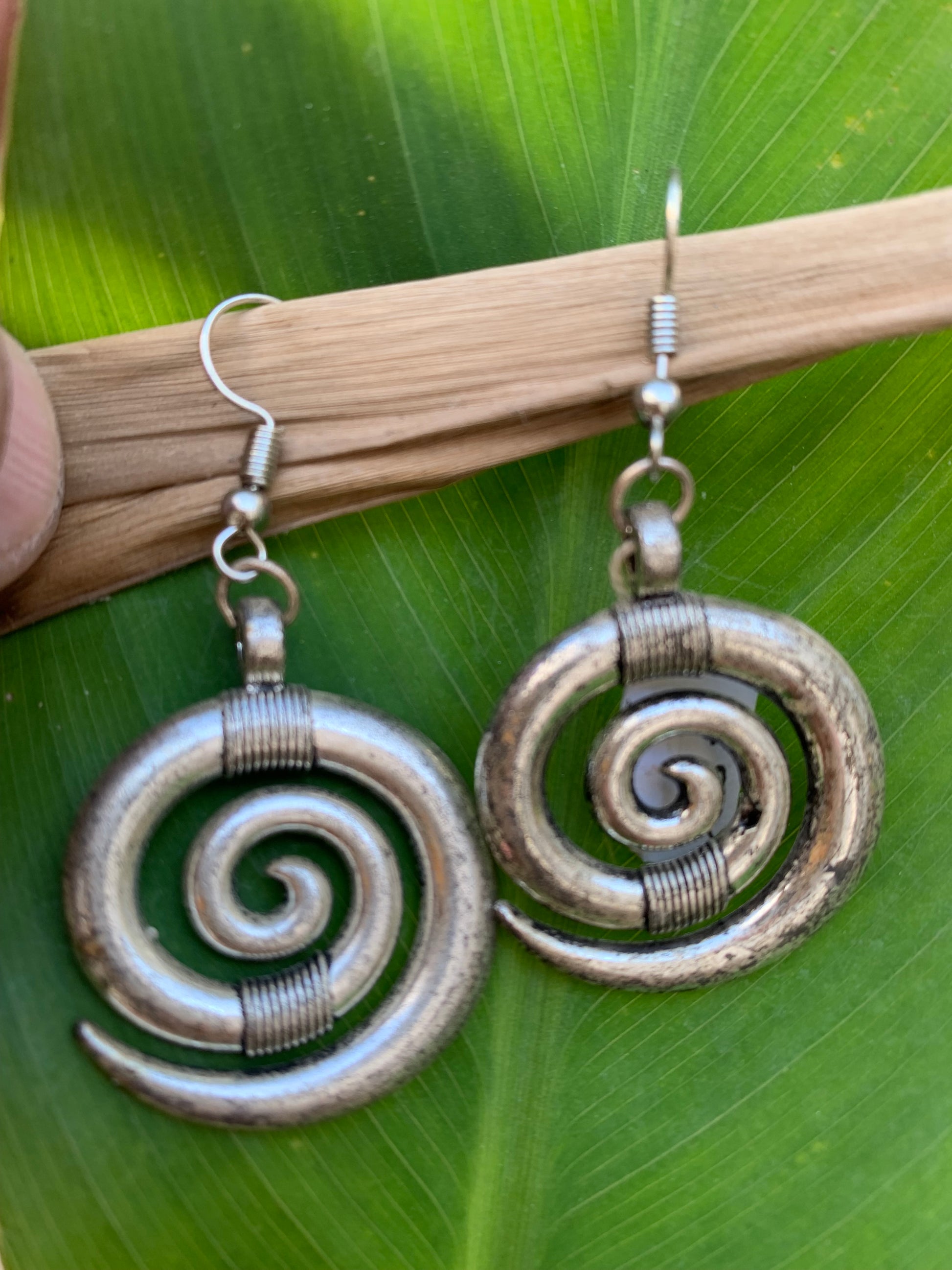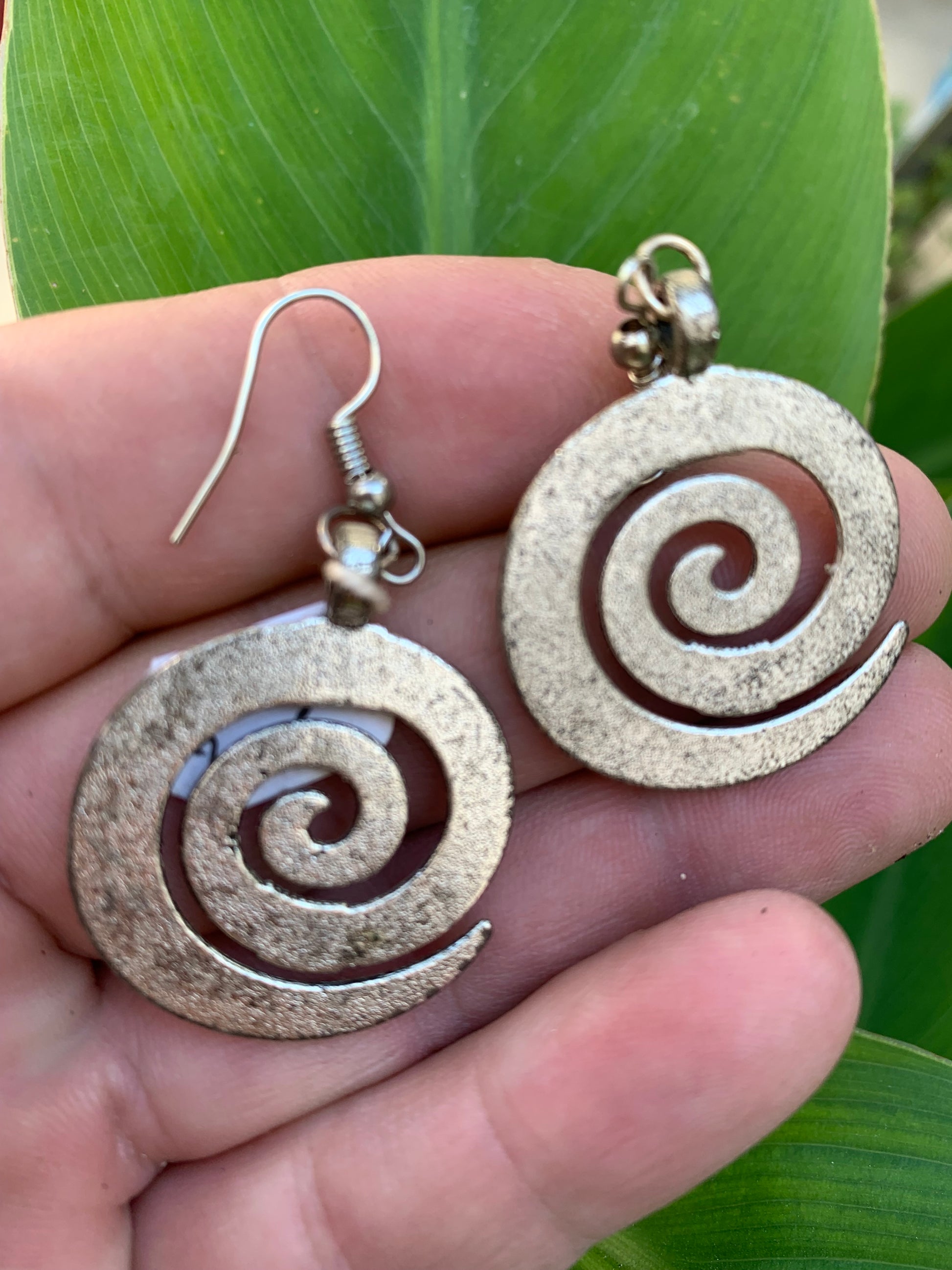 Boucles d'oreilles en forme de spirale de 30 millimètres de diamètre, hauteur totale de 55 mm. Finition laiton argenté, très beau modèle, parfait !