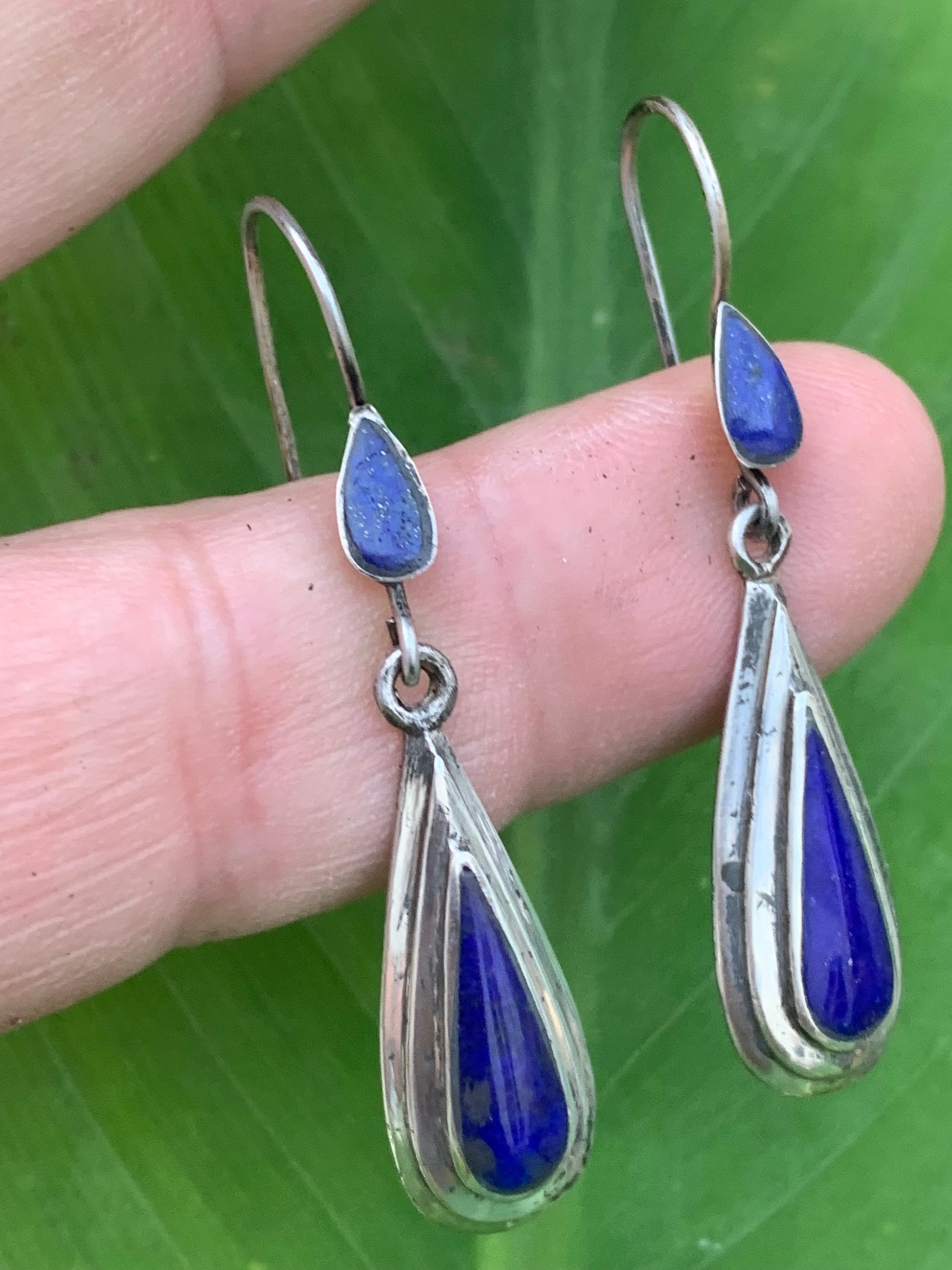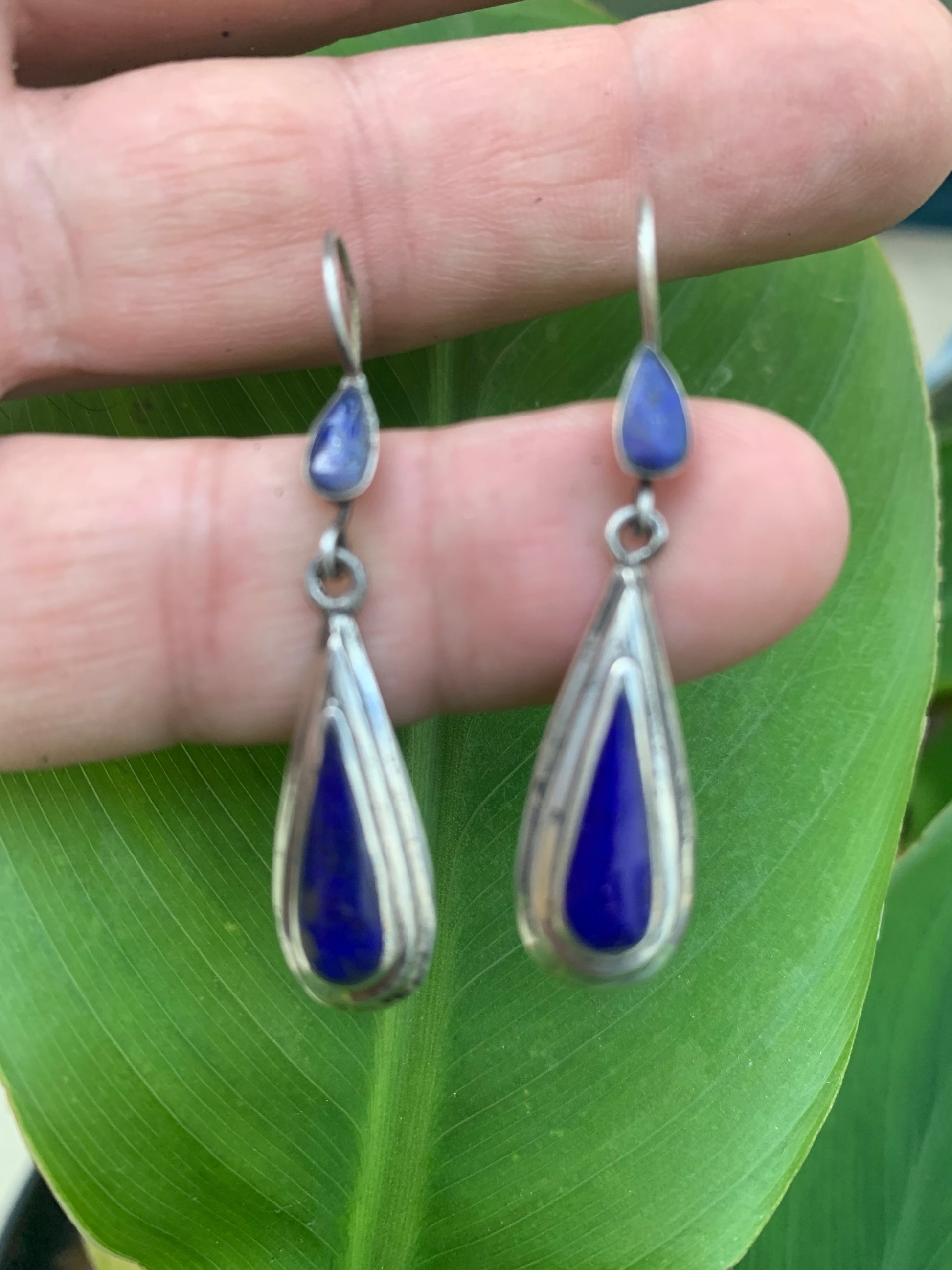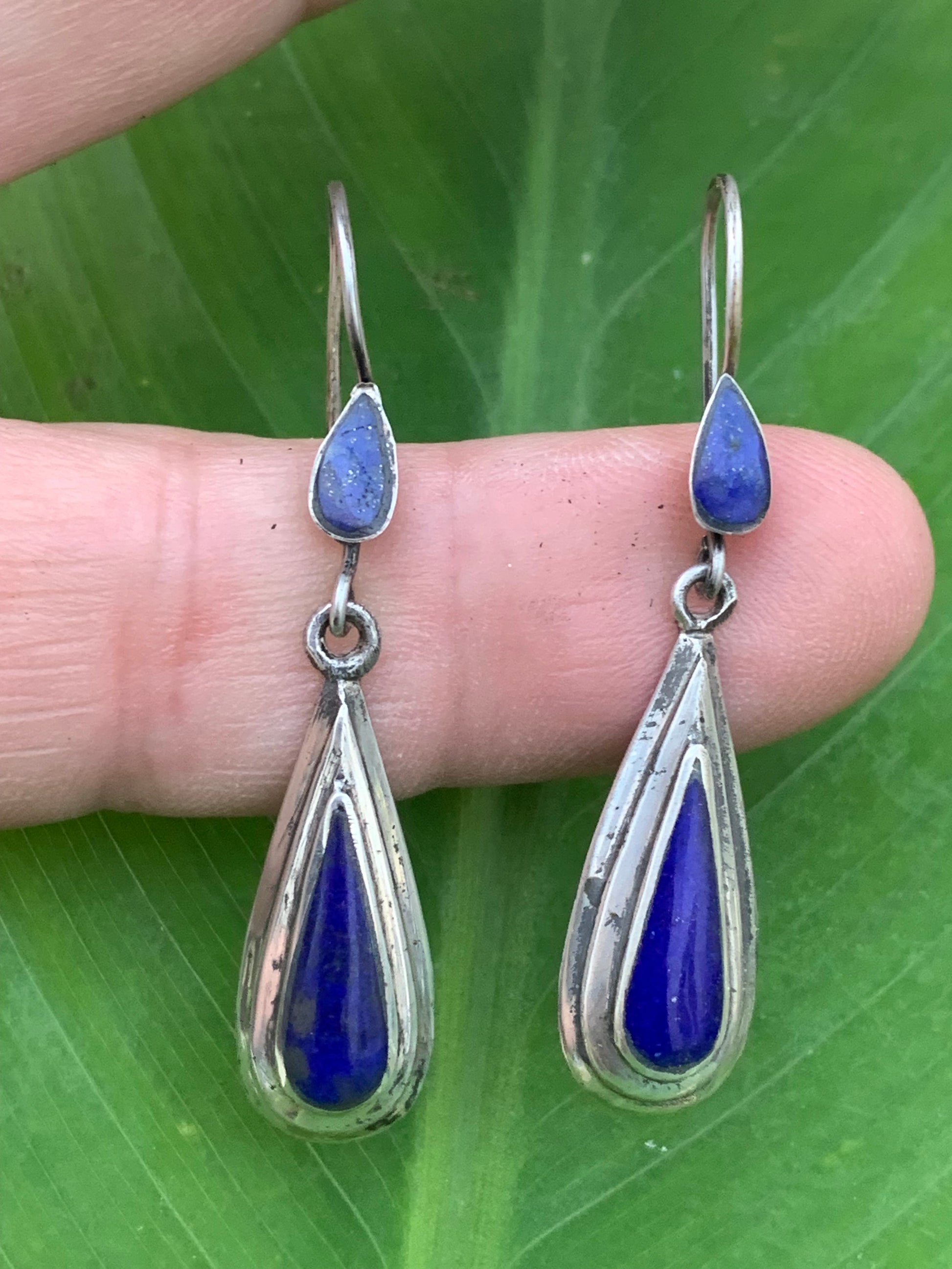 Boucles d'oreilles en Lapis lazuli, cabochons sertis en formes de 'goutte', qualité AA à AAA. Vendu en finition Argent, parfait !