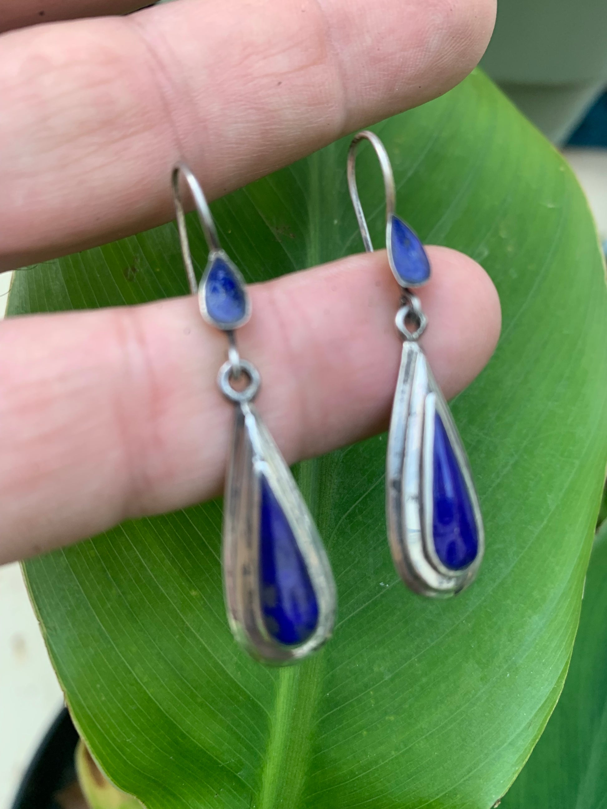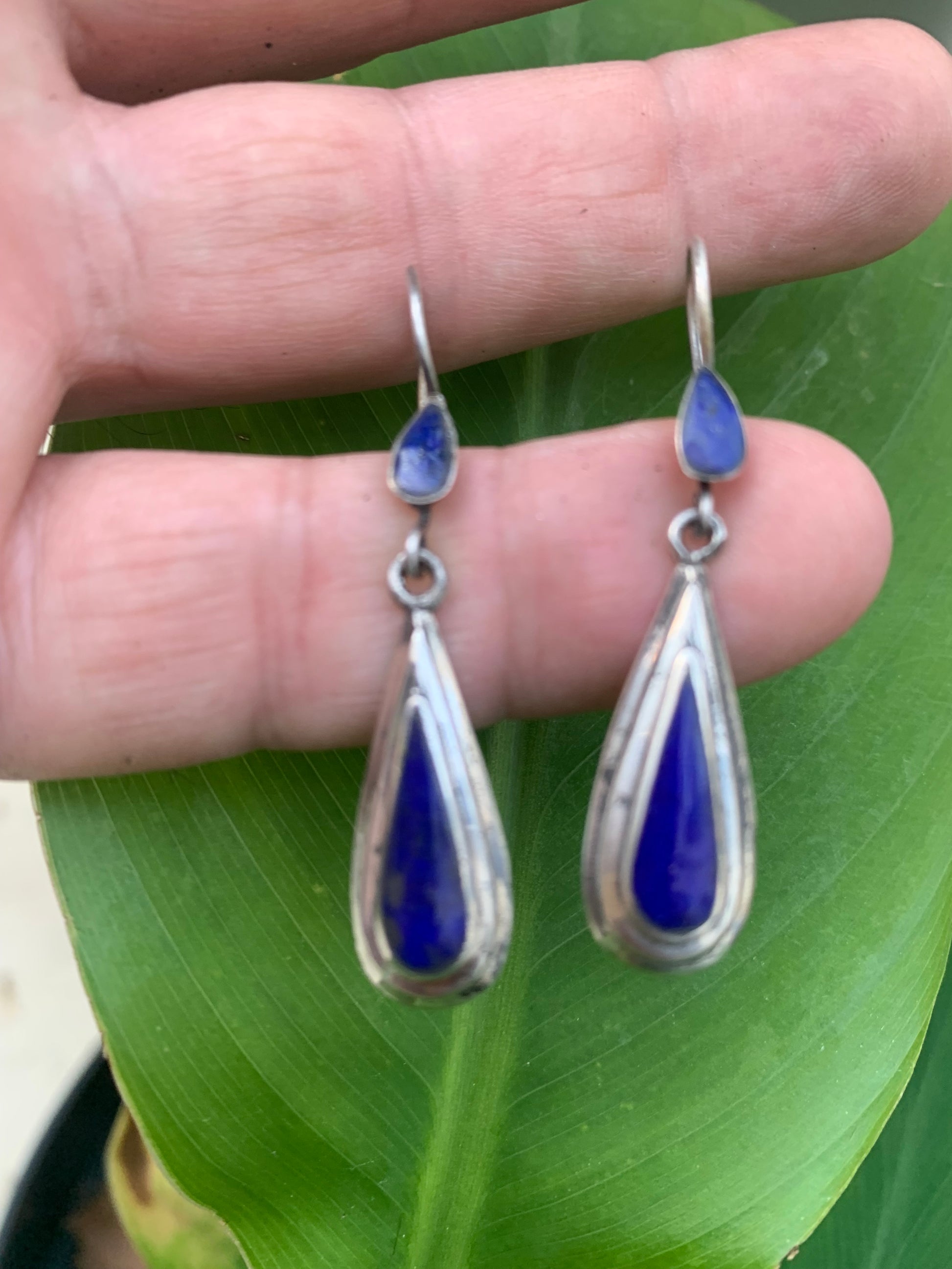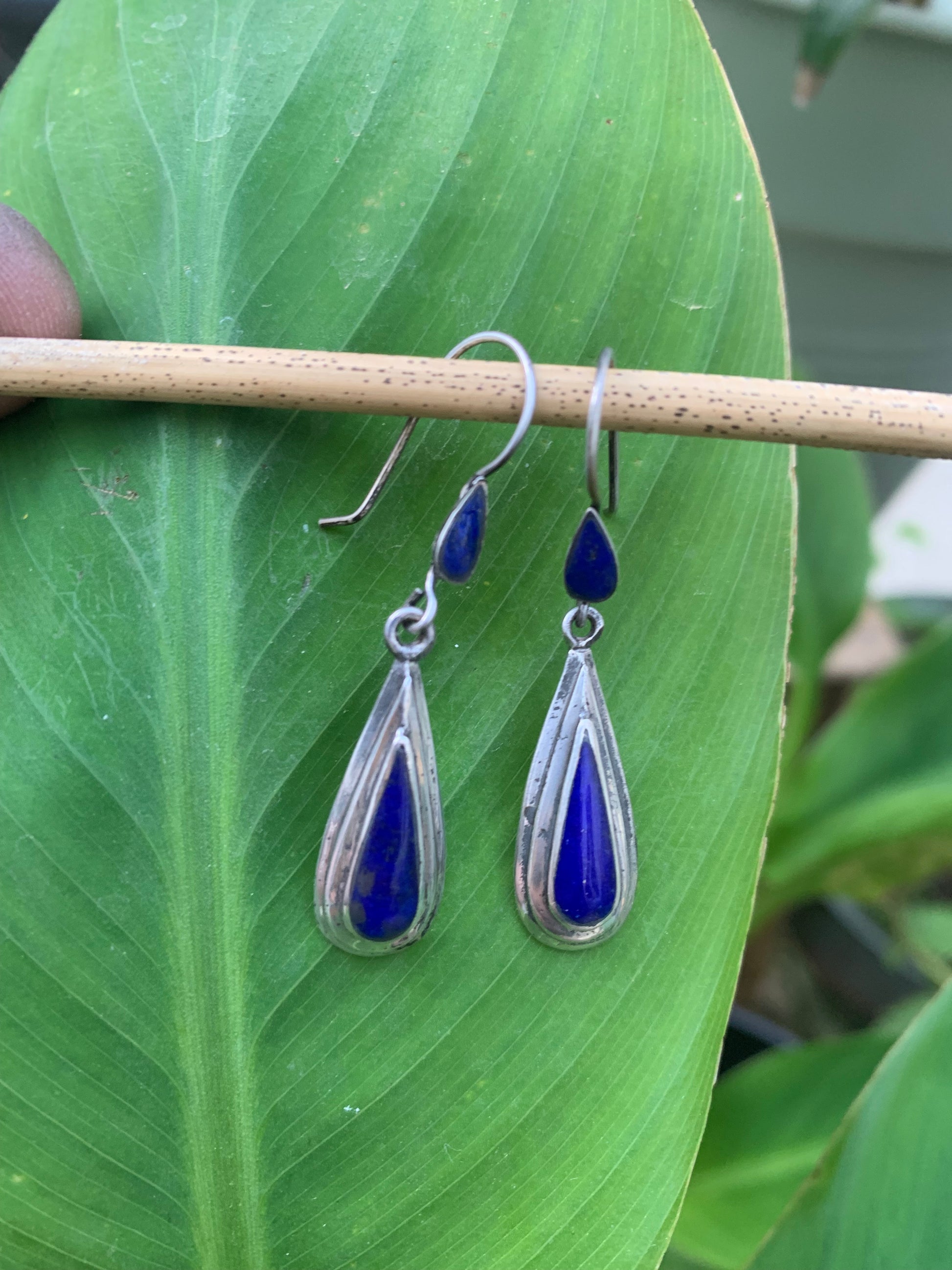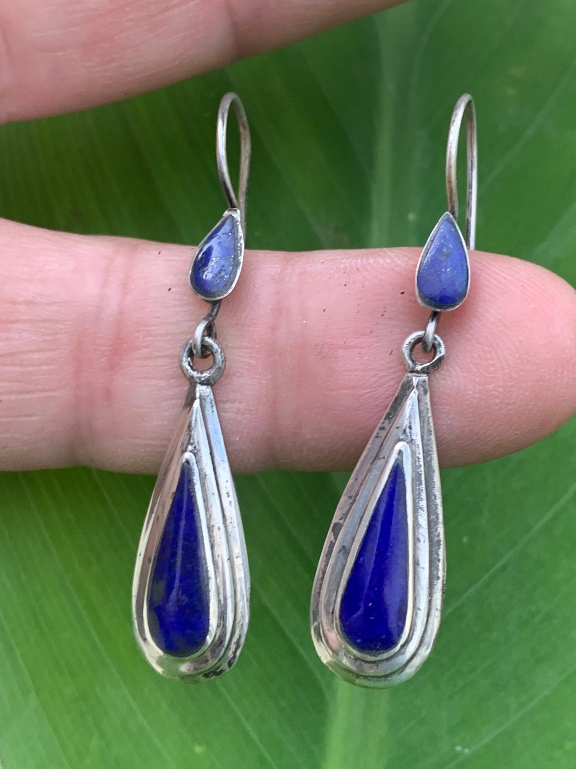 Boucles d'oreilles en Lapis lazuli, cabochons sertis en formes de 'goutte', qualité AA à AAA. Vendu en finition Argent, parfait !