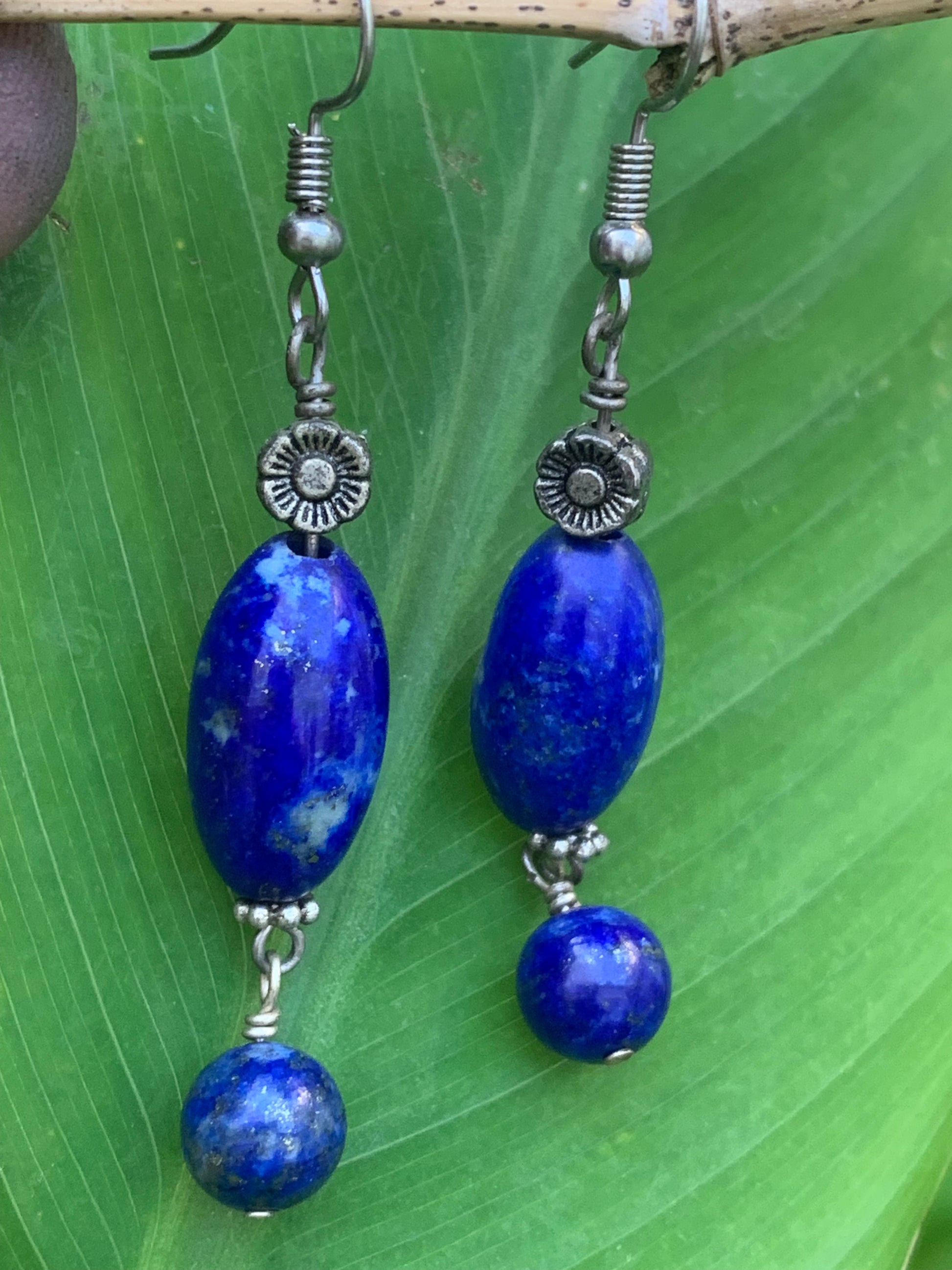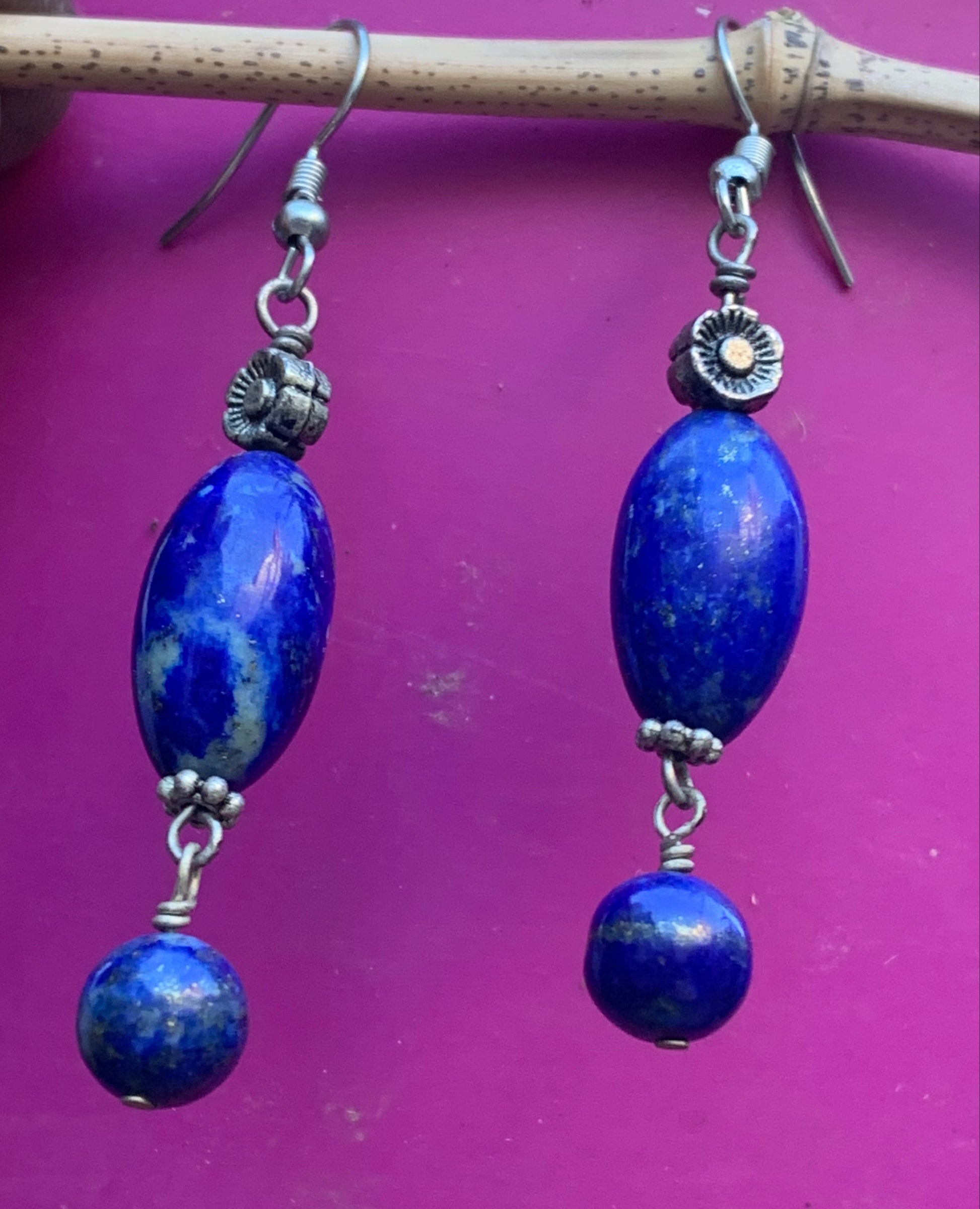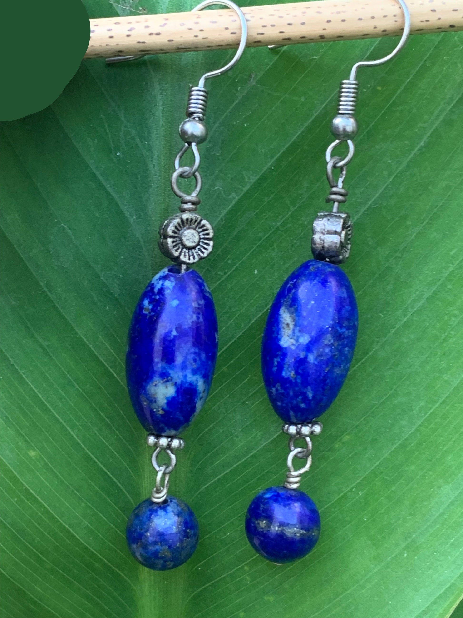 Boucles d'oreilles en Lapis lazuli, perlages sur tiges avec fantaisies, qualité AA à AAA. Vendu en finition Argent ou laiton argenté, parfait !