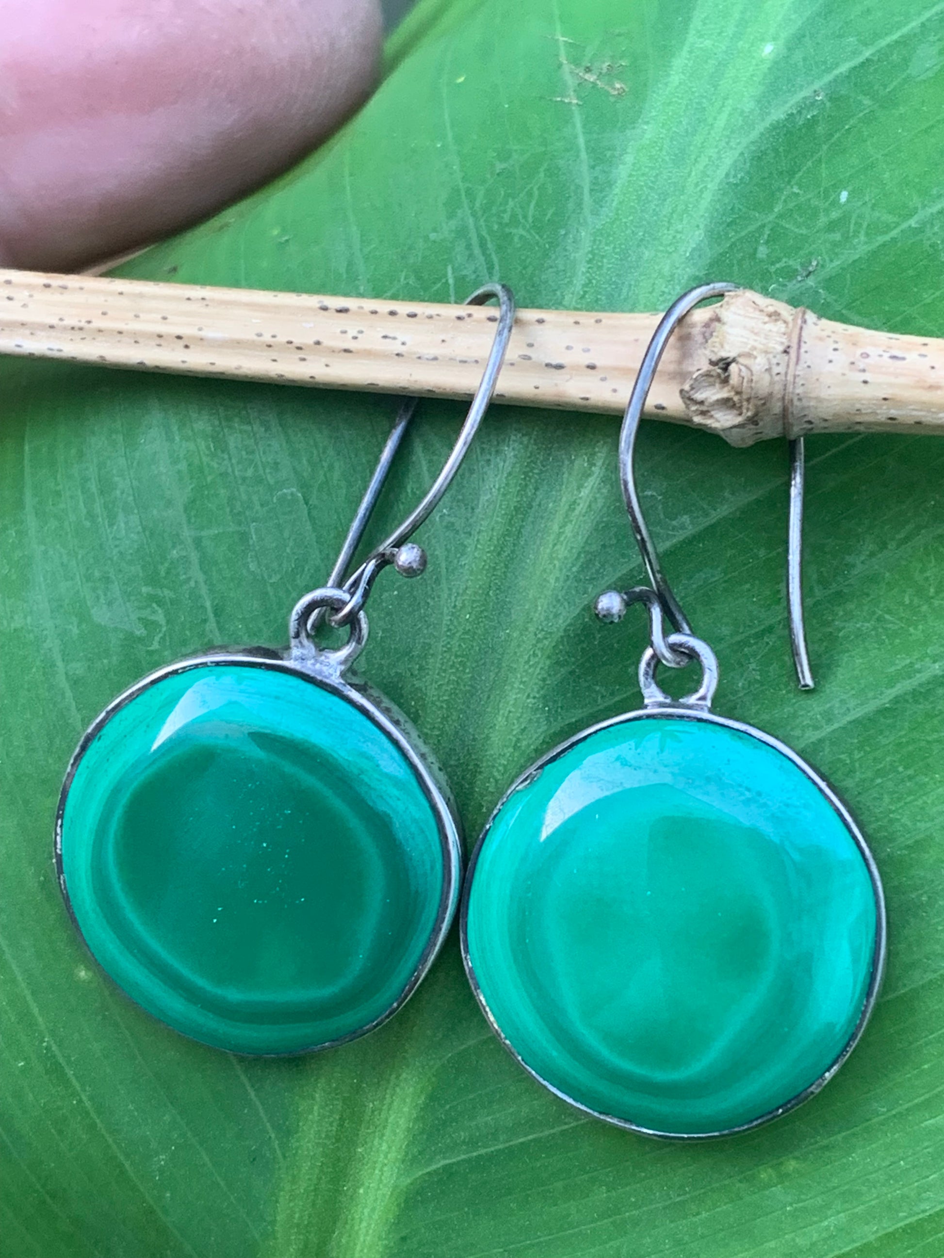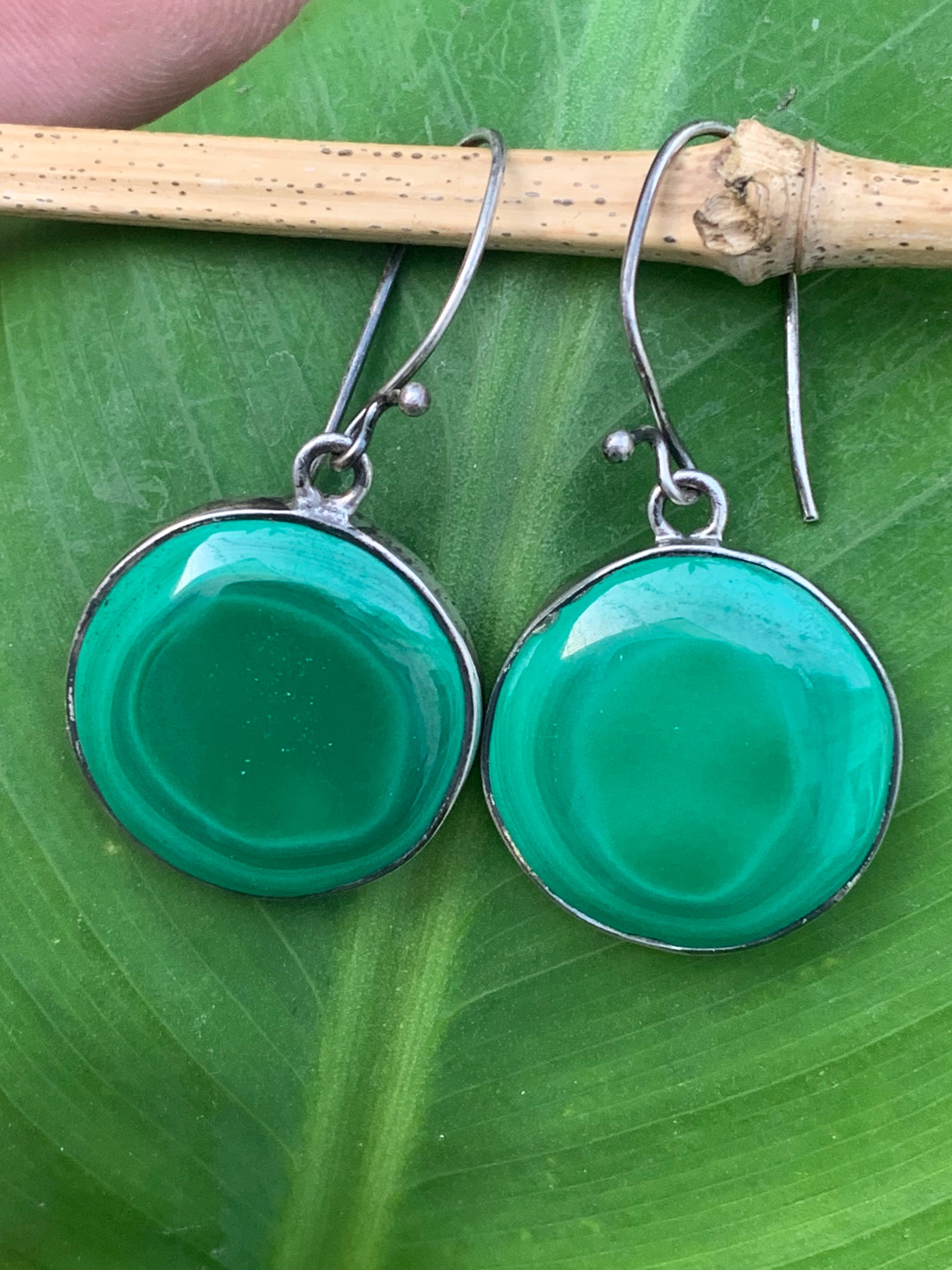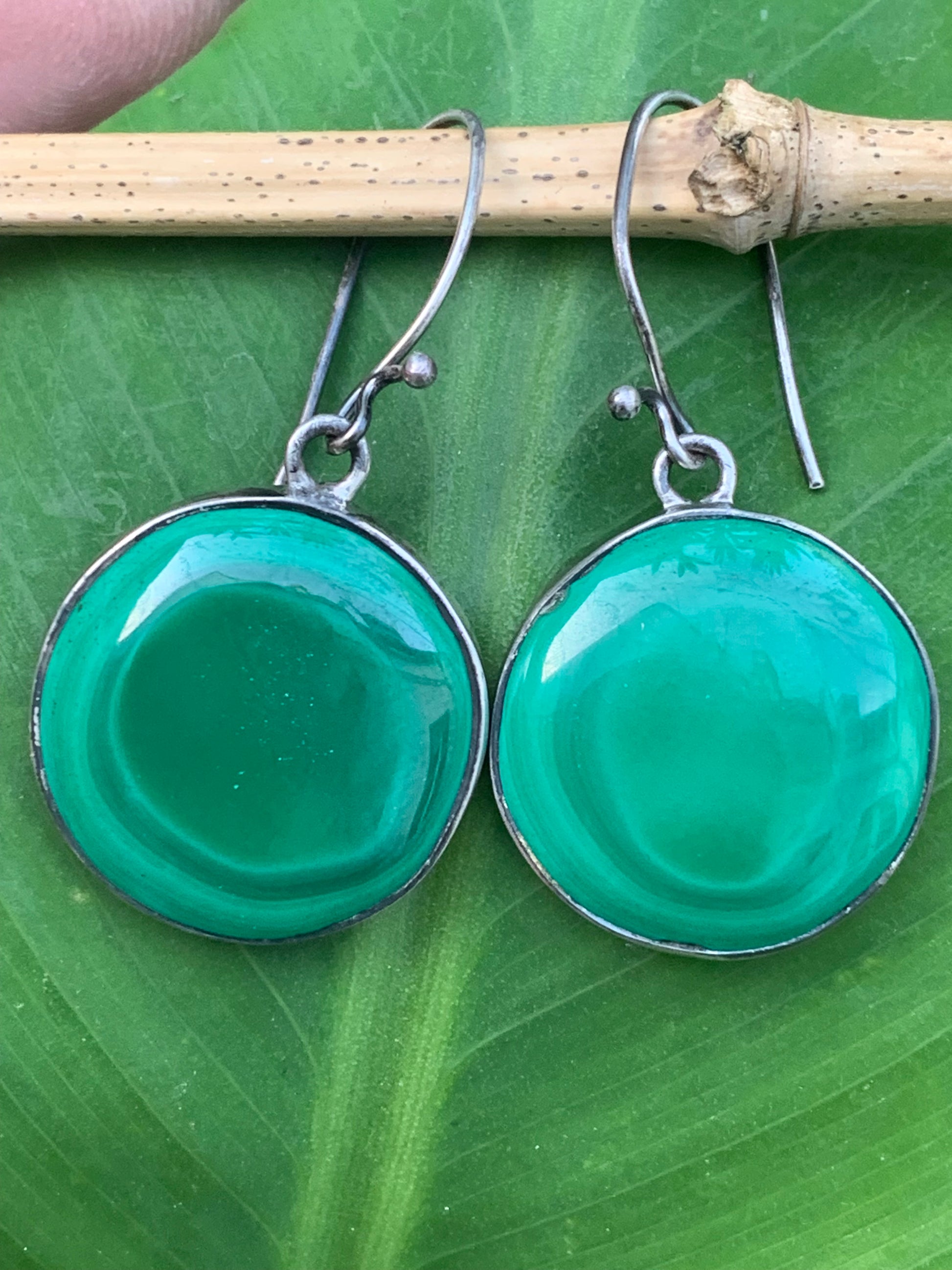 Boucles d'oreilles en Malachite, cabochons de 25mm sertis Argent 0.925, superbes pièces de qualité AA à AAA, parfait !