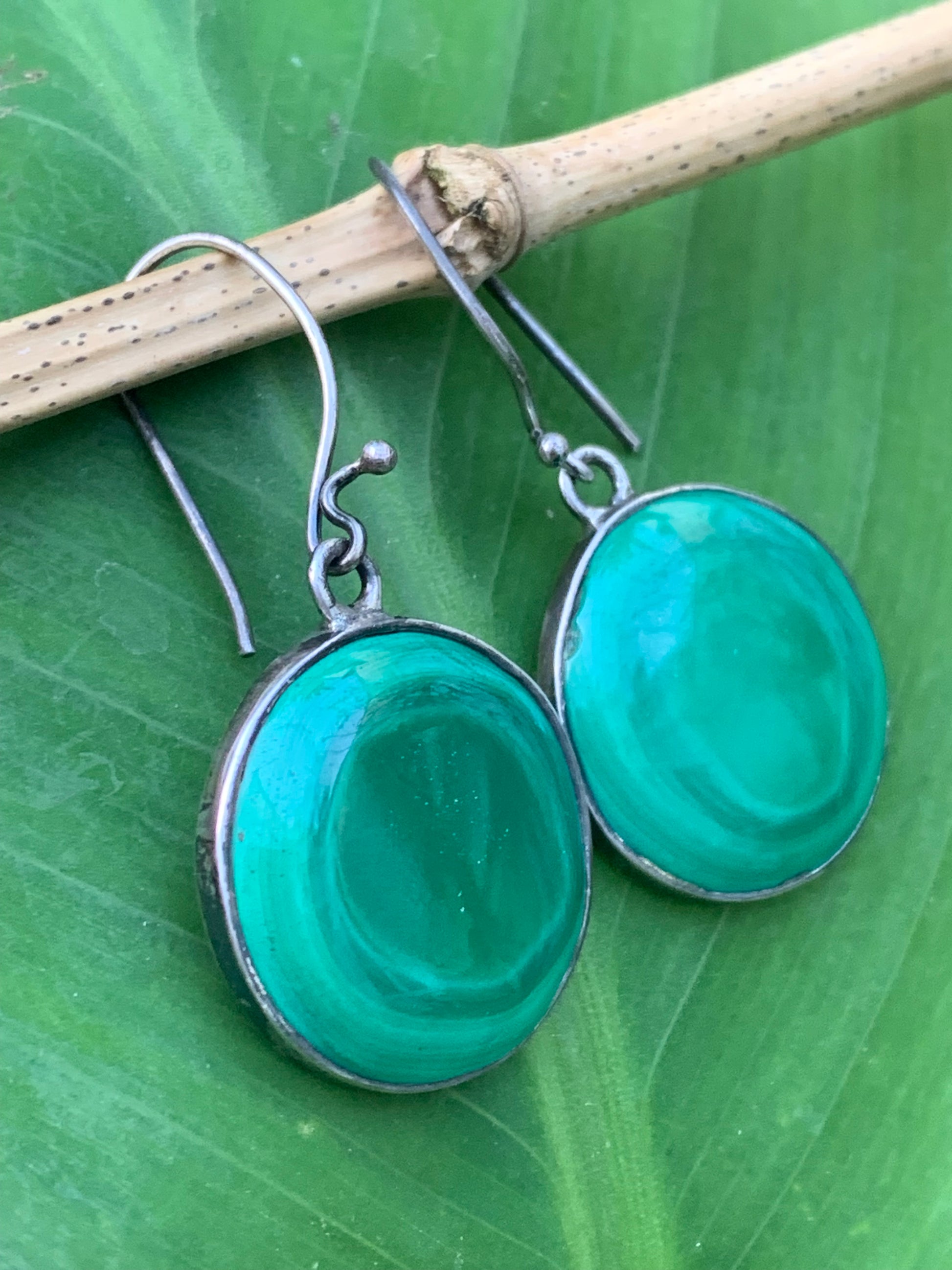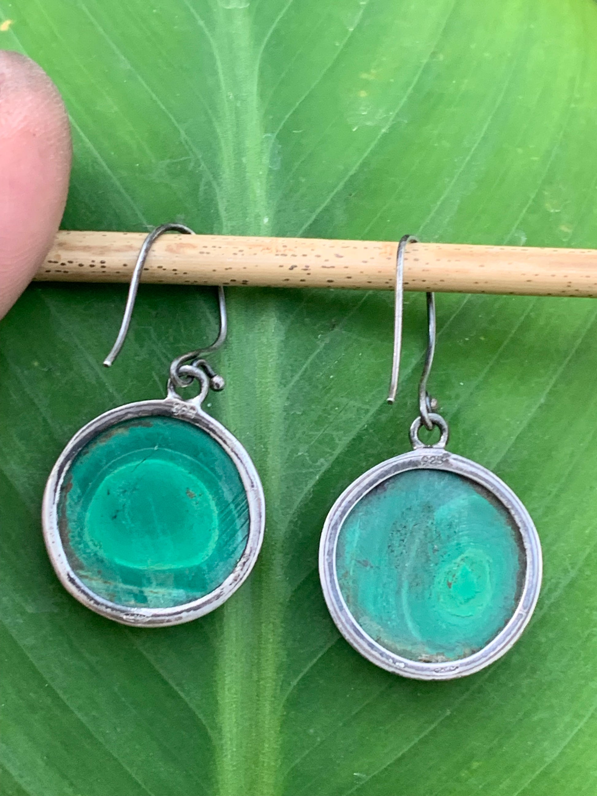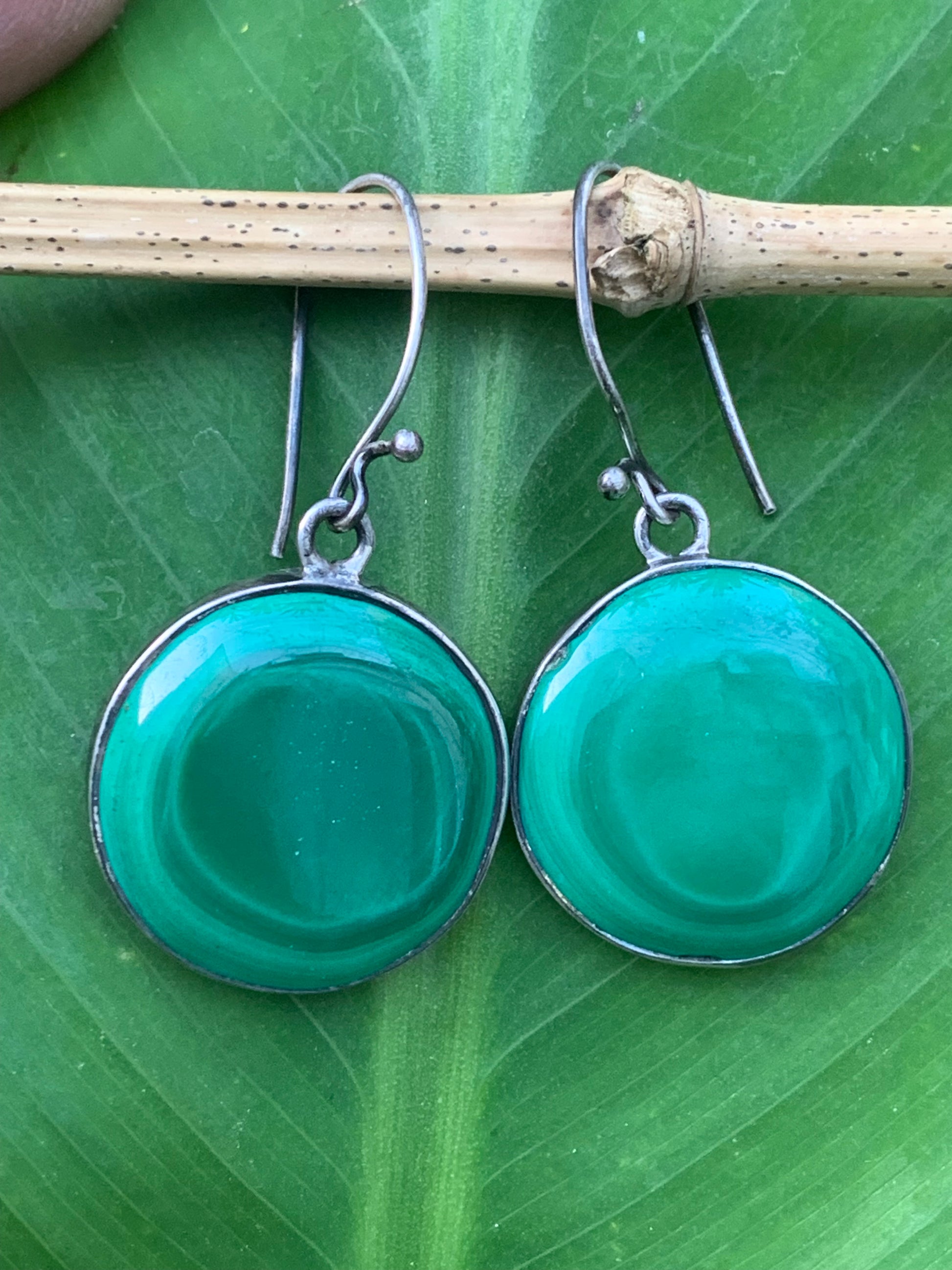 Boucles d'oreilles en Malachite, cabochons de 25mm sertis Argent 0.925, superbes pièces de qualité AA à AAA, parfait !