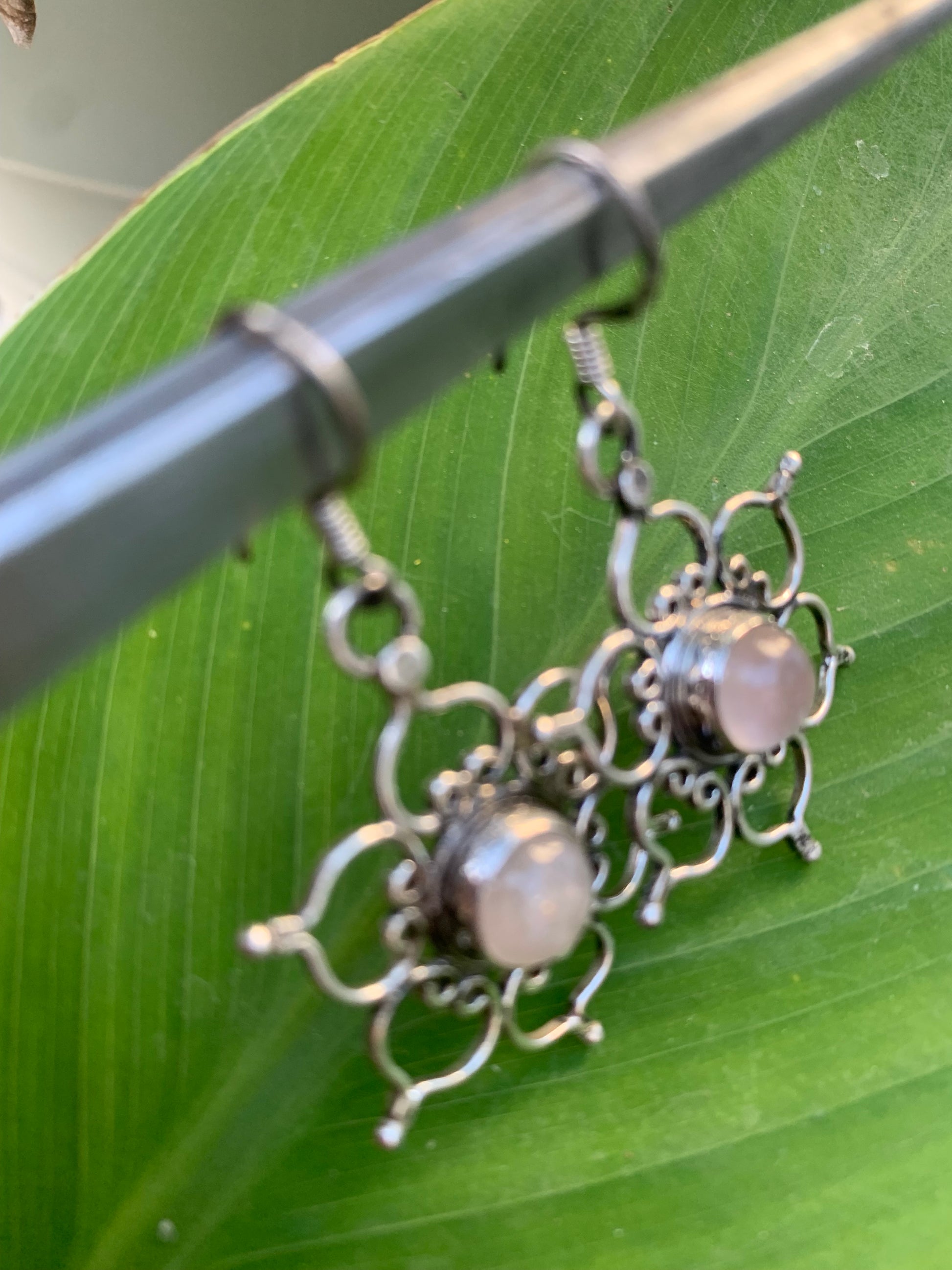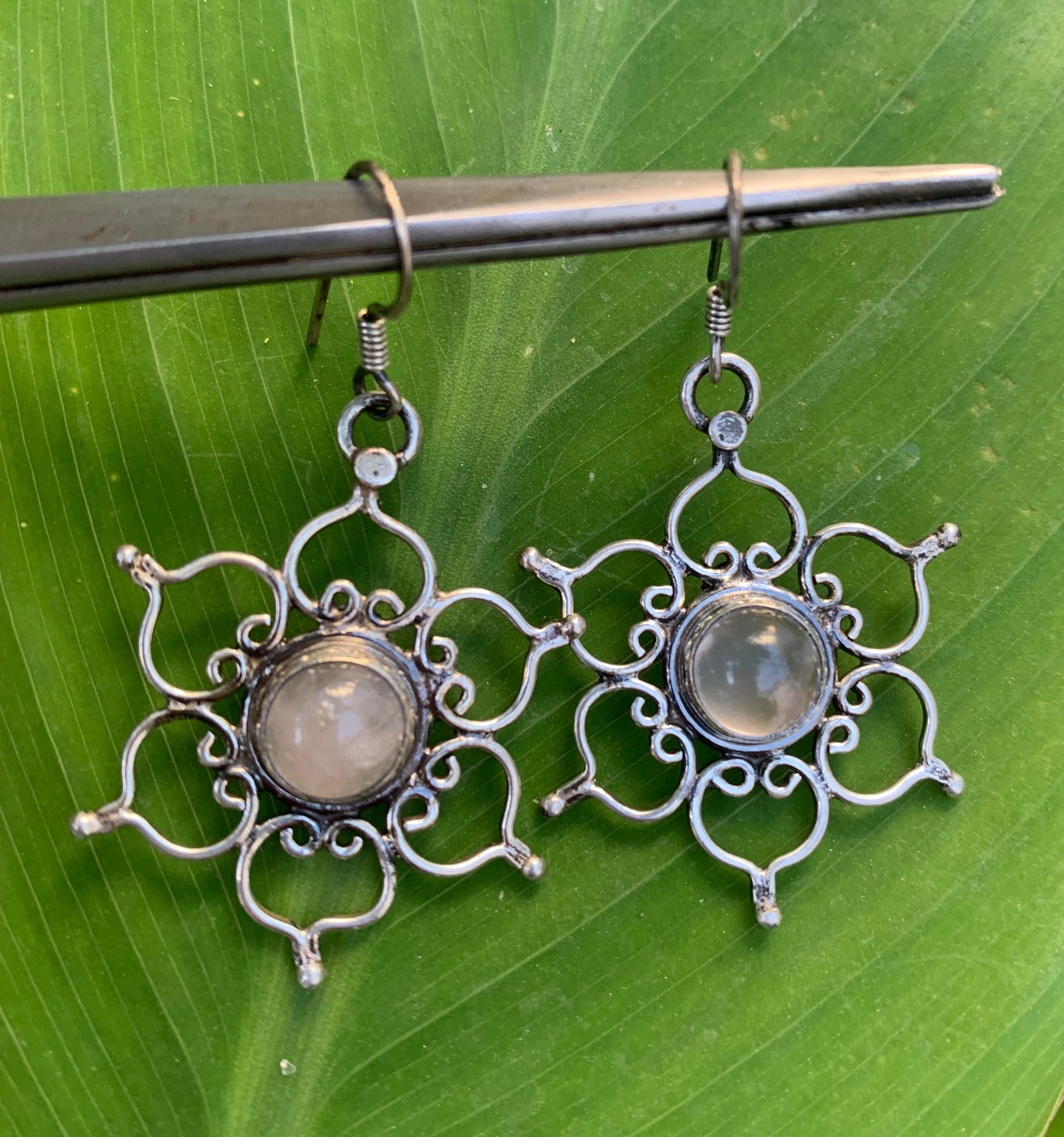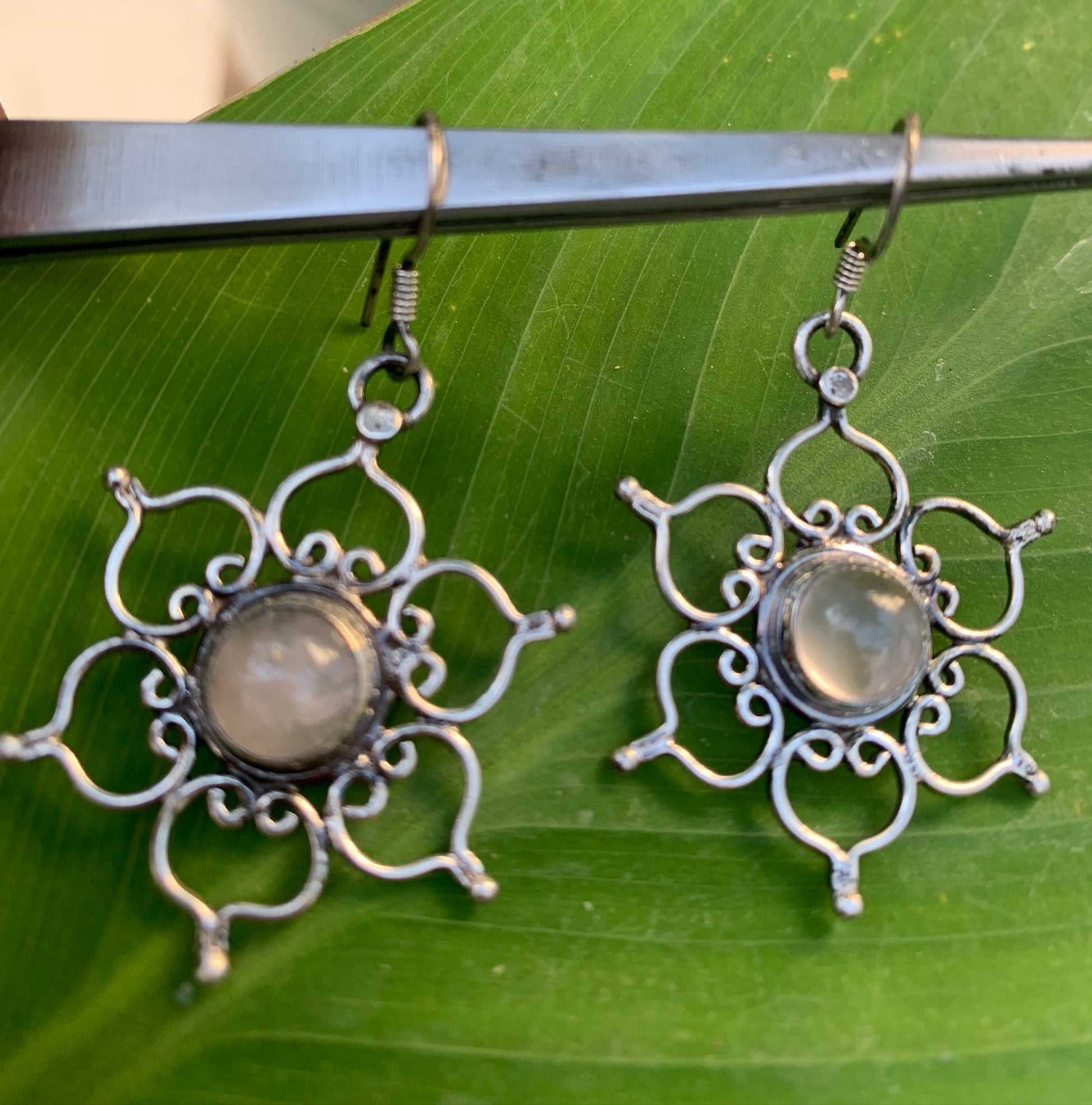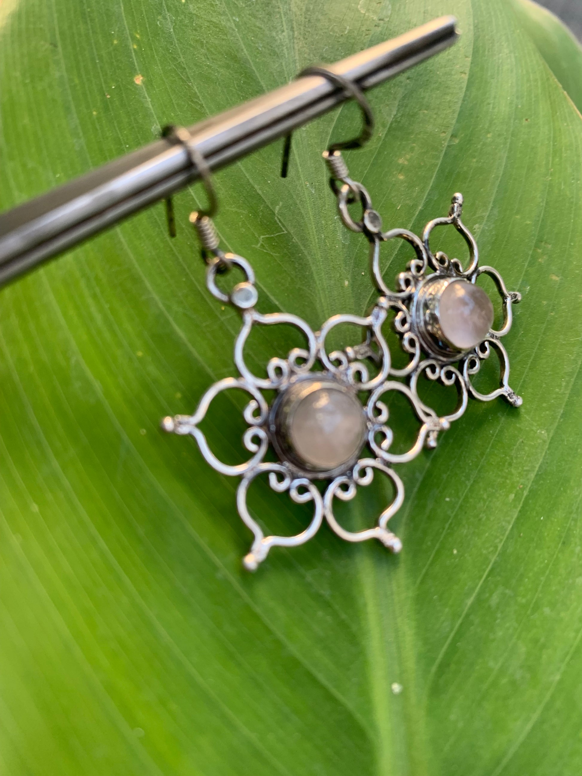 Boucles d'oreilles en Quartz Rose, fleur de vie avec cabochon central serti Argent, qualité AA à AAA. Vendu en finition Argent 0.925, parfait !