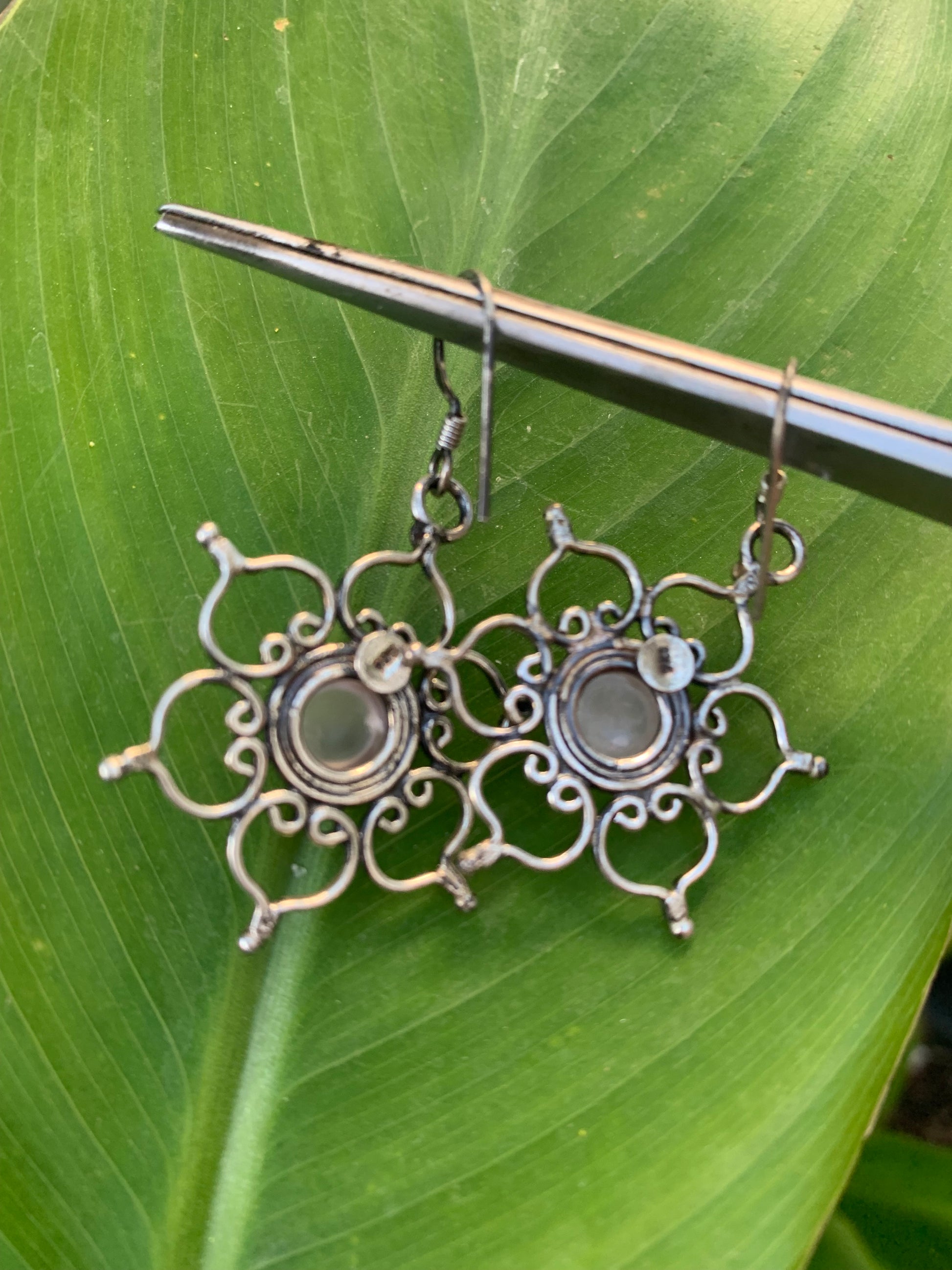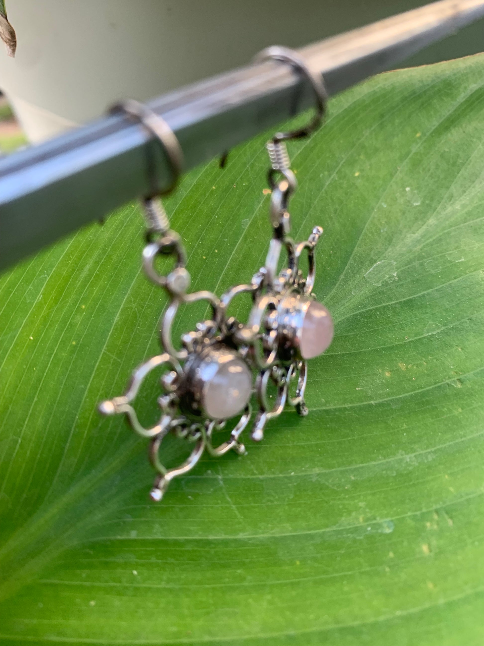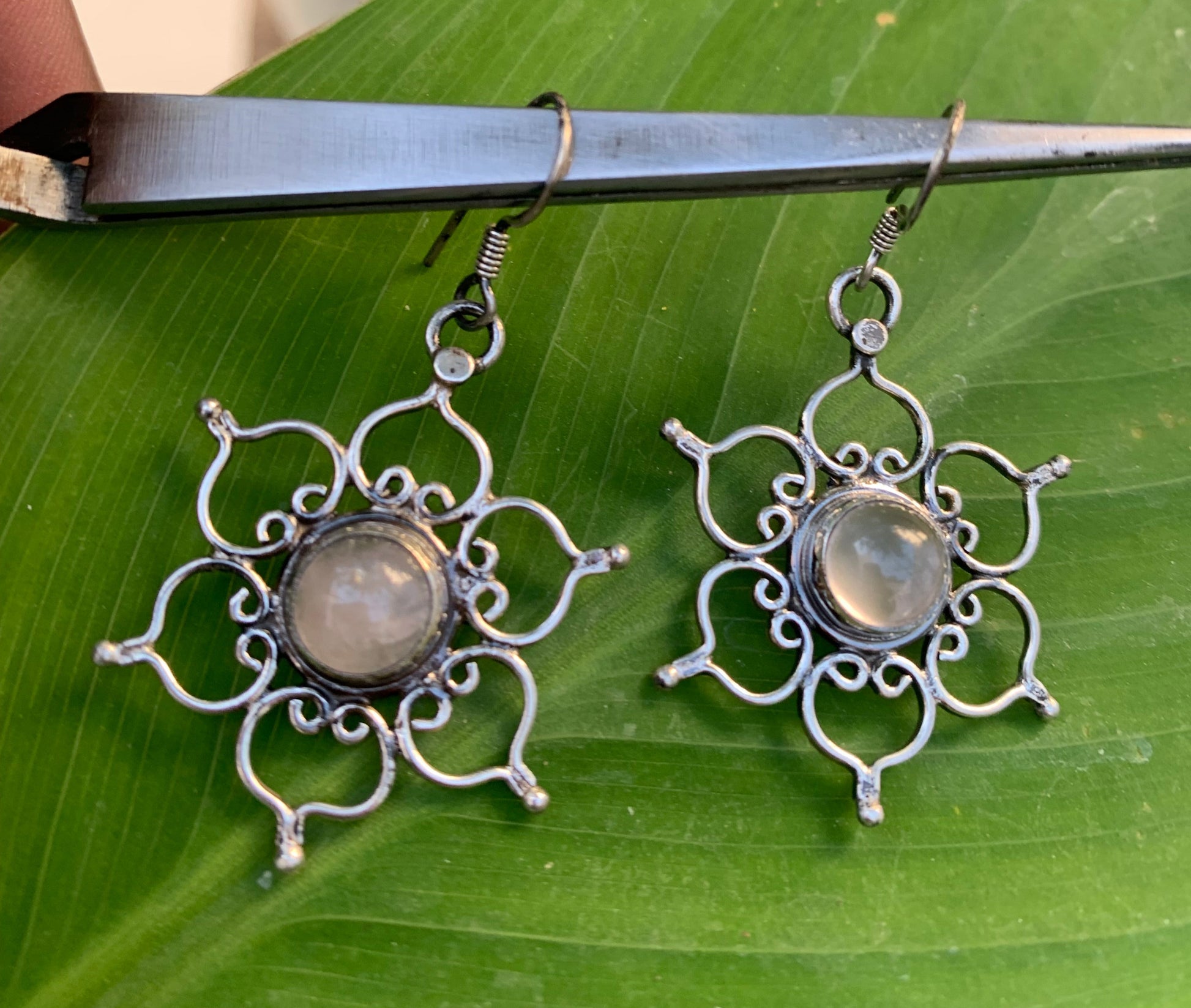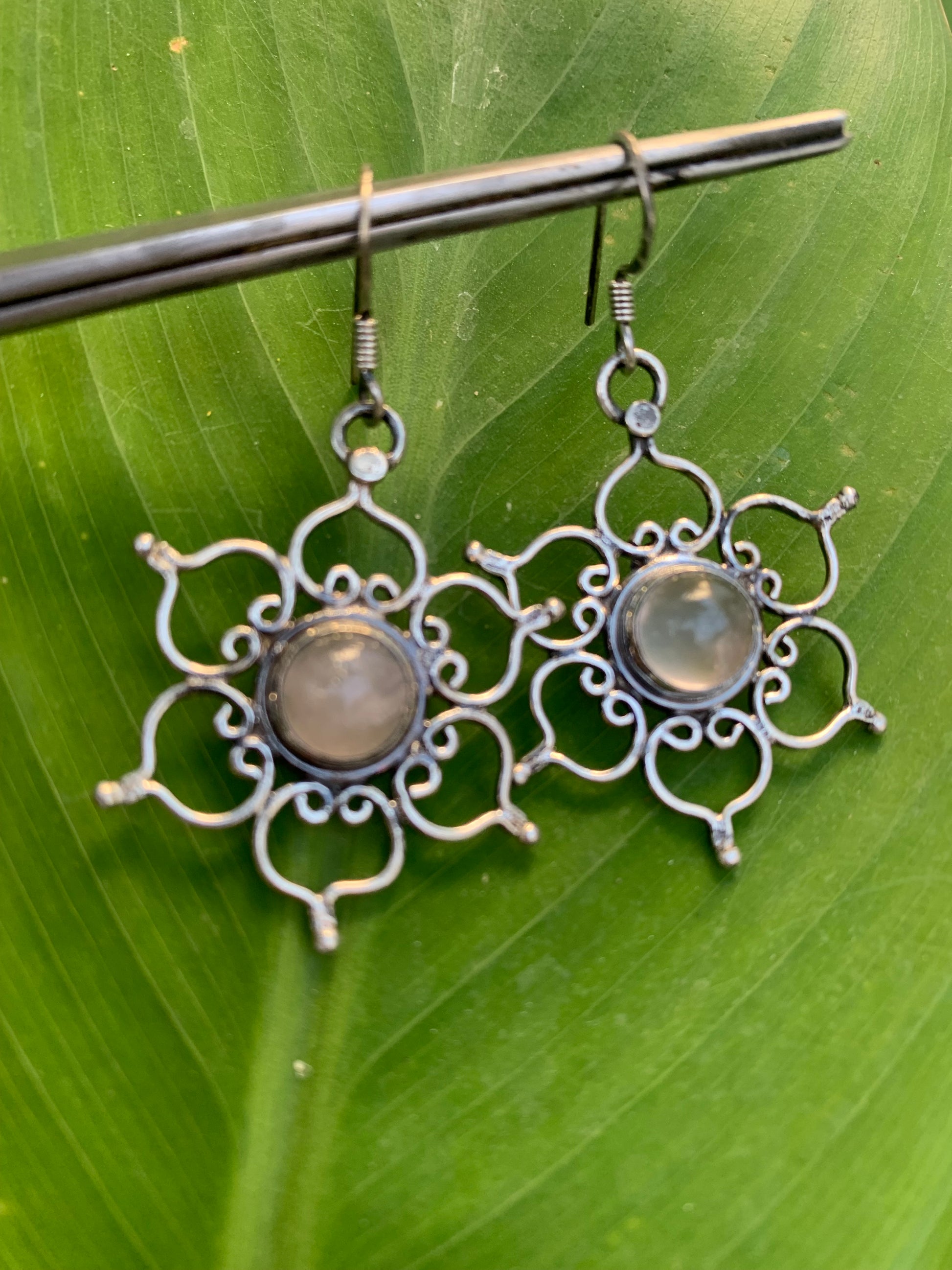 Boucles d'oreilles en Quartz Rose, fleur de vie avec cabochon central serti Argent, qualité AA à AAA. Vendu en finition Argent 0.925, parfait !