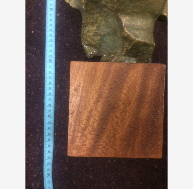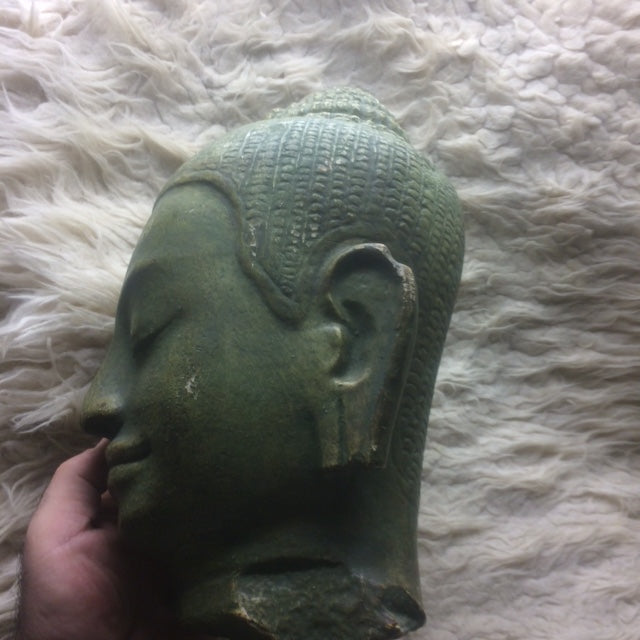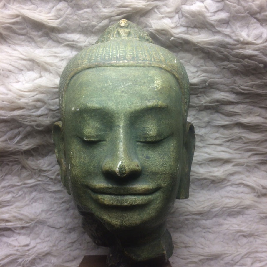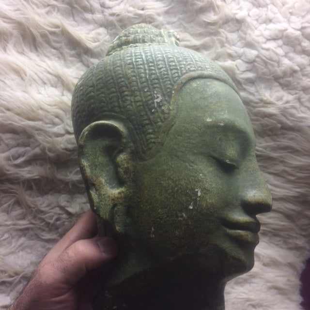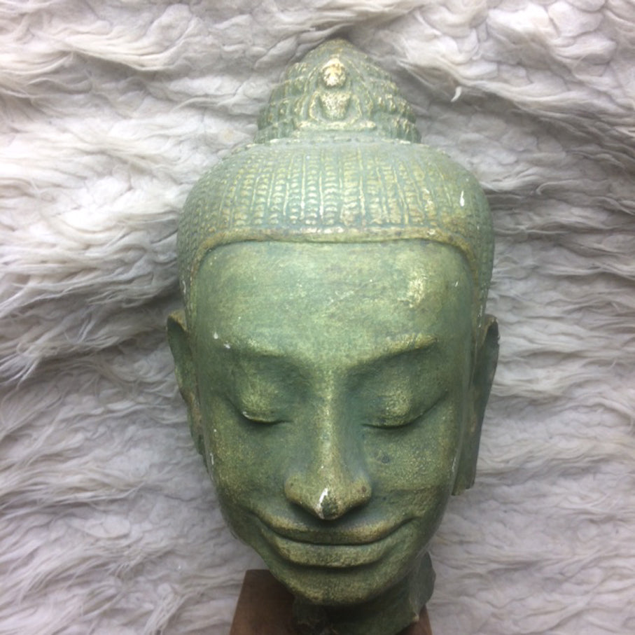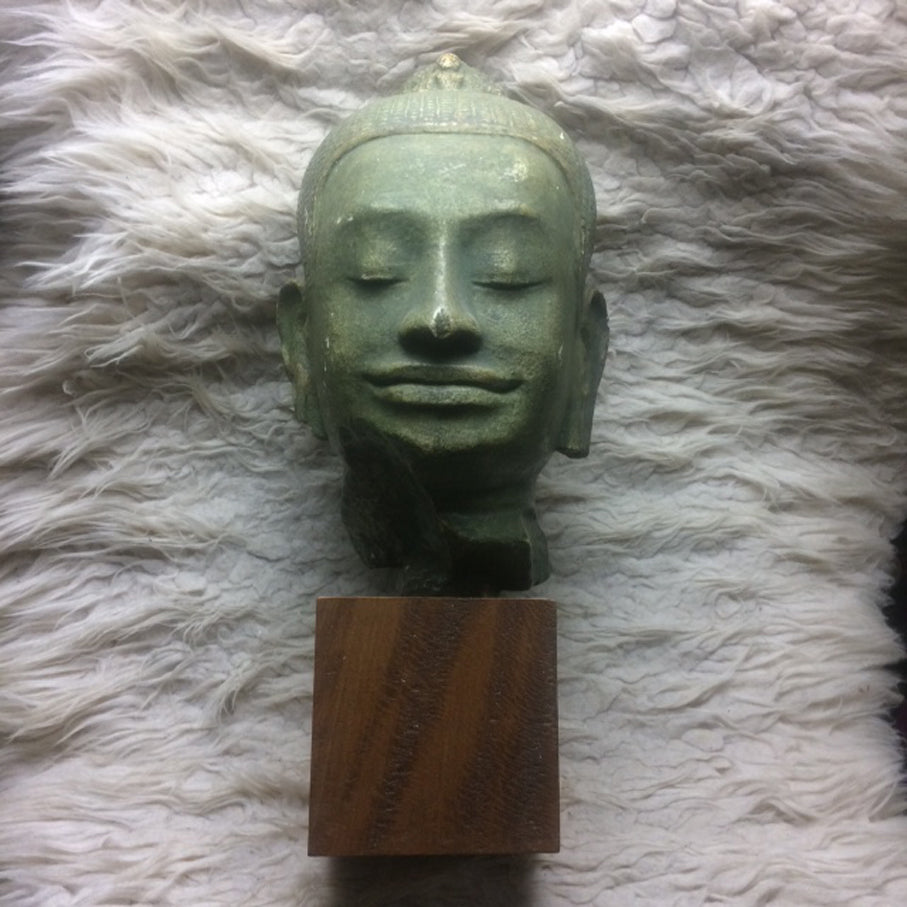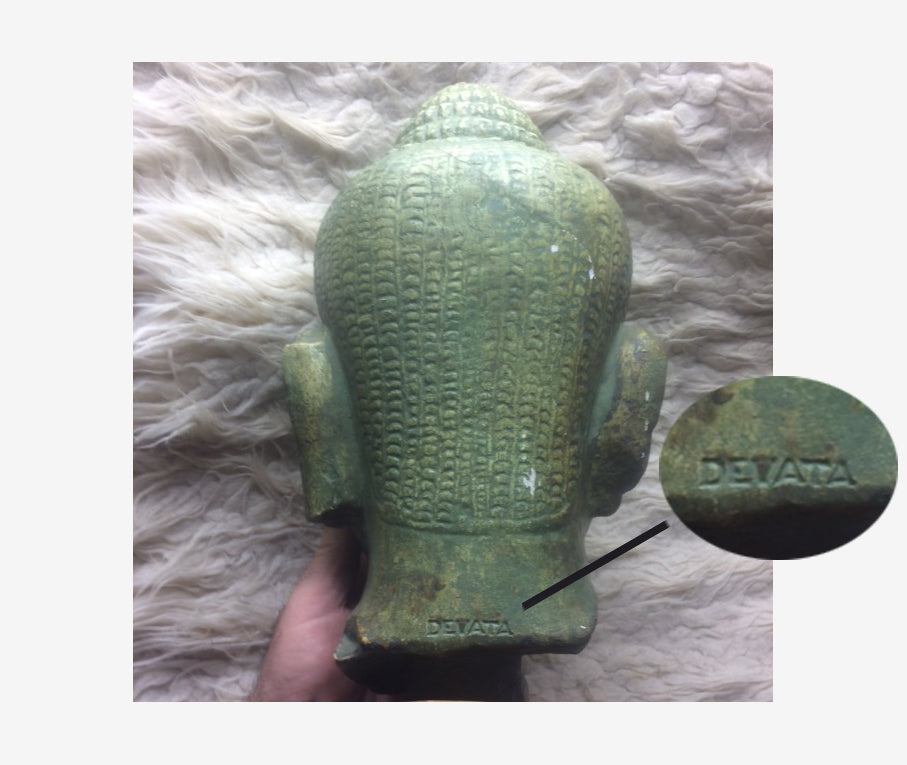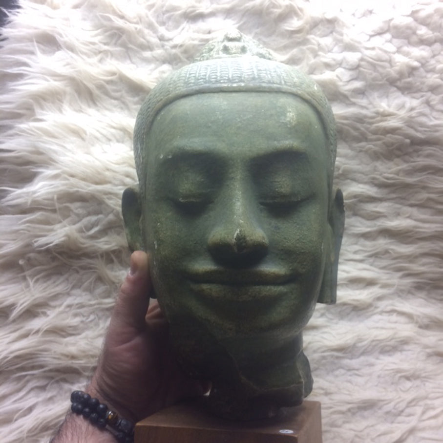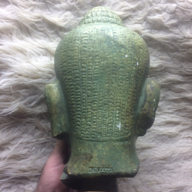 Tête du Bouddha ancien signé par 'Devata', de taille XL de 47 centimètres de hauteur - Superbe pièce monté sur socle en bois, magnifique !