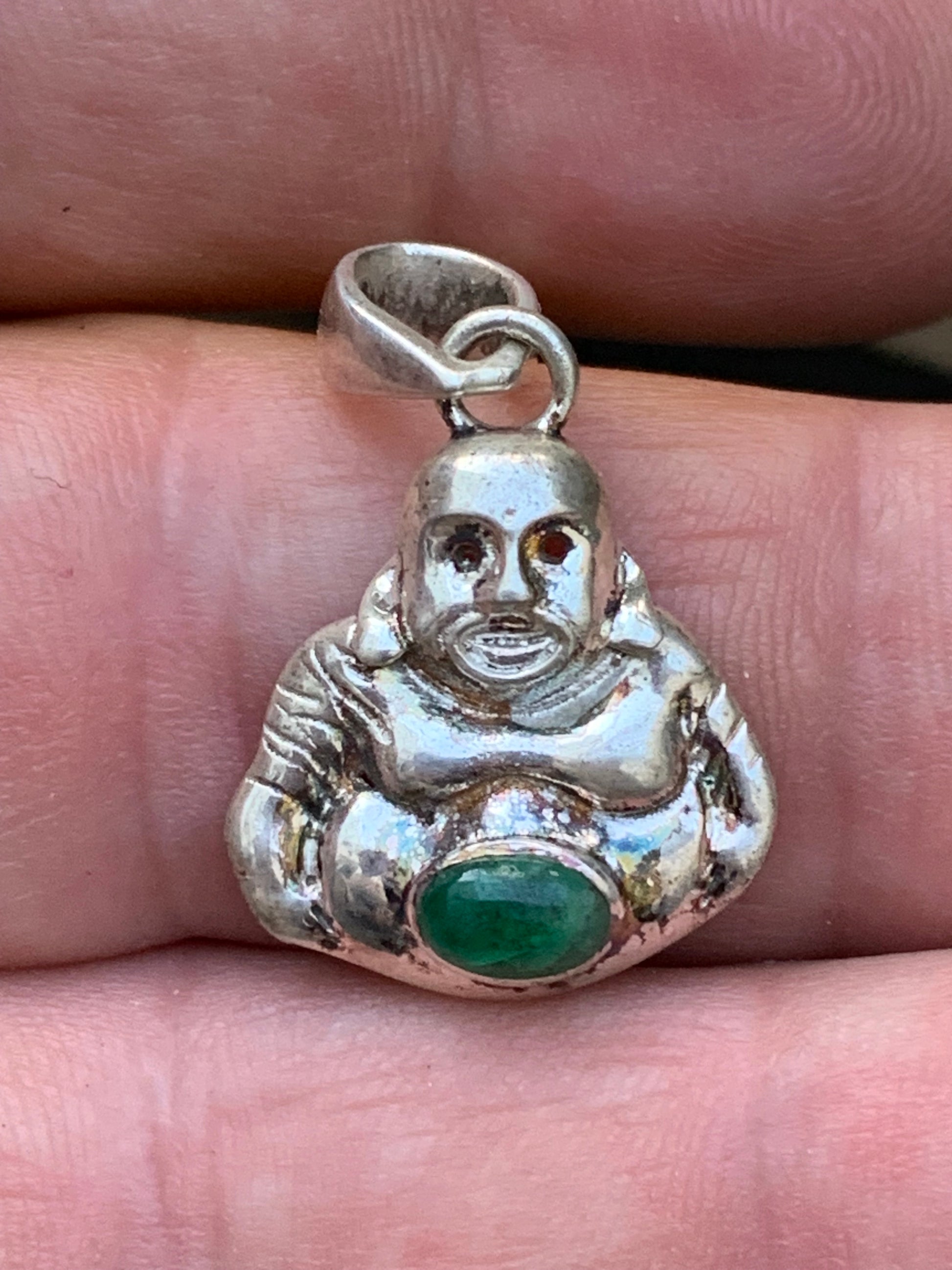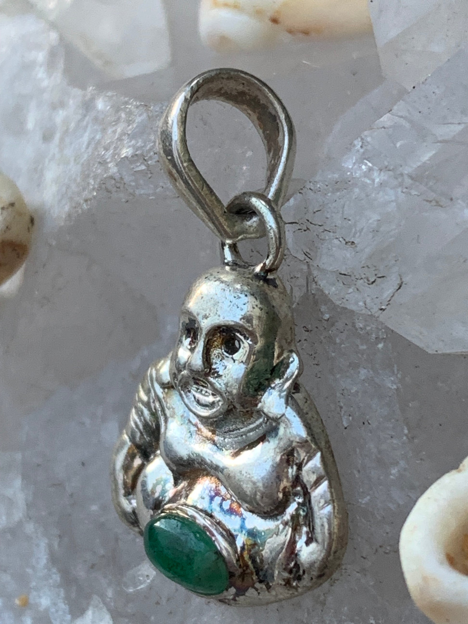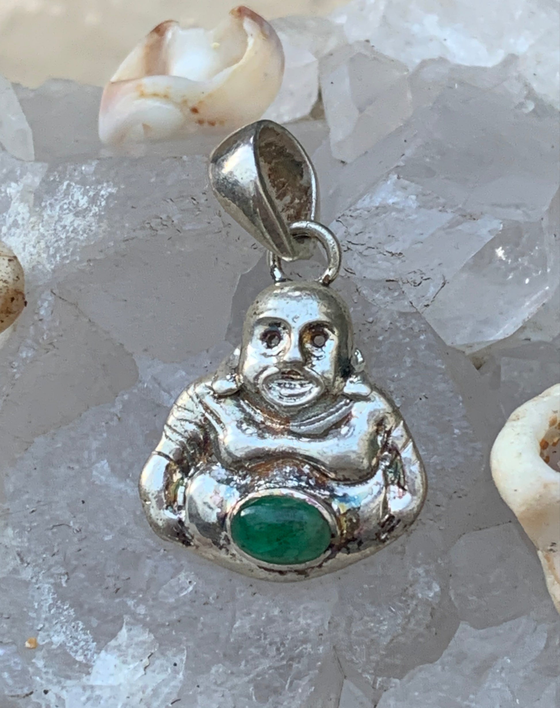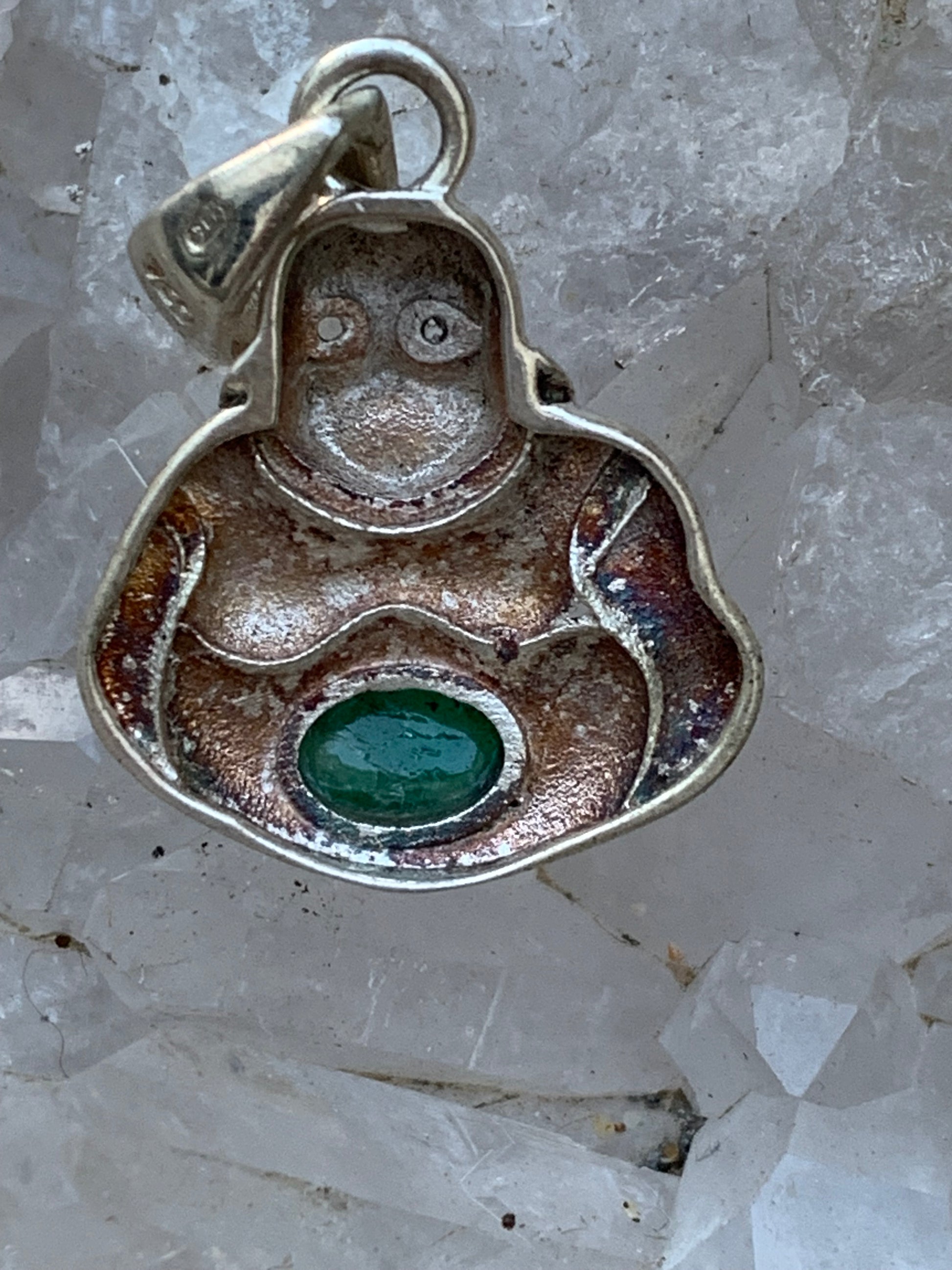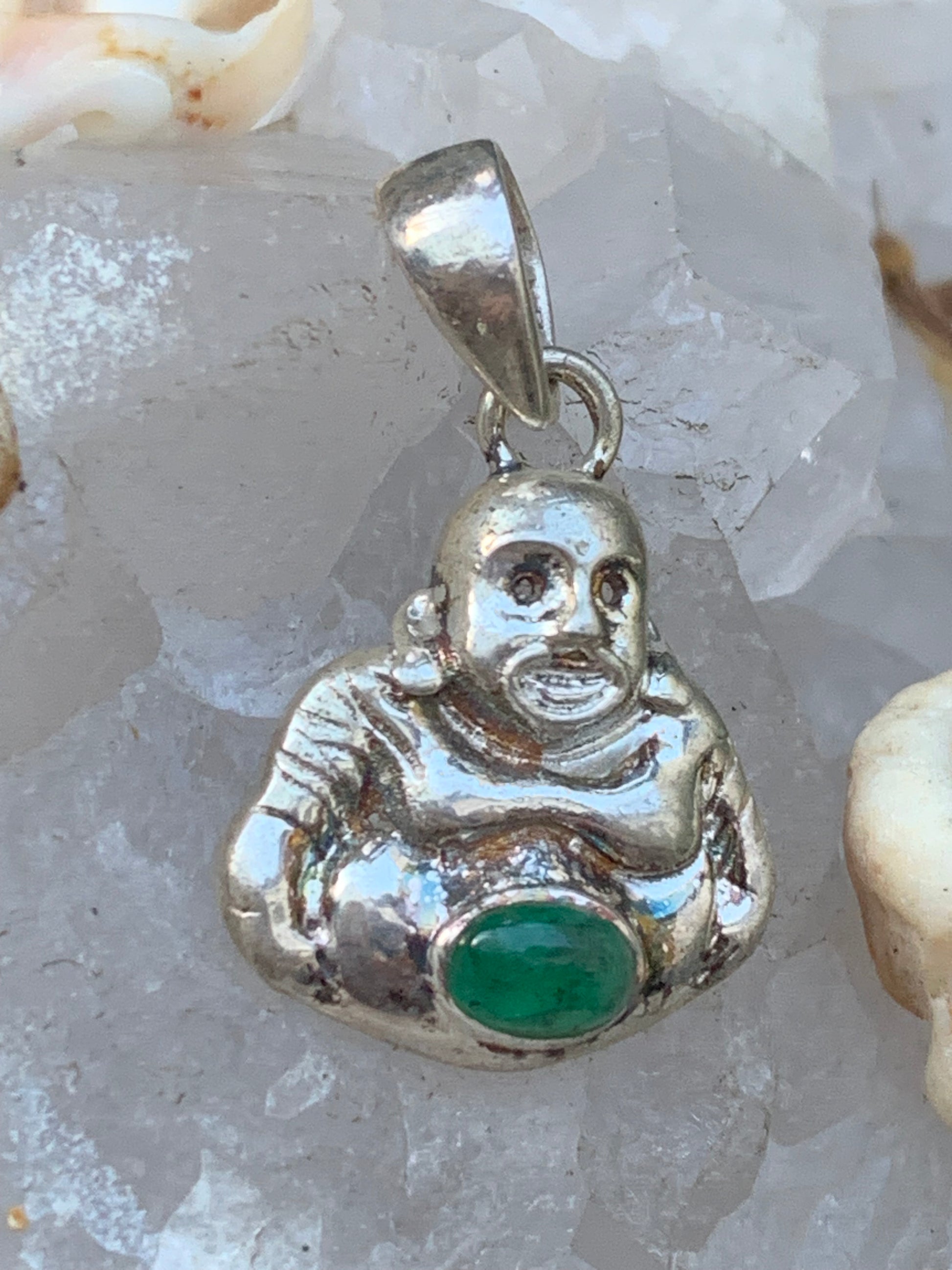 Bouddha en Argent avec Emeraude 'Élégance et Spiritualité'... Pendentif en Argent 925, 25x20x6 millimètres. Livré en coffret avec cordon coulissant, prêt à porté ou à offrir !