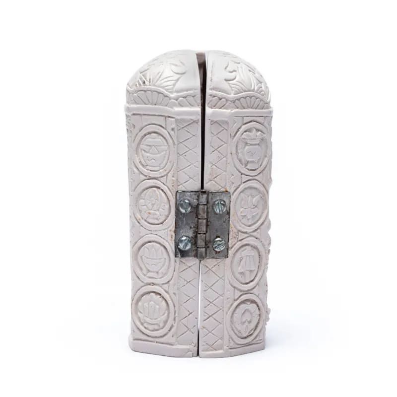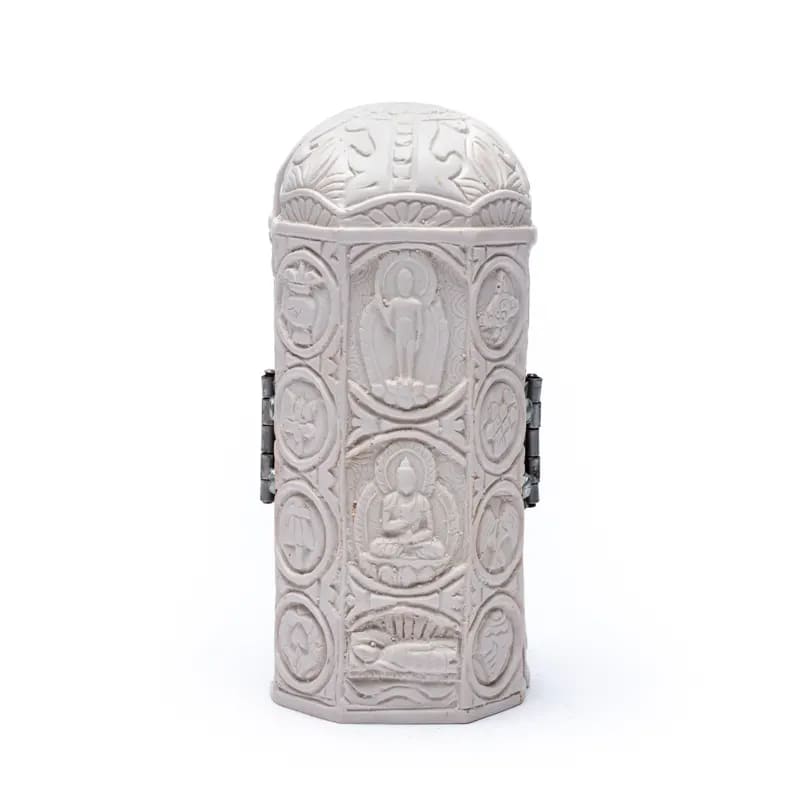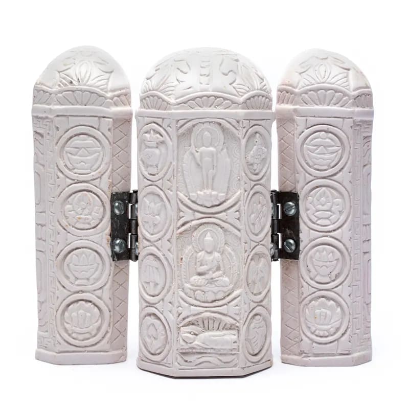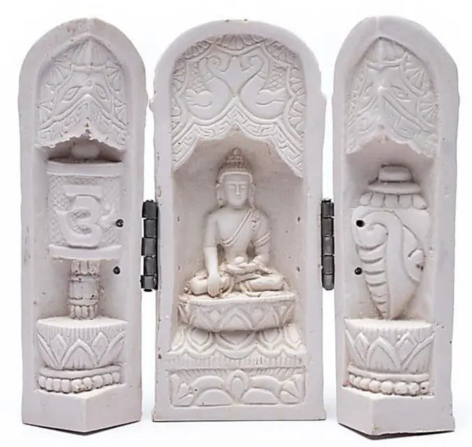Bouddha Shakyamuni en triptyque (3 pans qui se referme), avec une conque et une roue de prière, symbolisant la sagesse et la méthode, les deux «ailes» nécessaires pour voler vers l’illumination.