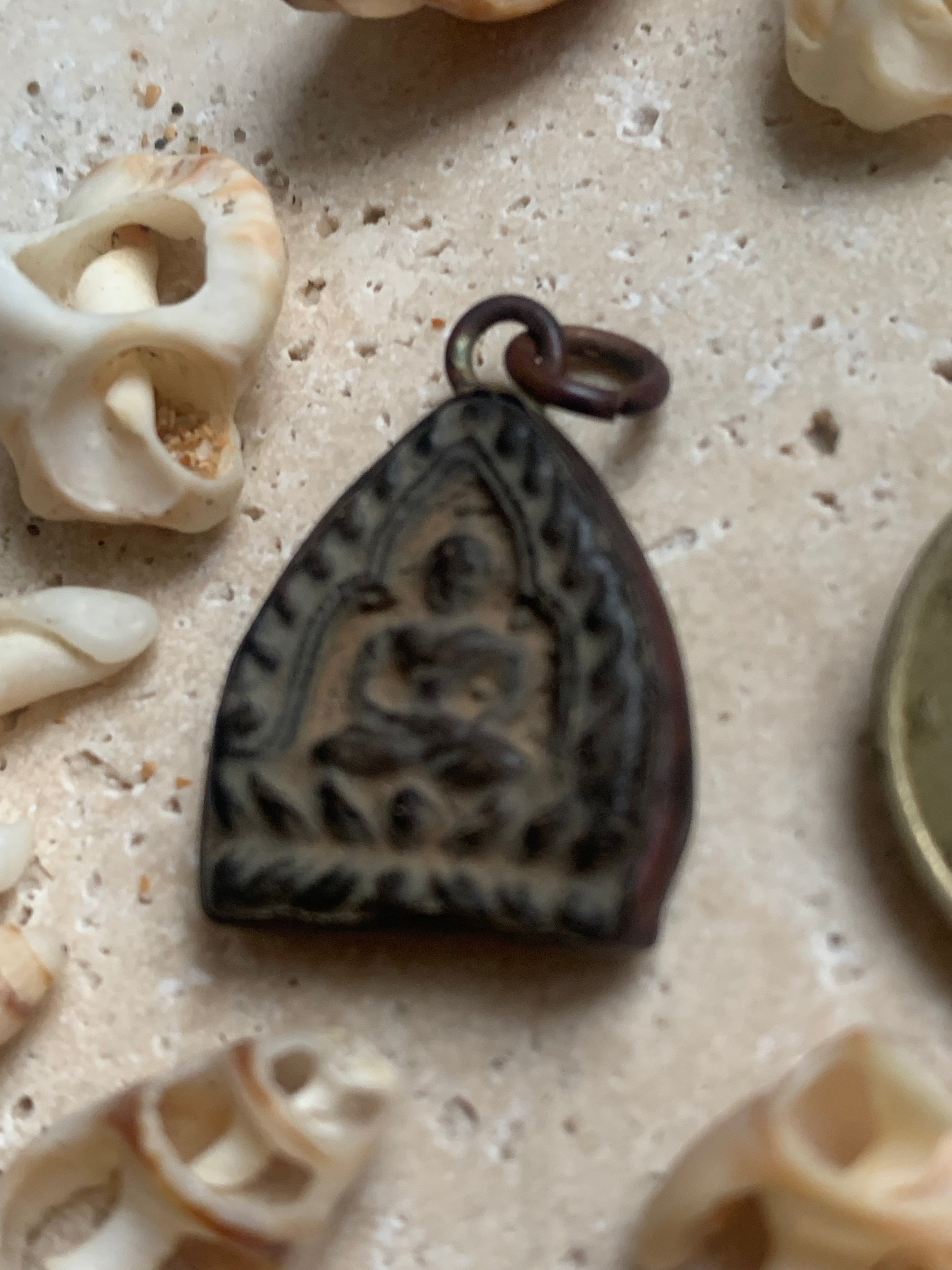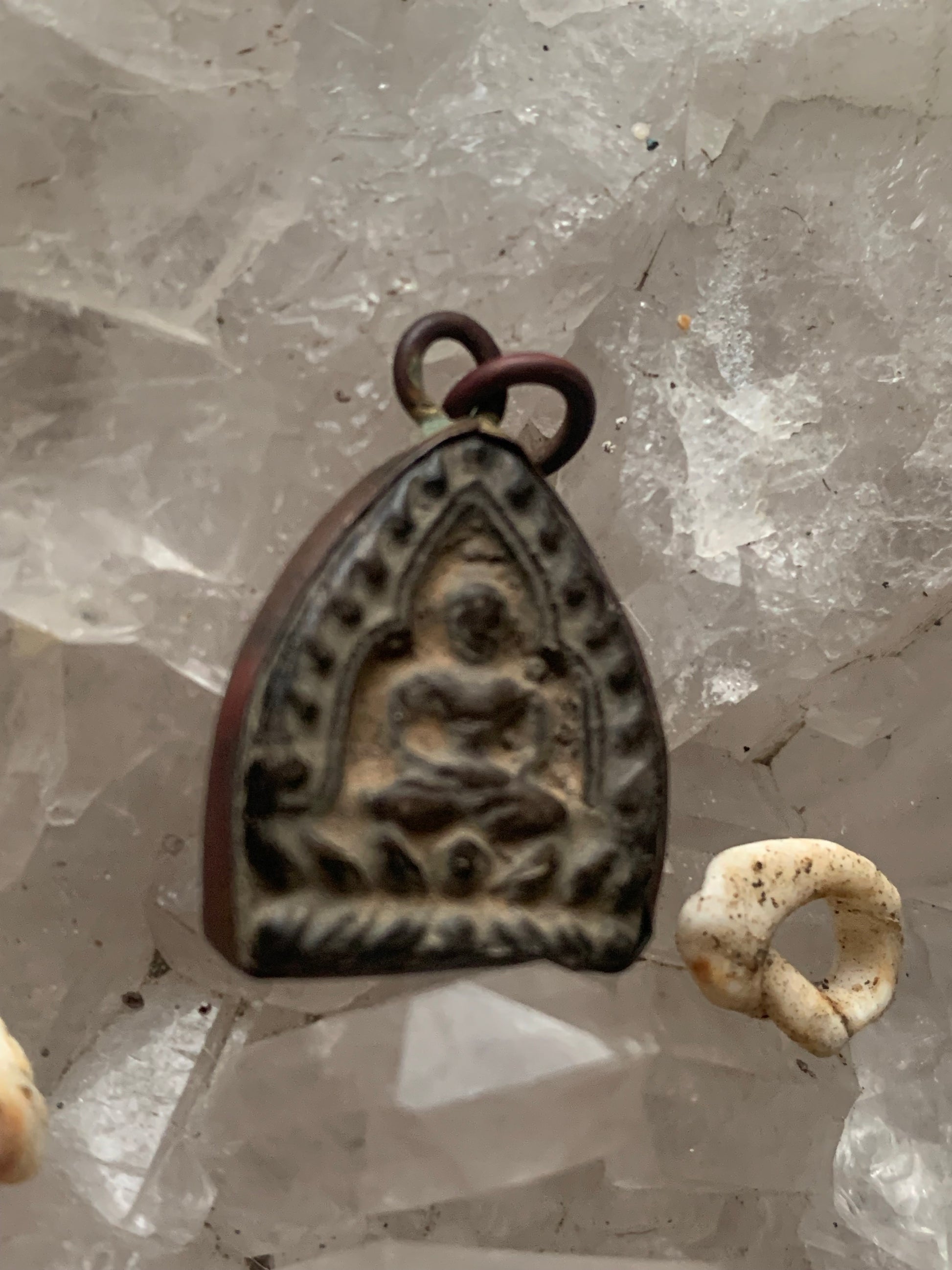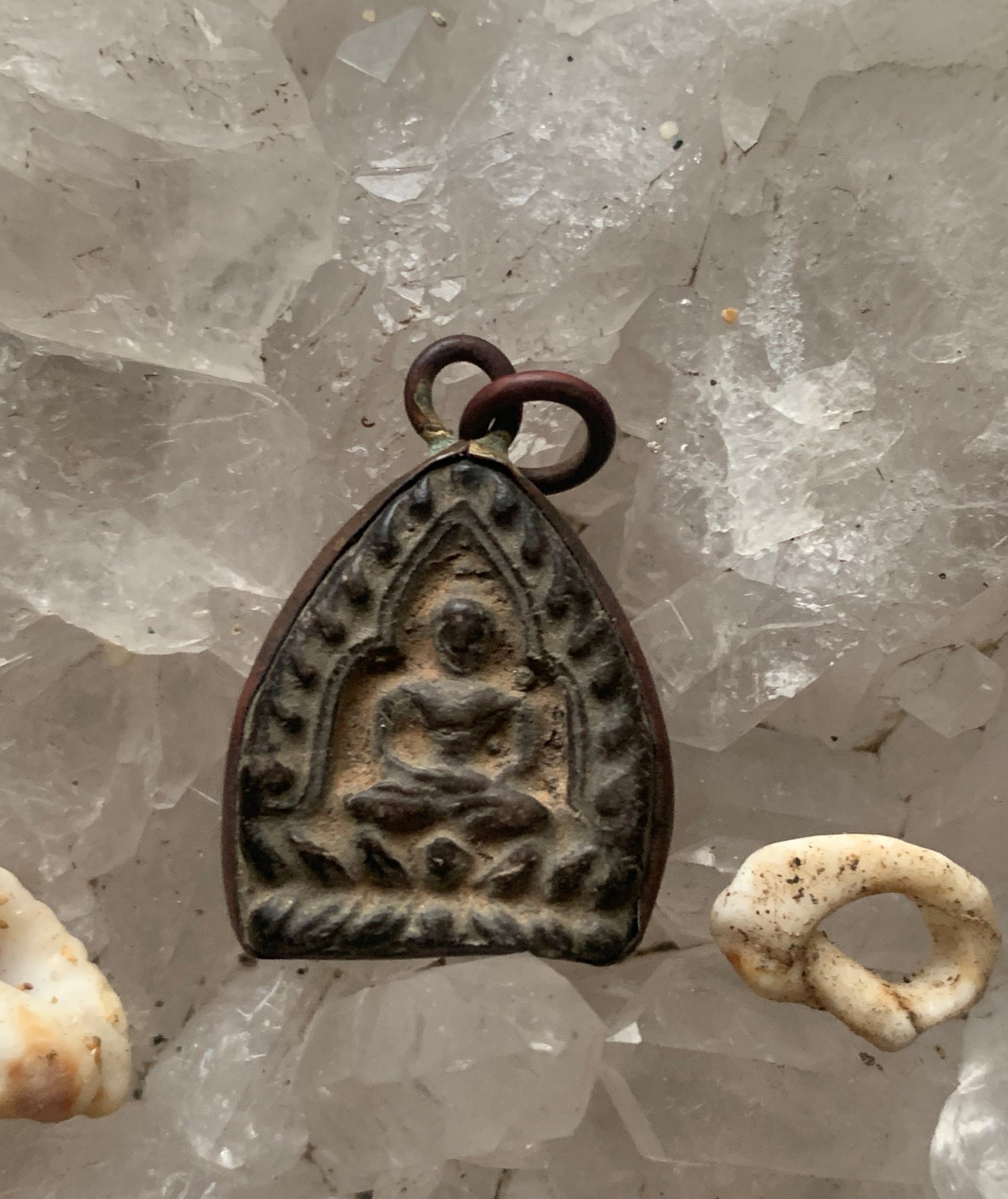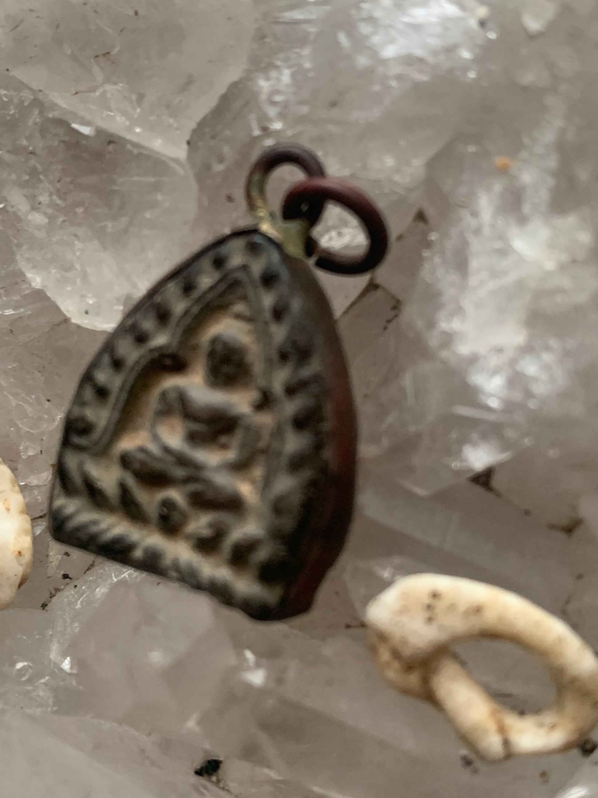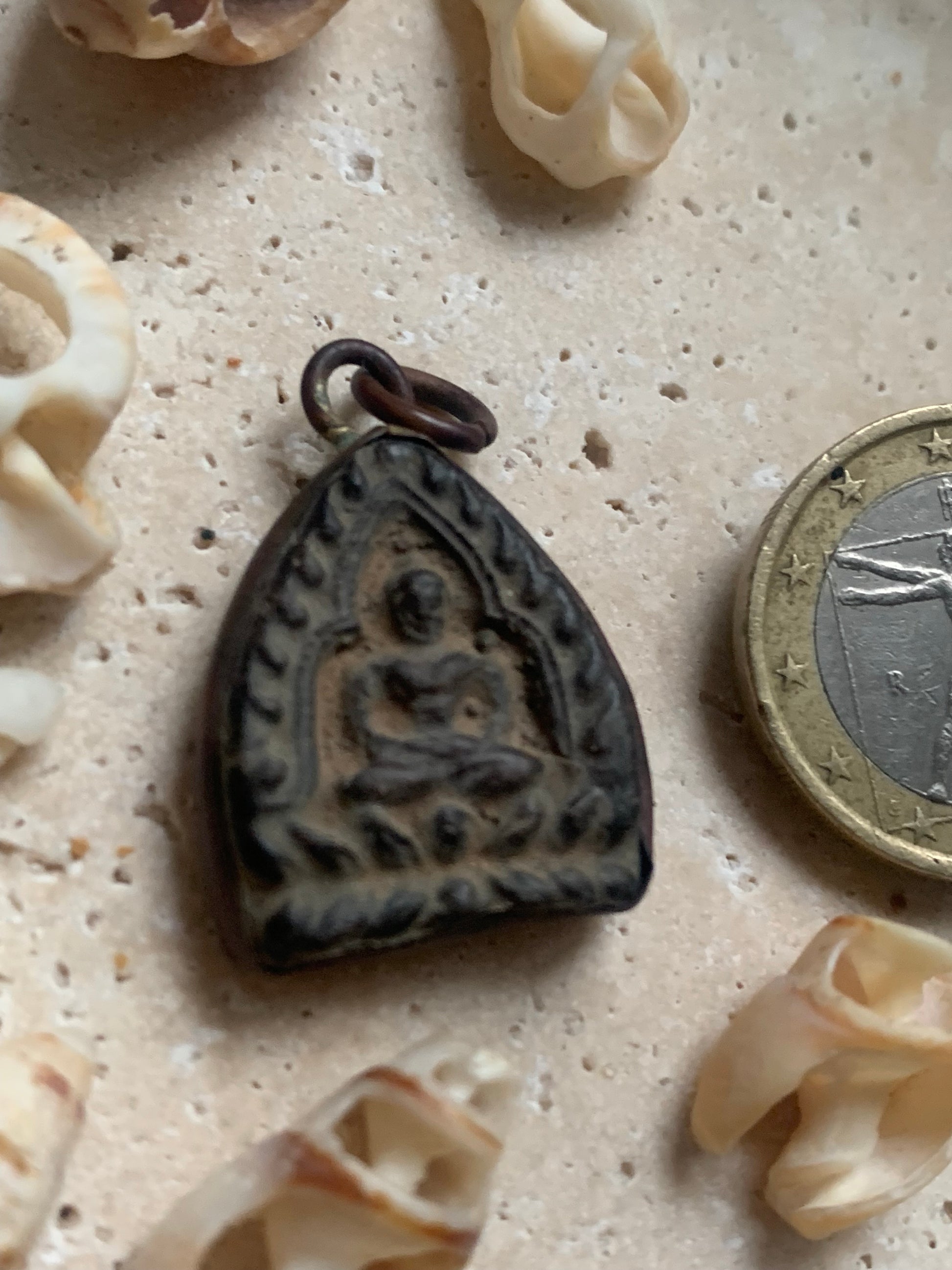 Bouddha de style (Tsa-tsa*), pendentif ancien de la divinité sacré en métal (laiton) et terre cuite, 30x20x7 millimètres. Pièce authentique et unique faîte au Népal. Livré avec cordon coulissant, prêt à porté ou à offrir !