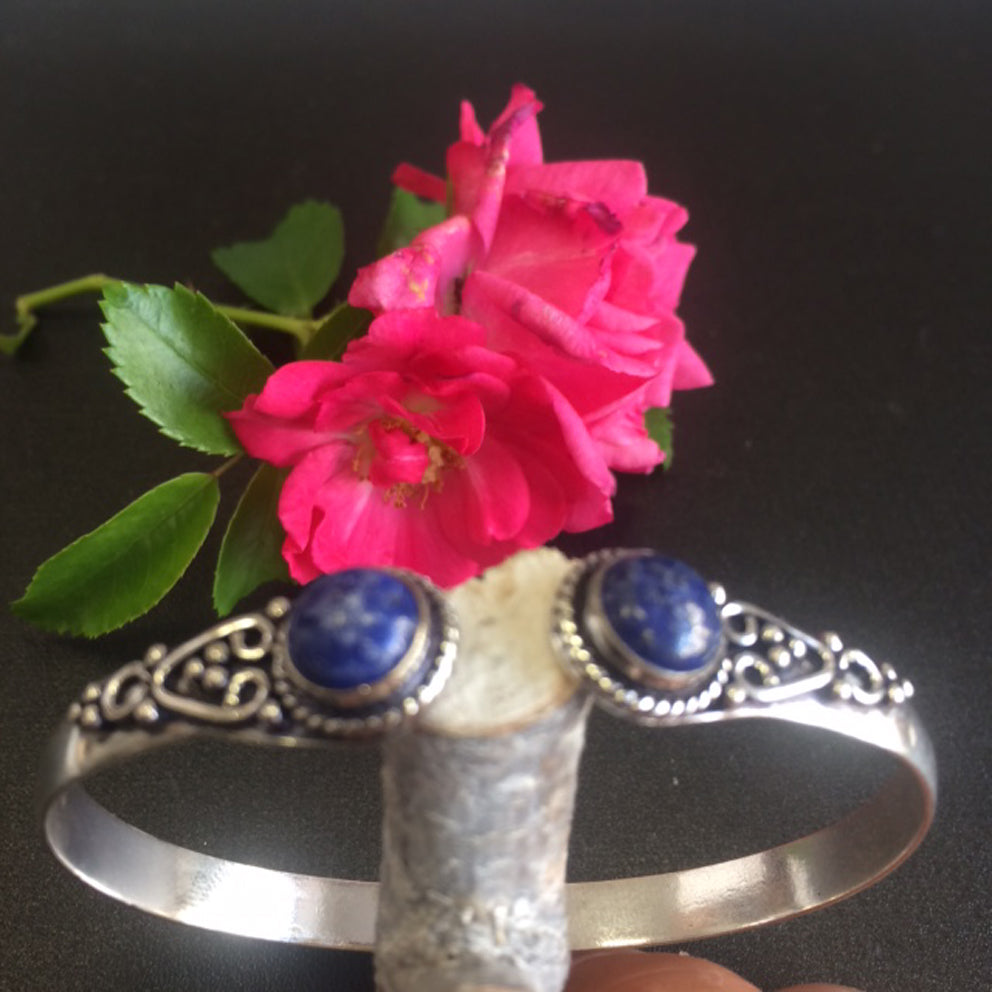 Bracelet de type 'Manchette' de 1 centimètre de largeur, fait en laiton argenté avec cabochon d'amethyste ou lapis lazuli.