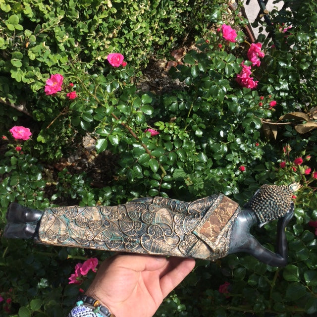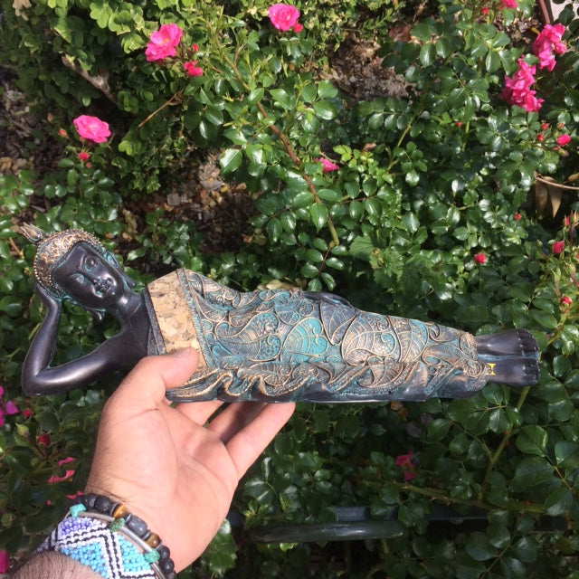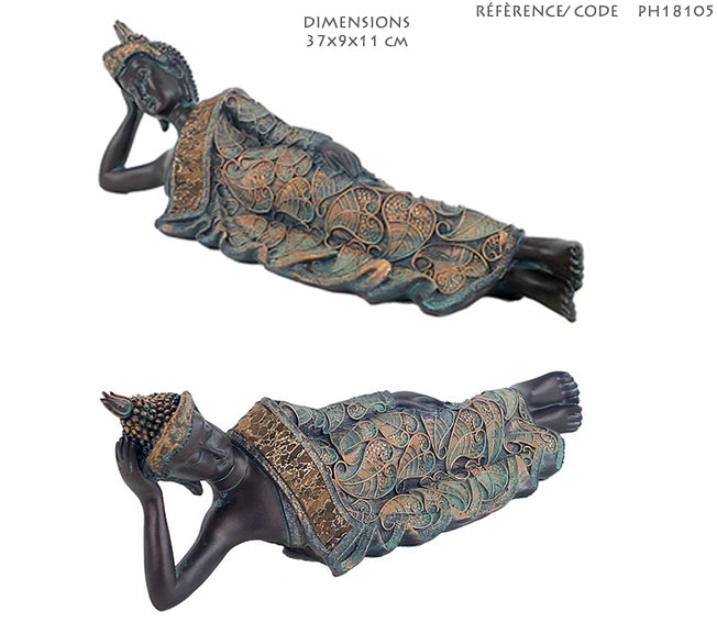 Bouddha couché/ allongé de taille 36x9x11cm. Habillage en textiles et liège, superbe pièce !