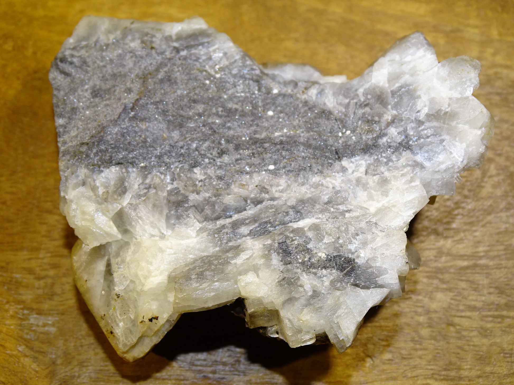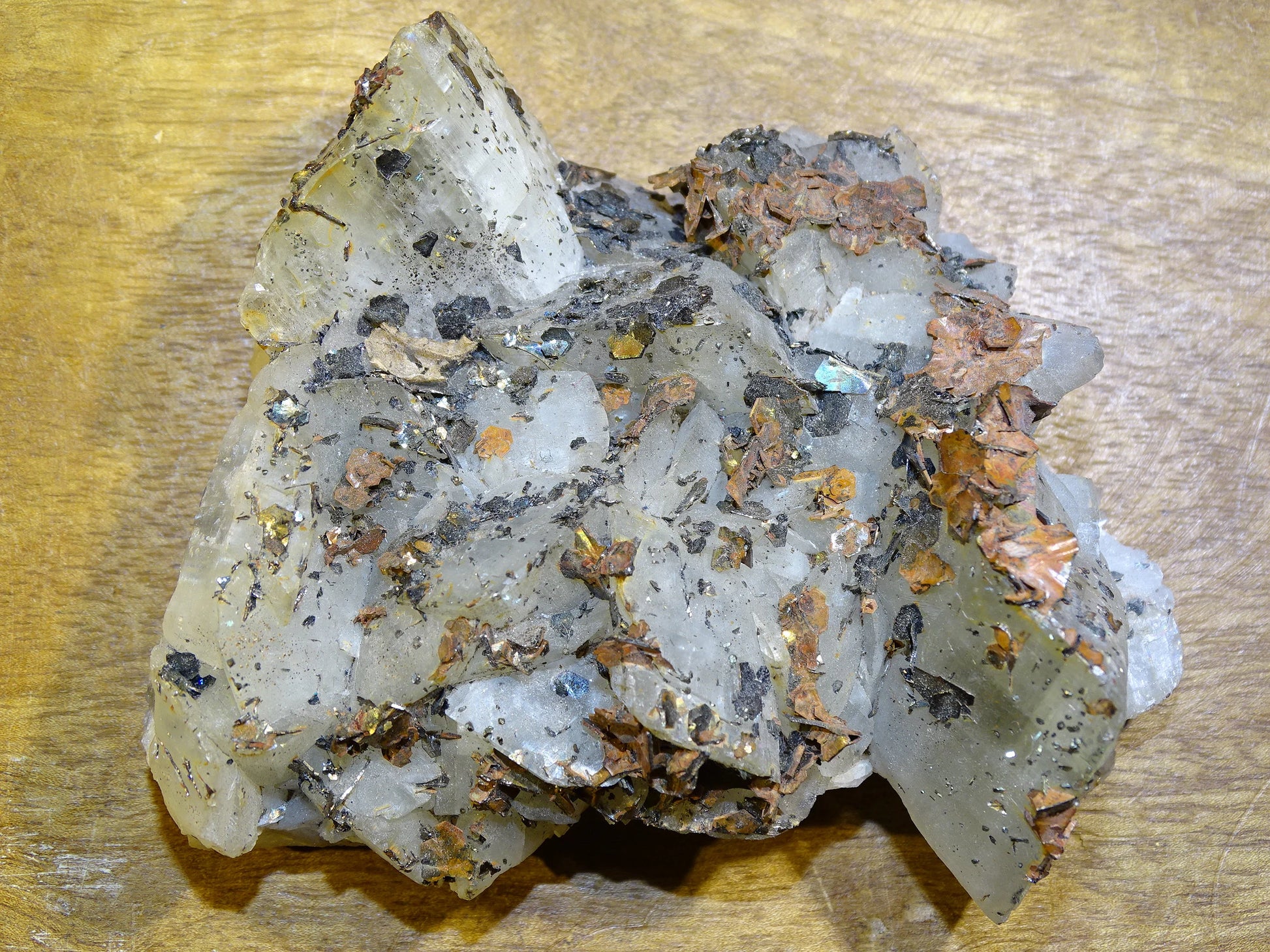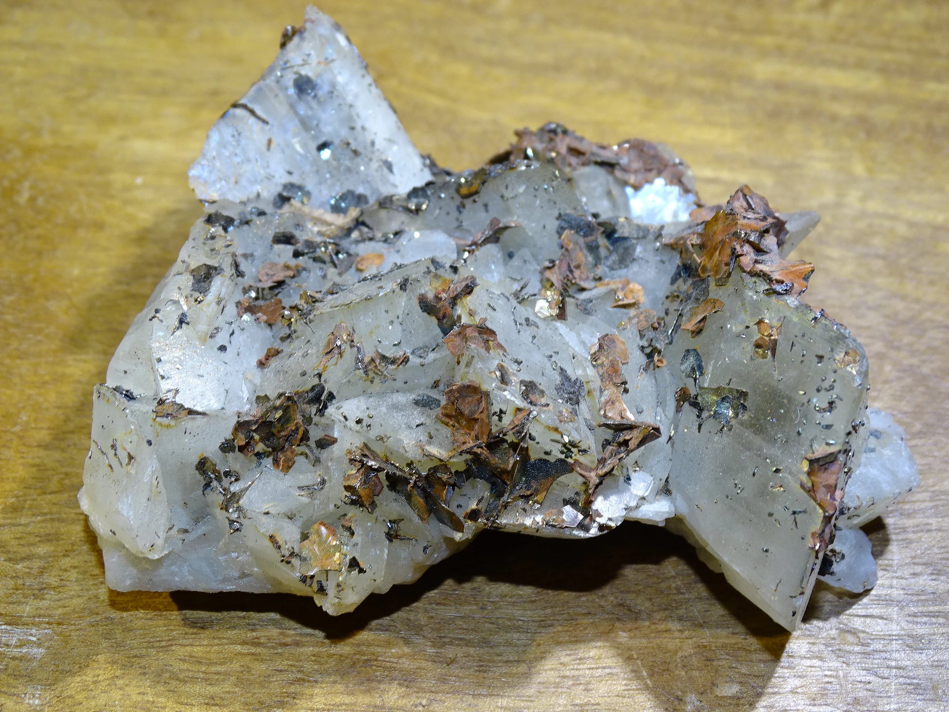 * Calcite : Cristaux translucides à blancs, structure rhomboédrique visible.