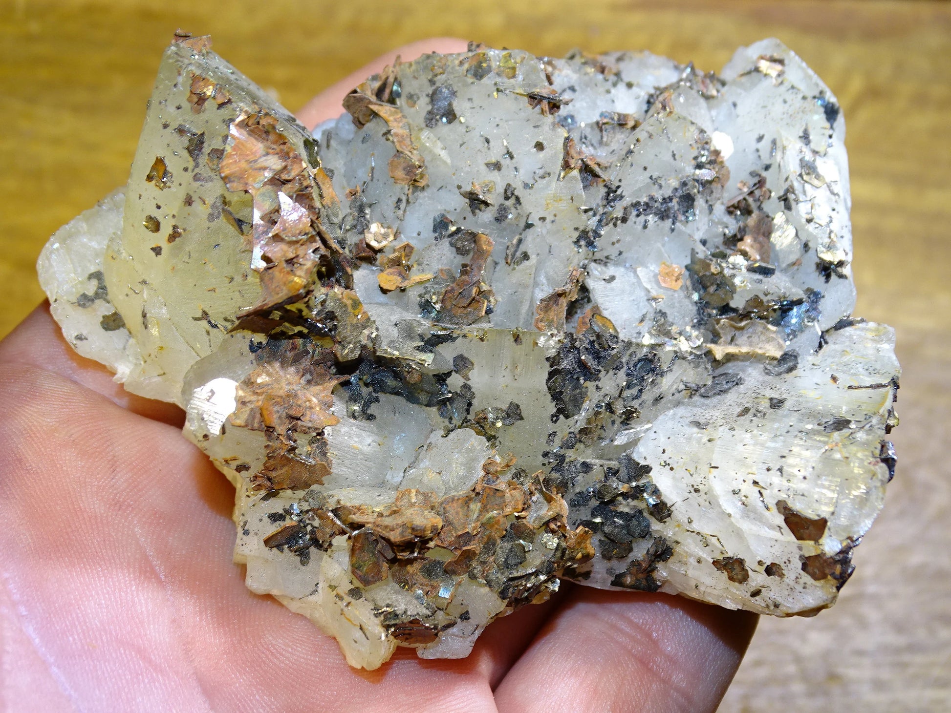 + Chalcopyrite : Brillance métallique dorée, avec teintes cuivrées.