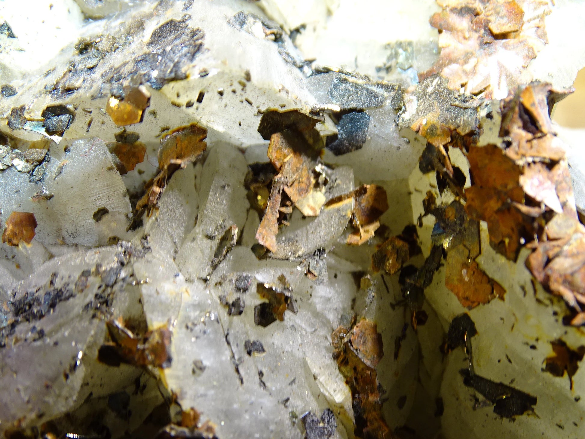 + Altérations cuivrées : La couleur brun-rouille sur certains morceaux pourrait indiquer une oxydation du cuivre (ou de la chalcopyrite elle-même)