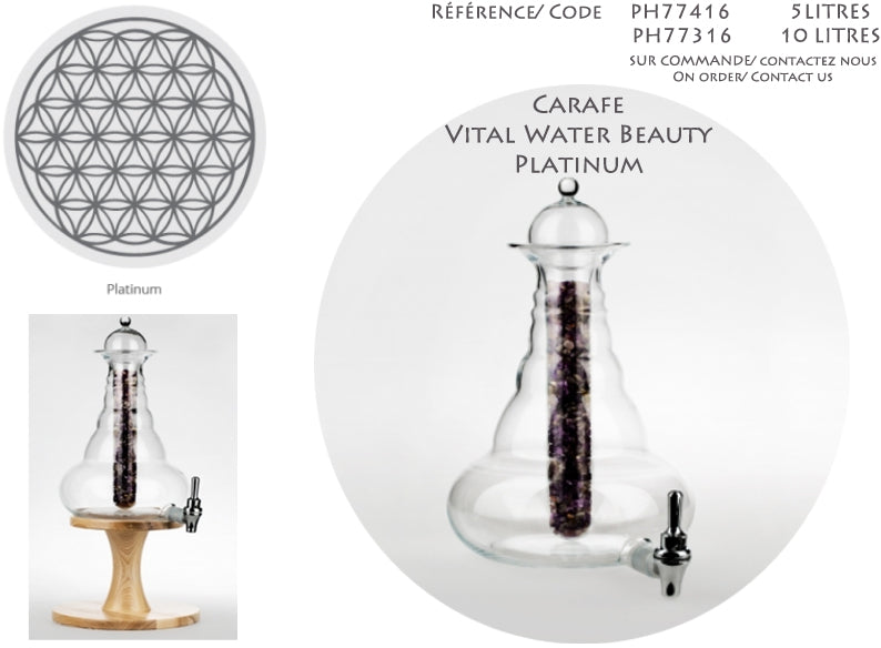 Carafe de taille XL, modèle 'Universe' de chez Nature's design, avec gravure de la fleur de vie en Platine. Contenance de 5 litres. Verre sans plomb, conçu suivant le nombre d'or ! Vendu avec ou sans support en bois !