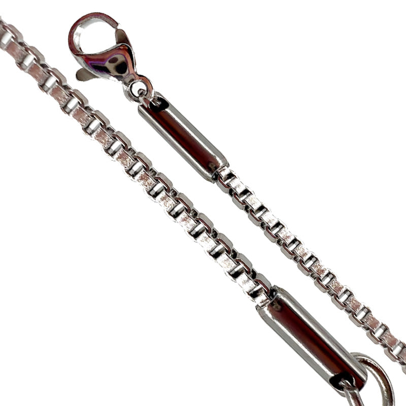 Chaîne à maille carrée est terminée par des embouts en acier intégrés au fermoir et à l’anneau, ce qui renforce la solidité de l'ensemble. Longueur : 50 cm