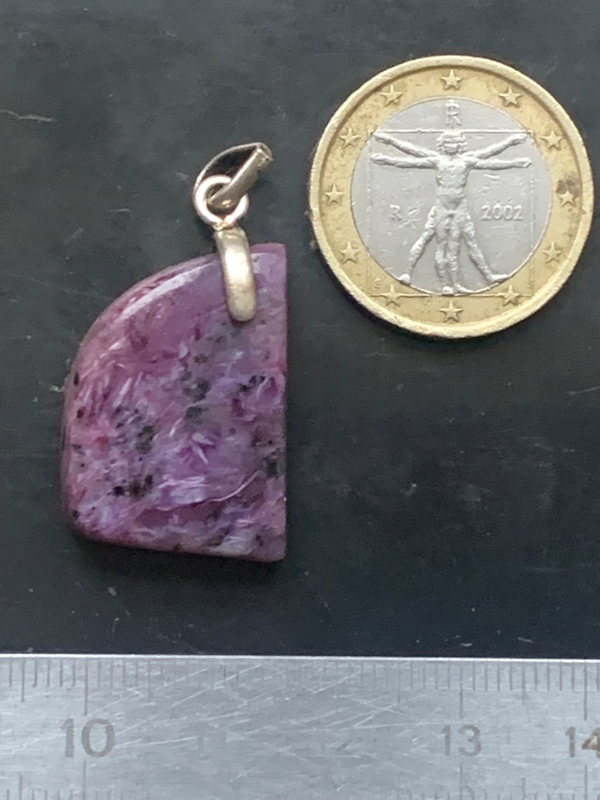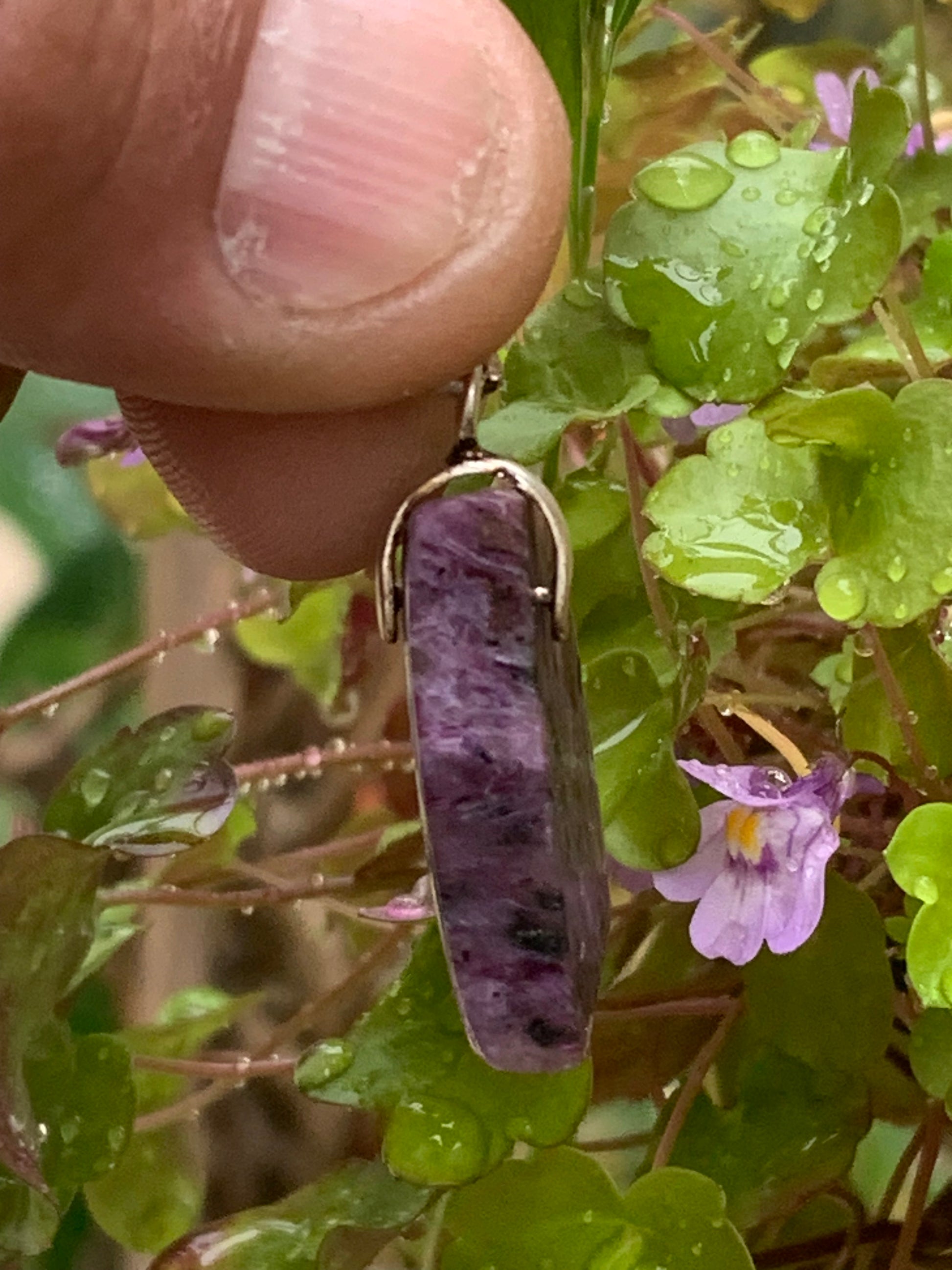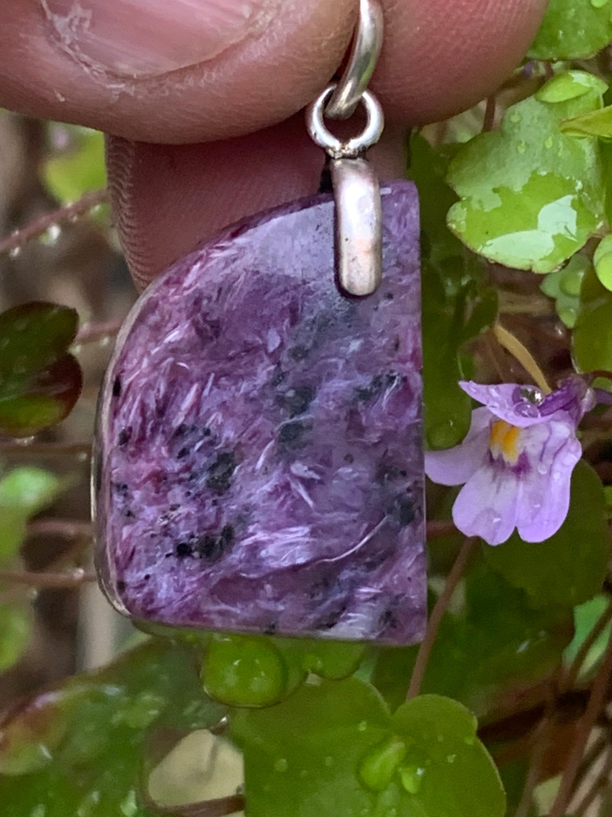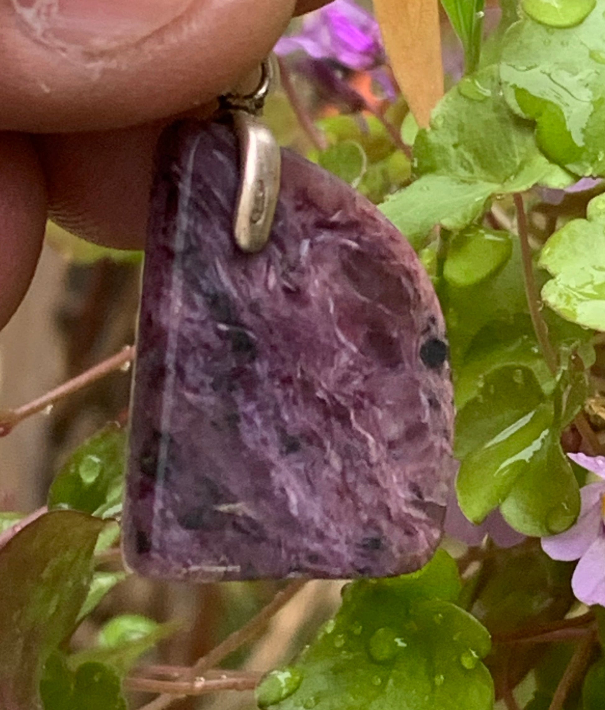 Charoïte, magnifique pendentif en Argent 925 de 35mm de hauteur x 18 de largeur x 7 d'épaisseur. Vendu avec cordon réglable de couleur noire !