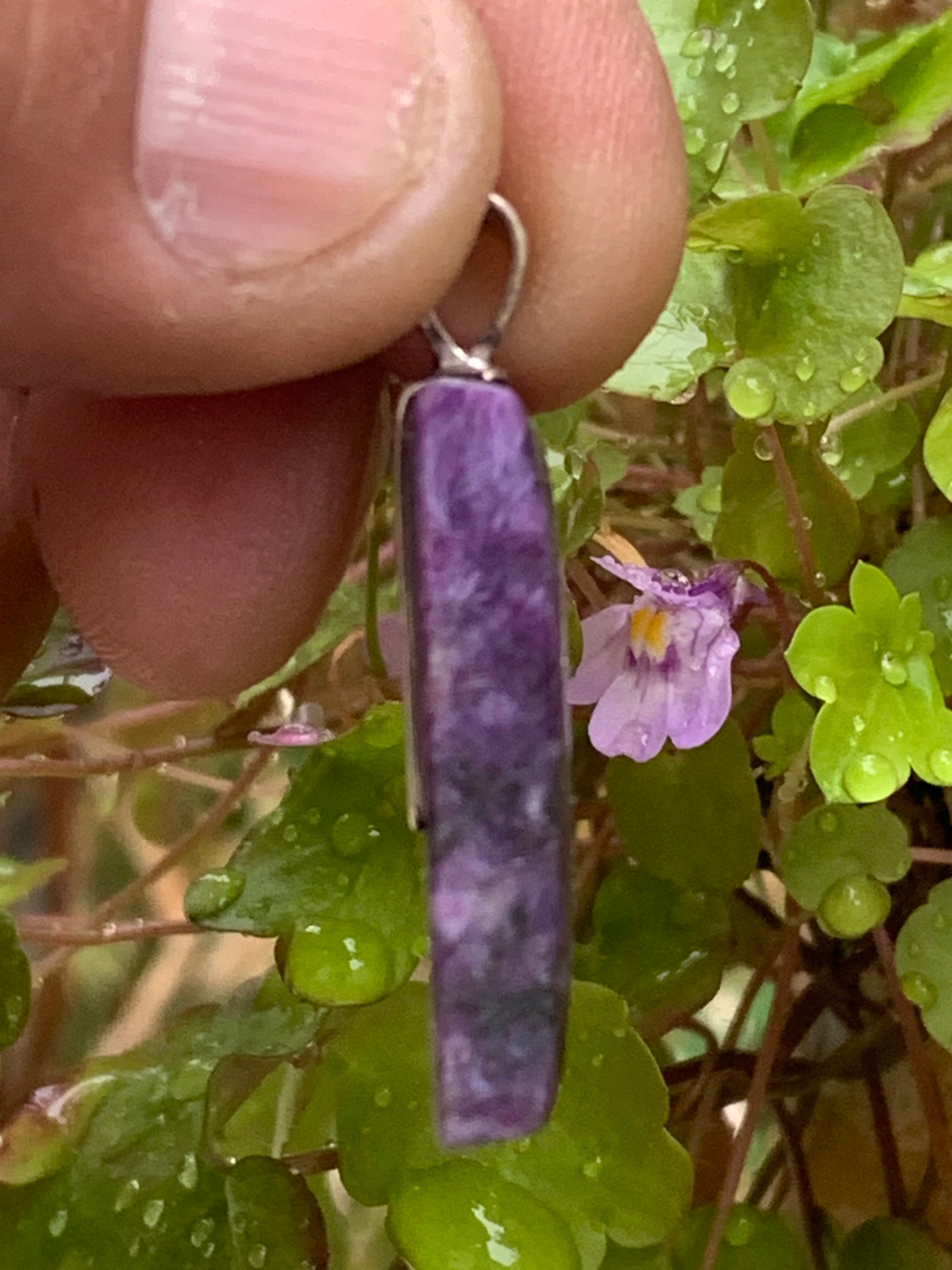Charoïte, magnifique pendentif en Argent 925 de 37mm de hauteur x 16 de largeur x 7 d'épaisseur. Vendu avec cordon réglable de couleur noire !