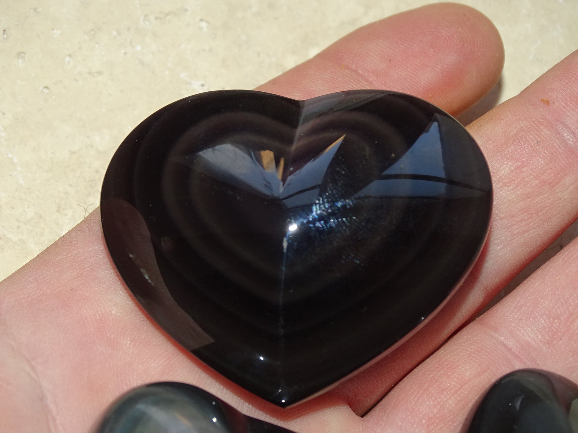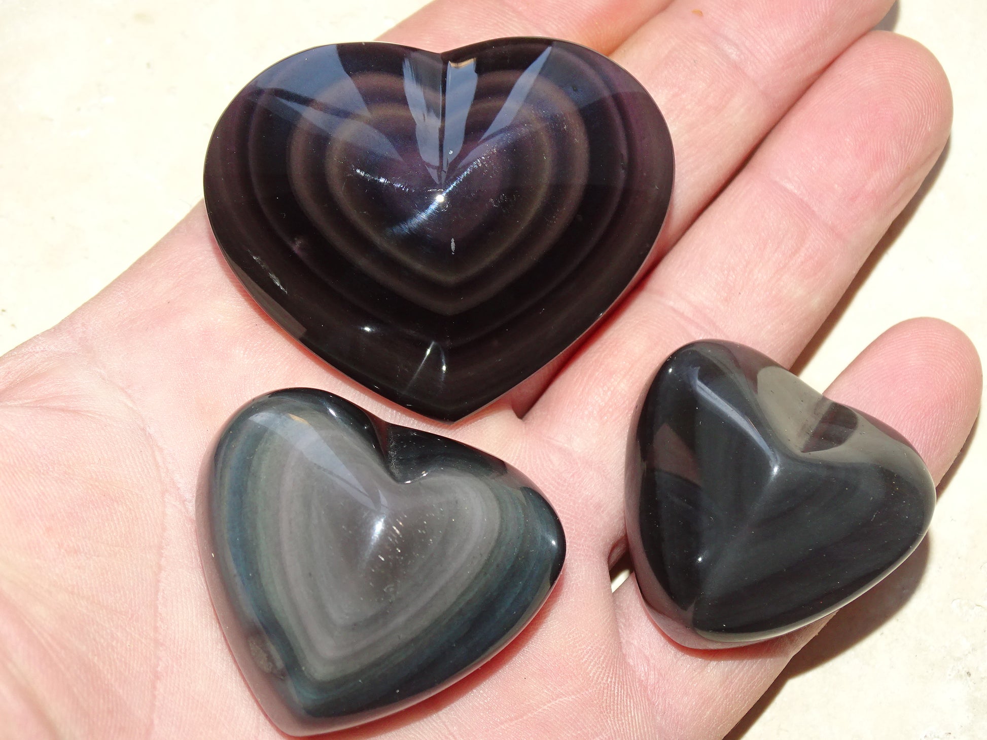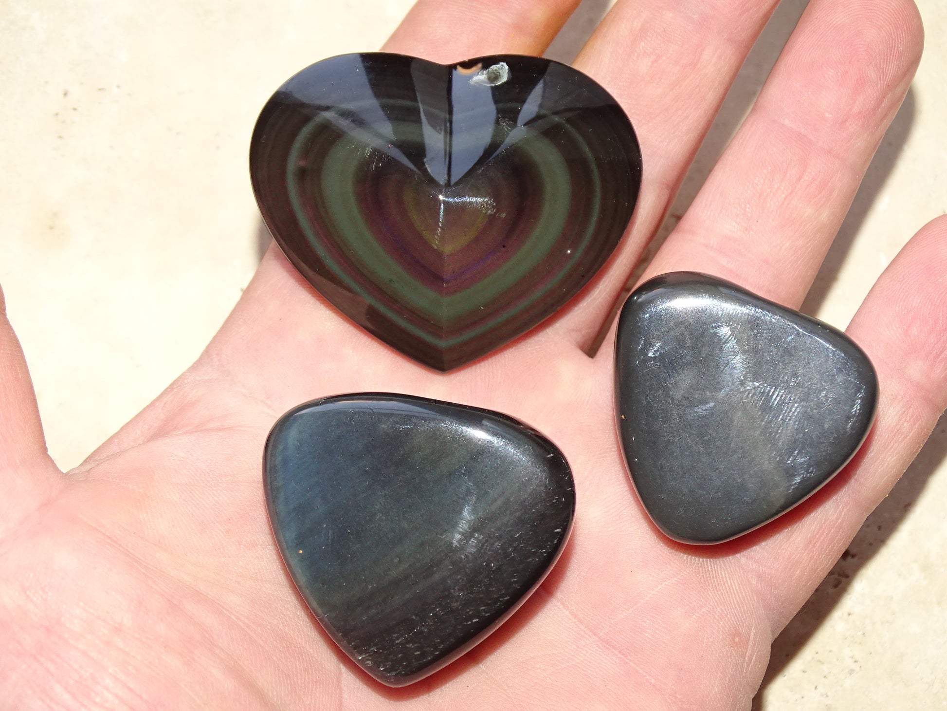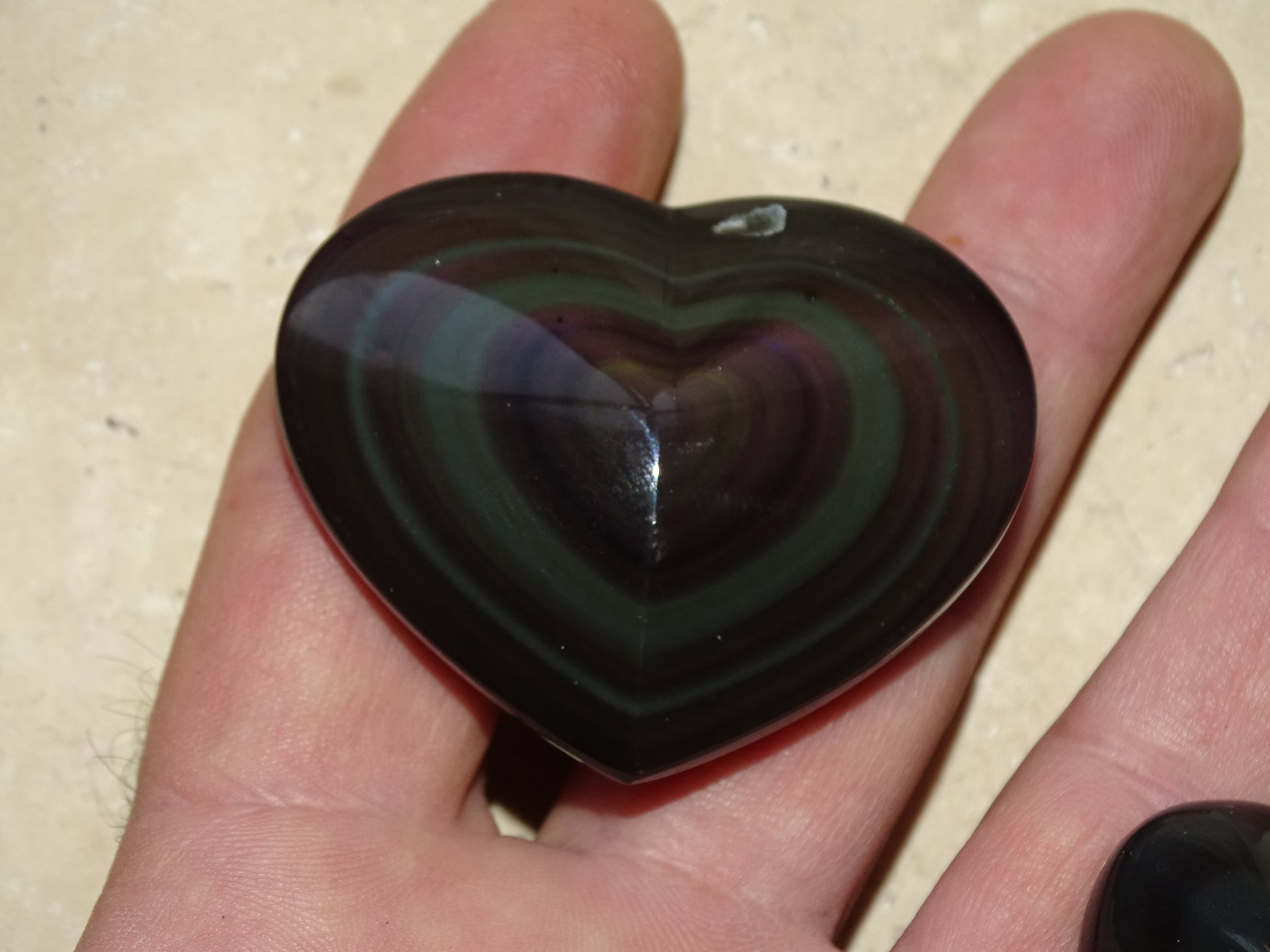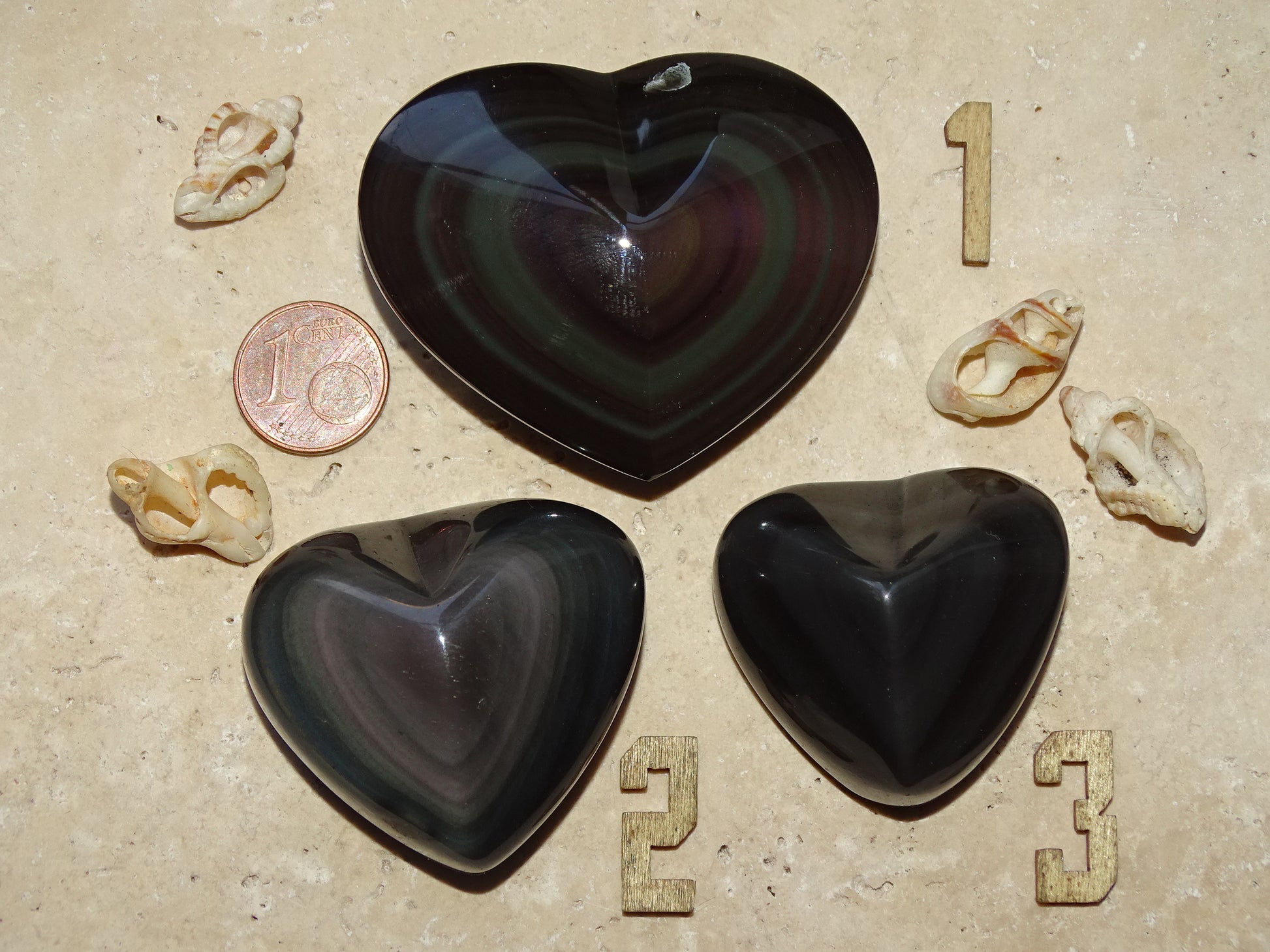 Coeur en obsidienne oeil céleste de 35 à 50 millimètres. Belles finitions, des reflets intenses, magnifiques pièces !