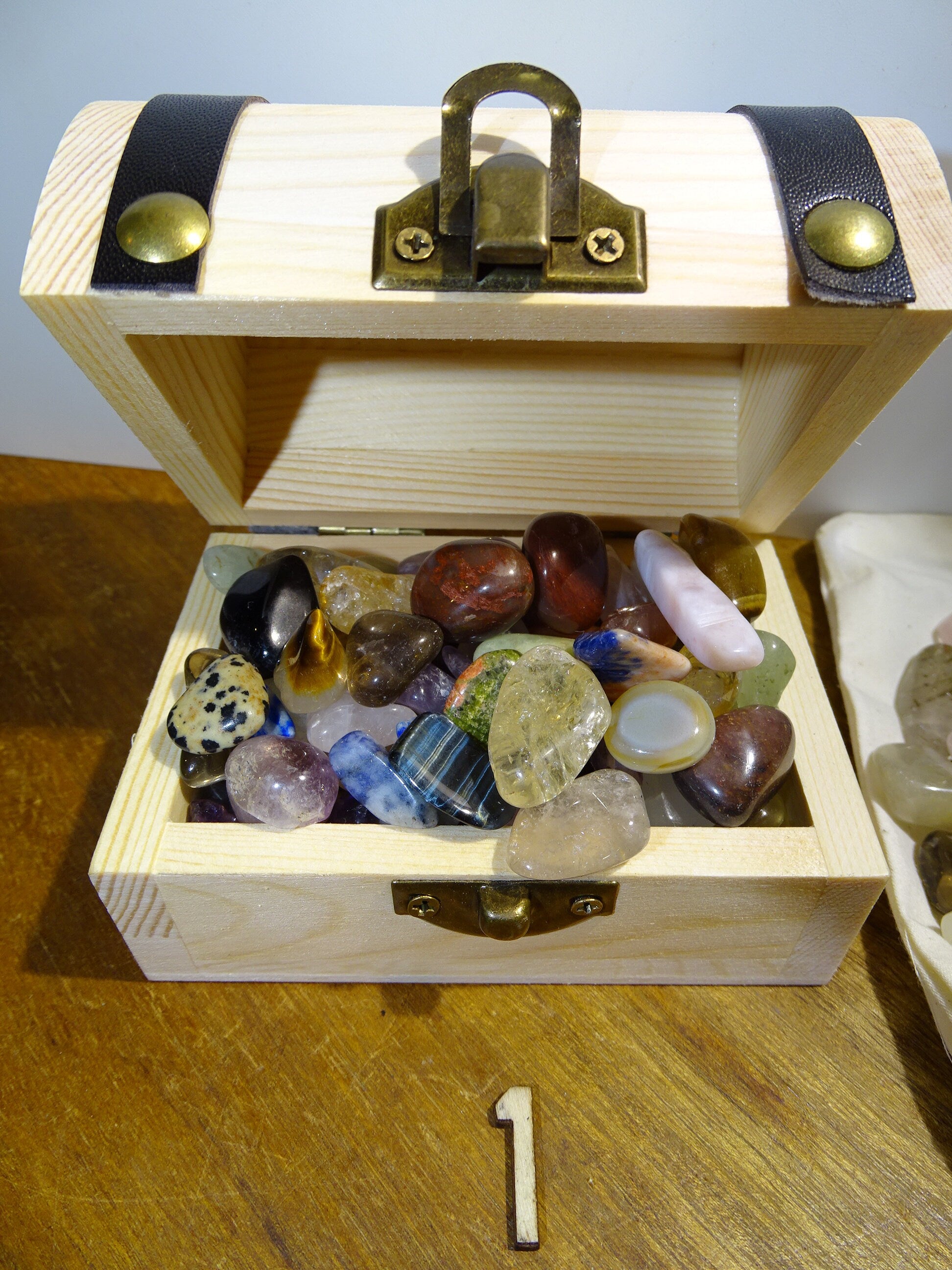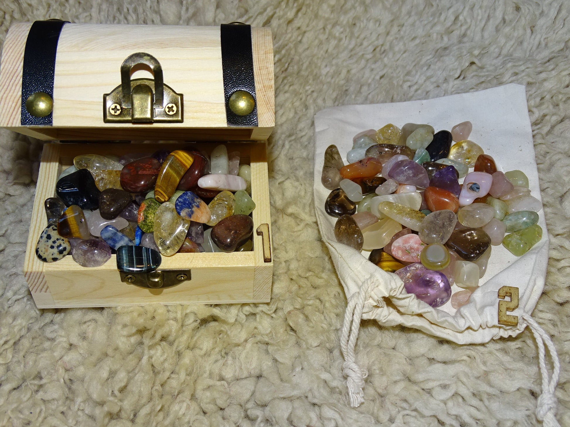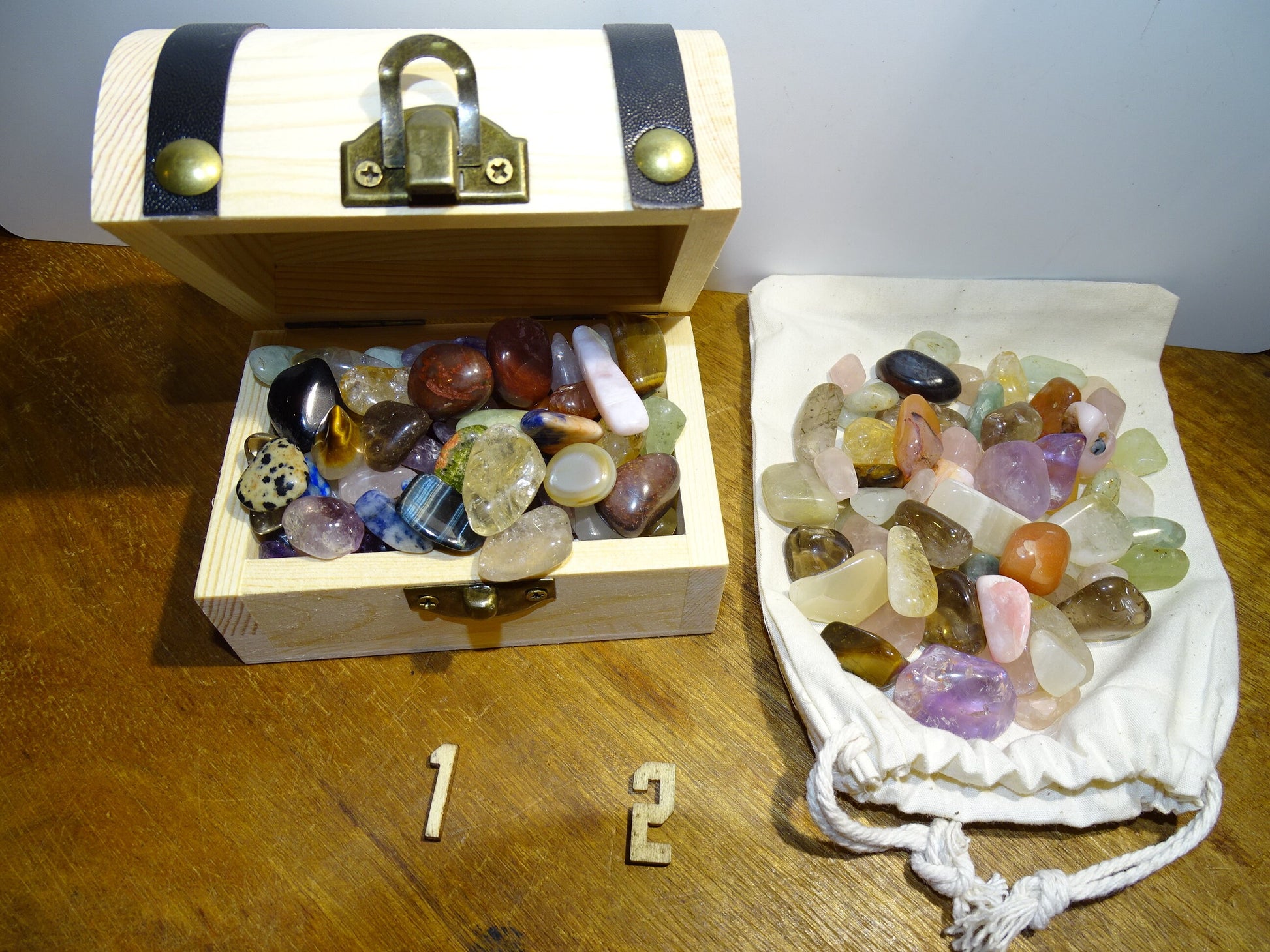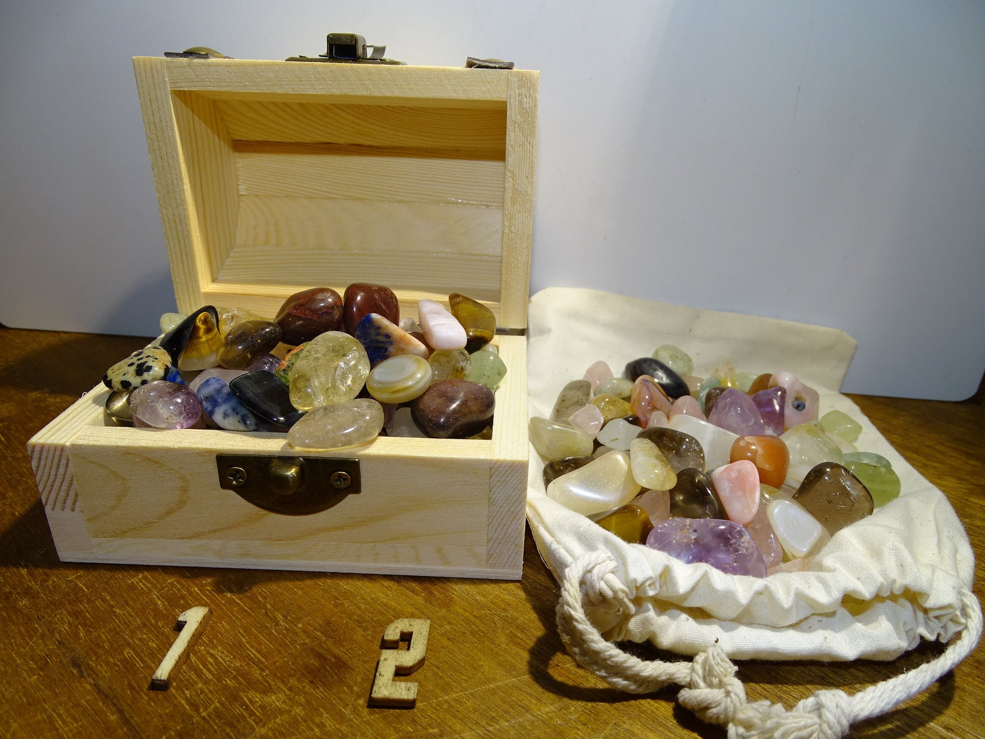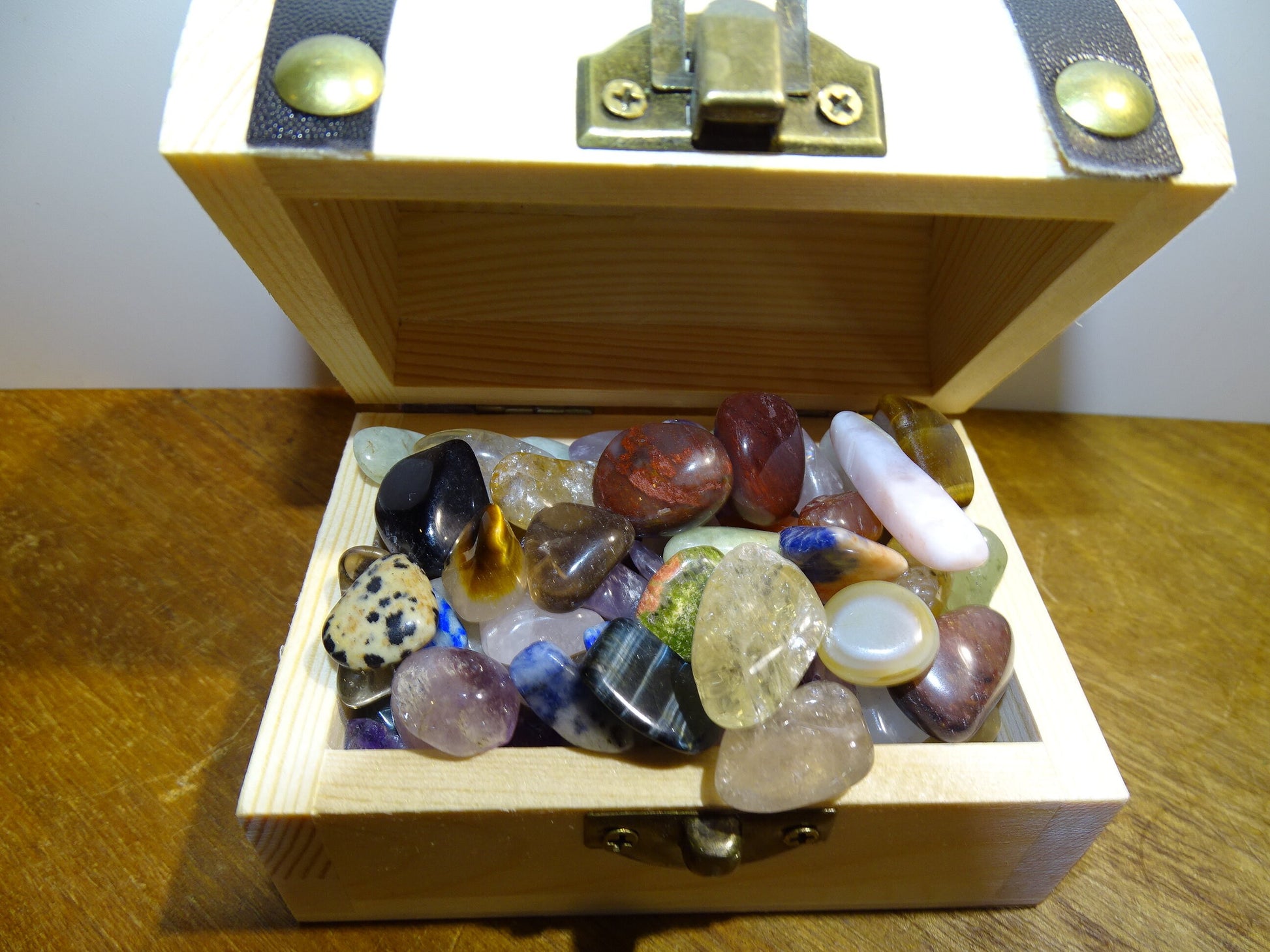 Coffre en bois vendu seul ou avec pierres semi-précieuse de qualité (100 gr. / 15 à 30 millimètres). Parfait pour commencer une collection, en cadeau, pratique et efficasse !